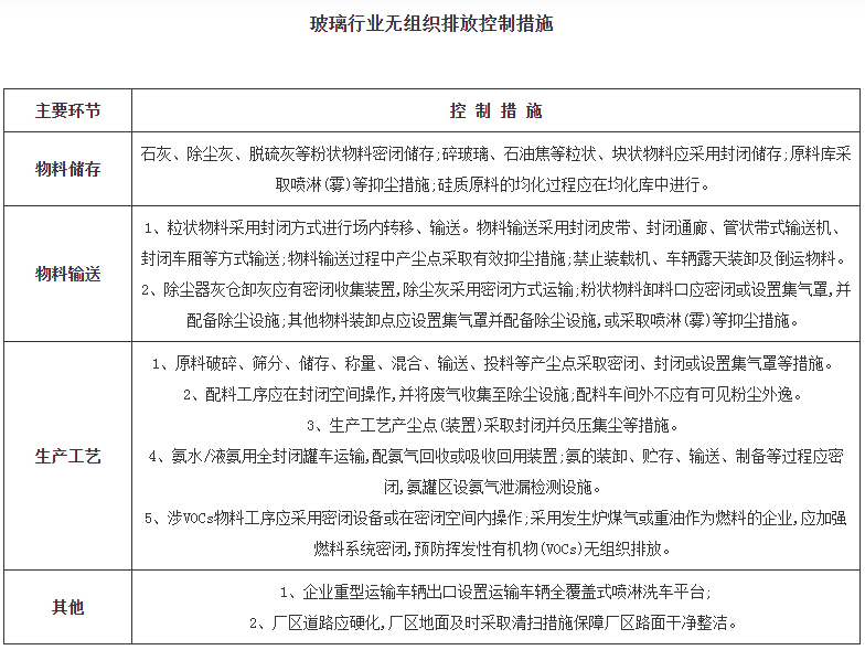 鄂環(huán)發(fā)〔2024〕12號(hào) 湖北省玻璃行業(yè)大氣環(huán)境綜合整治實(shí)施方案 為深入貫徹《中共中央 國(guó)務(wù)院關(guān)于深入打好污染防治攻堅(jiān)戰(zhàn)的意見(jiàn)》《國(guó)務(wù)院關(guān)于印發(fā)〈空氣質(zhì)量持續(xù)改善行動(dòng)計(jì)劃〉的通知》,全面落實(shí)《湖北省人民政府關(guān)于印發(fā)〈湖北省空氣質(zhì)量持續(xù)改善行動(dòng)方案〉的通知》有關(guān)要求,加快玻璃行業(yè)綠色低碳轉(zhuǎn)型升級(jí),促進(jìn)能源結(jié)構(gòu)調(diào)整,減少大氣污染物排放,切實(shí)推動(dòng)全省環(huán)境空氣質(zhì)量持續(xù)改善,結(jié)合我省實(shí)際,特制定本方案。 一、工作目標(biāo) 按照分類施策、屬地負(fù)責(zé)、分步實(shí)施的原則,開(kāi)展玻璃行業(yè)(平板玻璃、光伏壓延玻璃、日用玻璃等企業(yè))綜合整治,推動(dòng)玻璃熔窯能源清潔化改造,提升玻璃熔窯生產(chǎn)能效水平,推進(jìn)煙氣深度治理,提升行業(yè)環(huán)???jī)效水平,推動(dòng)行業(yè)綠色低碳高質(zhì)量發(fā)展。2026年底前,全省8家平板玻璃企業(yè)基本完成綜合整治工作;2028年底前,光伏壓延玻璃、日用玻璃等企業(yè)基本完成綜合整治工作(具體指標(biāo)要求見(jiàn)附件1和2)。 二、重點(diǎn)任務(wù) (一)優(yōu)化調(diào)整產(chǎn)品結(jié)構(gòu)。落實(shí)《產(chǎn)業(yè)結(jié)構(gòu)調(diào)整指導(dǎo)目錄》(2024年本),通過(guò)綜合手段依法依規(guī)淘汰落后產(chǎn)能。發(fā)揮能效、環(huán)保、質(zhì)量、安全、物耗、水耗等標(biāo)準(zhǔn)作用,引導(dǎo)能耗高、排放強(qiáng)度大的低效產(chǎn)能有序退出。加快平板玻璃產(chǎn)品的低碳化、制品化發(fā)展。鼓勵(lì)長(zhǎng)利玻璃等行業(yè)龍頭企業(yè)實(shí)施兼并重組,推動(dòng)武漢長(zhǎng)利玻璃搬遷工作。列入淘汰退出計(jì)劃的企業(yè)或設(shè)施不再要求實(shí)施提標(biāo)升級(jí)改造。 (二)提升能源清潔化水平。強(qiáng)化玻璃行業(yè)工藝升級(jí)、能源替代等綜合性措施,降低企業(yè)污染排放和碳排放強(qiáng)度,推進(jìn)重點(diǎn)企業(yè)清潔生產(chǎn)審核,2025年底前重點(diǎn)企業(yè)完成一輪清潔生產(chǎn)審核。對(duì)以石油焦、煤制氣等為主要燃料的玻璃熔窯,加快推進(jìn)天然氣、電等清潔能源替代。2026年底前,平板玻璃企業(yè)基本完成天然氣、電氣化能源改造;2028年底前,鼓勵(lì)位于天然氣管網(wǎng)覆蓋區(qū)域的日用玻璃企業(yè)完成煤氣發(fā)生爐淘汰工作,推動(dòng)玻璃行業(yè)天然氣穩(wěn)定供給。 (三)提高窯爐生產(chǎn)能效水平。通過(guò)采用玻璃熔窯全保溫、熔窯用紅外高輻射節(jié)能涂料技術(shù)、玻璃熔窯全氧燃燒以及純氧助燃工藝等途徑,提高玻璃熔窯能源利用效率,提升窯爐節(jié)能效果,優(yōu)化玻璃熔窯、錫槽、退火窯結(jié)構(gòu)和燃燒控制技術(shù),推進(jìn)電氣自動(dòng)化改進(jìn)、新能源替代技術(shù)運(yùn)用、智能工程化改造等。到2025年,玻璃行業(yè)能效標(biāo)桿水平以上產(chǎn)能比例達(dá)到20%,能效基準(zhǔn)水平以下裝備基本清零,行業(yè)節(jié)能降碳效果顯著,綠色低碳發(fā)展能力大幅增強(qiáng)。 (四)污染治理設(shè)施提標(biāo)改造。玻璃行業(yè)顆粒物治理采用靜電除塵、袋式除塵或電袋復(fù)合除塵等工藝,SO2治理采用石灰石-石膏、半干法或干法、雙堿法(需自動(dòng)加藥、pH連續(xù)監(jiān)測(cè)裝置)等脫硫工藝。平板玻璃行業(yè)NOx治理(除全氧燃燒技術(shù)、全電熔爐外)采用低氮燃燒技術(shù)+SCR等工藝,或除塵脫硝采用陶瓷一體化處理設(shè)施等工藝。平板玻璃企業(yè)需建設(shè)備用治理設(shè)施。光伏壓延、日用等玻璃企業(yè)NOx治理采用低氮燃燒技術(shù)、SNCR或SCR等技術(shù),VOCs治理采用噴淋洗滌、吸附、氧化等兩種及以上組合工藝或燃燒工藝。2026年底前,全省8家平板玻璃企業(yè)有組織排放基本達(dá)到B級(jí)及以上指標(biāo)要求;2028年底前,光伏壓延玻璃、日用玻璃等企業(yè)有組織排放基本達(dá)到B級(jí)及以上或績(jī)效引領(lǐng)指標(biāo)要求(具體指標(biāo)要求見(jiàn)附件1)。 (五)無(wú)組織排放應(yīng)收盡收。強(qiáng)化各類物料儲(chǔ)存,粉狀物料或含VOCs物料應(yīng)密閉或封閉儲(chǔ)存;碎玻璃等粒狀物料應(yīng)封閉儲(chǔ)存;石油焦等塊狀物料應(yīng)封閉或半封閉儲(chǔ)存;硅質(zhì)原料的均化過(guò)程應(yīng)在均化庫(kù)中進(jìn)行。涉VOCs物料工序應(yīng)采用密閉設(shè)備或在密閉空間內(nèi)操作。廠區(qū)內(nèi)物料運(yùn)輸采用封閉皮帶、通廊等方式輸送。轉(zhuǎn)運(yùn)應(yīng)在產(chǎn)塵點(diǎn)設(shè)置集氣罩,并配備除塵設(shè)施。氨的裝卸、貯存、輸送、制備等過(guò)程應(yīng)密閉,并采用氨氣泄漏檢測(cè)措施。禁止裝載機(jī)、車輛露天裝卸及倒運(yùn)物料。易產(chǎn)塵生產(chǎn)工序均應(yīng)在車間內(nèi)封閉式作業(yè),產(chǎn)塵點(diǎn)設(shè)置集氣罩,并配備除塵設(shè)施,車間不得有可見(jiàn)煙粉塵外逸。料場(chǎng)進(jìn)出口設(shè)置車輪清洗和車身清潔設(shè)施,對(duì)廠區(qū)地面及時(shí)采取清掃措施保障廠區(qū)路面干凈整潔。 (六)推動(dòng)大宗物料清潔運(yùn)輸