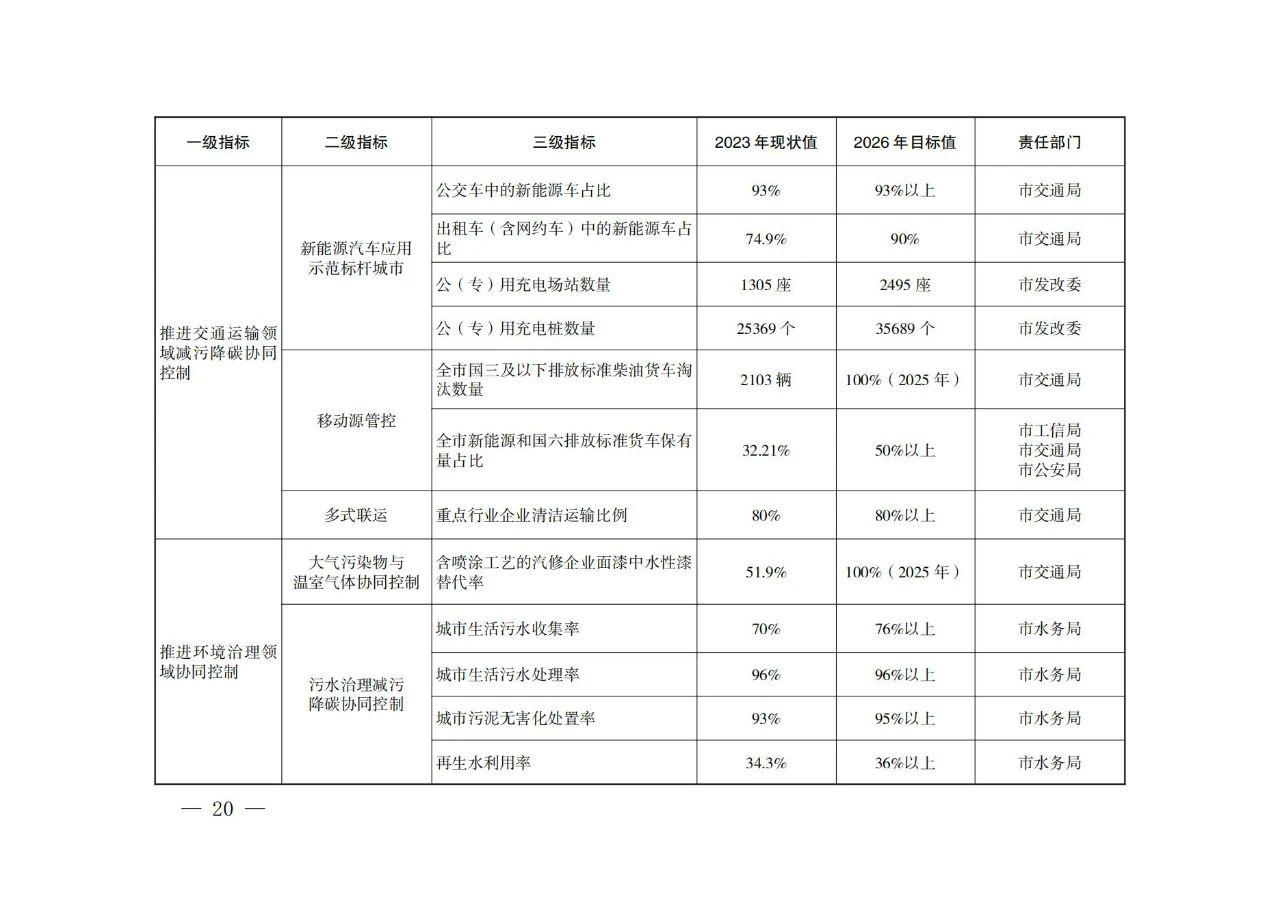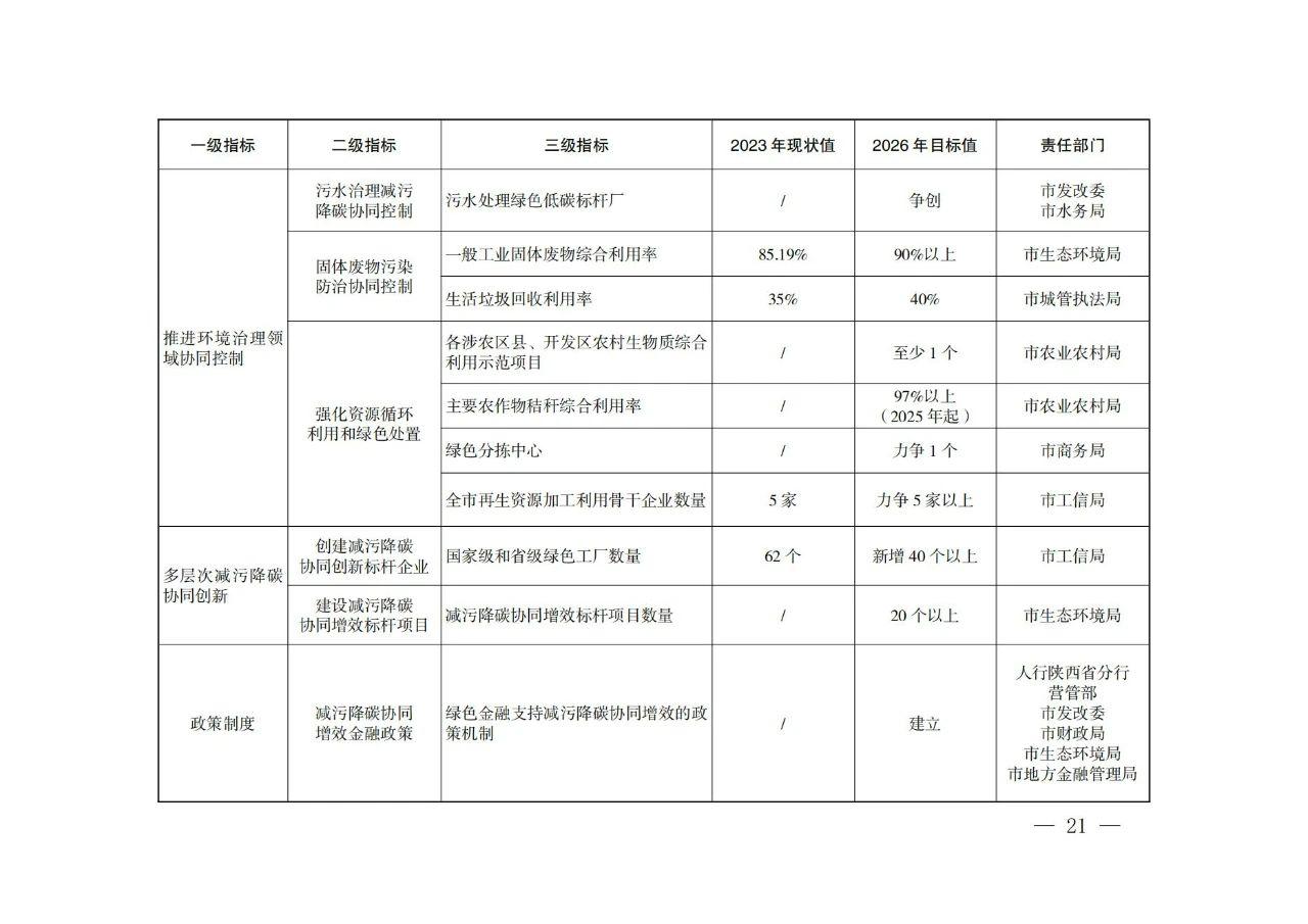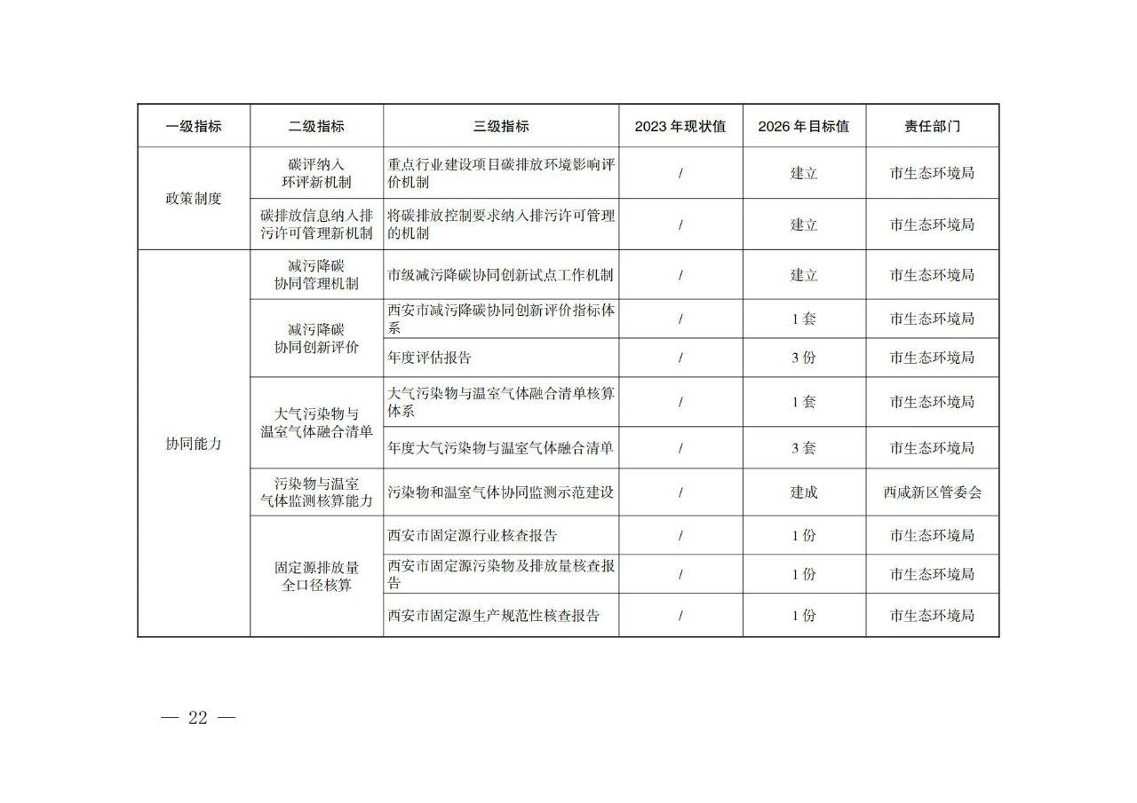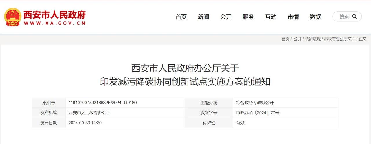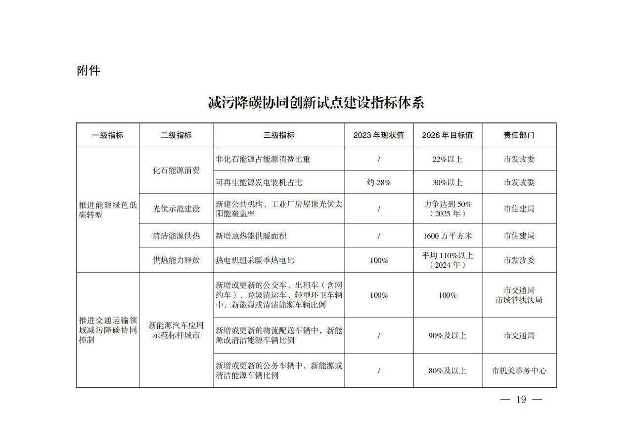 近日,西安市人民政府印發(fā)《西安市減污降碳協(xié)同創(chuàng)新試點實施方案》,方案提出: 推進能源綠色低碳轉(zhuǎn)型 (一)嚴(yán)控化石能源消費。推進能耗“雙控”向碳排放總量和強度“雙控”轉(zhuǎn)變,積極發(fā)展非化石能源,推進非化石能源安全可靠有序替代化石能源,持續(xù)優(yōu)化能源結(jié)構(gòu),加快建設(shè)新型能源體系。堅決控制化石能源消費,嚴(yán)禁新增耗煤項目和煤電(含自備電廠)裝機規(guī)模。深入推動煤炭清潔高效利用,加快現(xiàn)役煤電機組節(jié)能降碳改造、靈活性改造、供熱改造“三改聯(lián)動”。有序推進西安熱電有限公司、大唐灞橋熱電廠部分燃煤機組的關(guān)停任務(wù)??茖W(xué)控制成品油消費量,穩(wěn)妥高效利用天然氣,促進熱源低碳化。到2026年,全市可再生能源發(fā)電裝機占比提高到30%以上,非化石能源占能源消費比重達到22%以上。 (二)開展光伏示范建設(shè)。深入推進光伏在建筑中的應(yīng)用,提升全市城市建筑屋頂光伏發(fā)電裝機占比。全面實施“光伏+多場景應(yīng)用”工程,充分利用公共機構(gòu)建筑、工業(yè)廠房、“?;剡w”和保障房等屋頂資源,開展建筑屋頂光伏行動,推廣光伏發(fā)電與建筑一體化應(yīng)用。在酒店、學(xué)校和醫(yī)院等有穩(wěn)定熱水需求的公共建筑和城鄉(xiāng)低層、多層居民建筑中推廣太陽能光熱技術(shù)。開展全市“千萬工程”重點村住宅分布式光伏電站建設(shè)試點,積極推進高新區(qū)、經(jīng)開區(qū)、灞橋區(qū)光伏整縣試點區(qū)縣建設(shè)。落實智能光伏產(chǎn)業(yè)發(fā)展行動計劃,推動太陽能光伏、新型儲能電池、重點終端應(yīng)用、關(guān)鍵信息技術(shù)產(chǎn)品協(xié)同創(chuàng)新。到2025年,全市新建公共機構(gòu)、工業(yè)廠房屋頂太陽能光伏覆蓋率力爭達到50%。 (三)推動清潔能源供熱。因地制宜,科學(xué)有序建立以地?zé)崮?、污水能、空氣能、生物質(zhì)能等多能互補、分布式供熱為支撐的清潔用能保障體系。全市不再新建燃煤集中供熱站,原則上不再新建燃氣供熱站。新建居民住宅、商業(yè)綜合體等必須使用清潔化能源取暖。大力推進地?zé)崮芄犴椖拷ㄔO(shè),具備條件的新建建筑優(yōu)先采用地?zé)崮芄?。因地制宜,安全合理開發(fā)淺層地?zé)崮芄?,鼓勵開發(fā)中深層地?zé)崮芄?。鼓勵具有一定?guī)模的再生水(污水)廠周邊地區(qū),以及再生水(污水)主干管網(wǎng)沿線3公里范圍內(nèi),優(yōu)先采用再生水(污水)源熱泵系統(tǒng)供暖。到2026年,全市新增地?zé)崮芄┡娣e1600萬平方米。 (四)推進供熱能力釋放。推進熱電聯(lián)產(chǎn)、工業(yè)余熱、垃圾焚燒發(fā)電廠供熱能力釋放,提升供熱效率。挖掘陜西渭河電廠等現(xiàn)役熱電機組潛力,加快實施燃煤電廠高背壓等高效供熱方式改造。鼓勵有條件的企業(yè)開展余熱回收系統(tǒng)建設(shè),最大限度發(fā)揮工業(yè)余熱供熱能力。推動全市五個生活垃圾焚燒廠接收各區(qū)縣、開發(fā)區(qū)農(nóng)業(yè)廢棄物燃料,促進熱電聯(lián)產(chǎn)資源化利用。推進垃圾焚燒發(fā)電企業(yè)作為周邊區(qū)域供熱主要熱源之一,完成配套供熱管網(wǎng)建設(shè)。持續(xù)推進供熱管網(wǎng)保溫及智能調(diào)控改造,加快主城區(qū)熱網(wǎng)互通互聯(lián)建設(shè)。到2024年,全市熱電機組采暖季熱電比平均提升至110%以上。 西安市減污降碳協(xié)同創(chuàng)新試點實施方案 為推進西安市減污降碳協(xié)同創(chuàng)新試點建設(shè),促進城市可持續(xù)發(fā)展和綠色轉(zhuǎn)型,根據(jù)生態(tài)環(huán)境部辦公廳《城市和產(chǎn)業(yè)園區(qū)減污降碳協(xié)同創(chuàng)新試點工作方案》(環(huán)辦綜合函〔2023〕234號)和生態(tài)環(huán)境部綜合司《關(guān)于印送減污降碳協(xié)同創(chuàng)新試點任務(wù)清單的函》(綜合函〔2024〕18號)有關(guān)要求,結(jié)合我市實際,制定本方案。 一、總體要求 以習(xí)近平新時代中國特色社會主義思想為指導(dǎo),全面貫徹黨的二十大和二十屆二中、三中全會精神,深入貫徹習(xí)近平生態(tài)文明思想和習(xí)近平總書記歷次來陜考察重要講話重要指示精神,立足黃河流域生態(tài)保護和高質(zhì)量發(fā)展要求及國家中心城市特點,結(jié)合西安市用能結(jié)構(gòu)、產(chǎn)業(yè)結(jié)構(gòu)、減排空間,綜合考慮大氣污染形勢嚴(yán)峻、地形氣象條件不利等問題,以新能源應(yīng)用示范為主線,在能源、交通、工業(yè)、環(huán)境治理等重點領(lǐng)域開展減污降碳協(xié)同創(chuàng)新實踐。探索能源清潔化、產(chǎn)業(yè)綠色化、資源循環(huán)化的協(xié)同創(chuàng)新路徑,促進西安市經(jīng)濟社會發(fā)展全面綠色轉(zhuǎn)型和碳達峰碳中和目標(biāo)實現(xiàn),為建設(shè)“美麗西安”奠定基礎(chǔ),為全國同類型城市提供可復(fù)制可推廣的“西安模式”。 (一)基本原則 ——全面統(tǒng)籌,協(xié)同增效。堅持統(tǒng)籌推進與重點突破相結(jié)合,統(tǒng)籌碳達峰碳中和與生態(tài)環(huán)境保護相關(guān)工作,推動能源、交通、工業(yè)、環(huán)境治理多領(lǐng)域減污降碳協(xié)同增效,以碳達峰行動進一步深化環(huán)境治理,以環(huán)境治理助推高質(zhì)量達峰。 