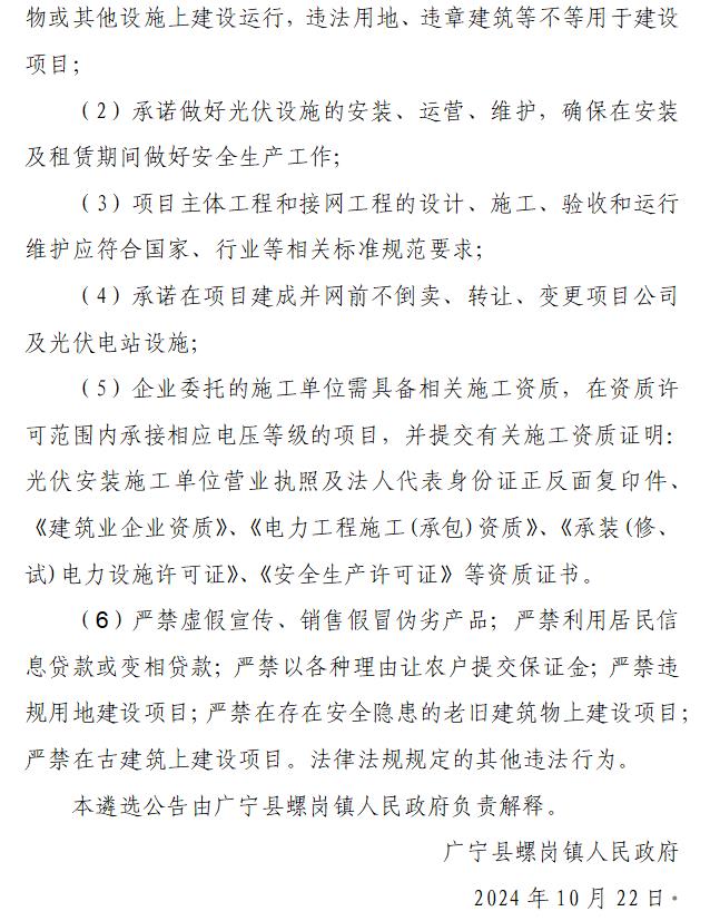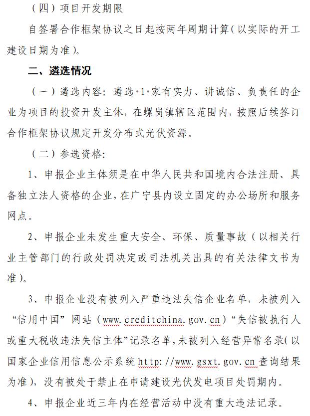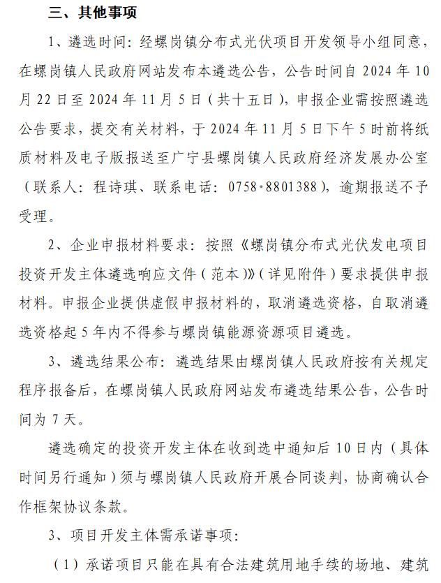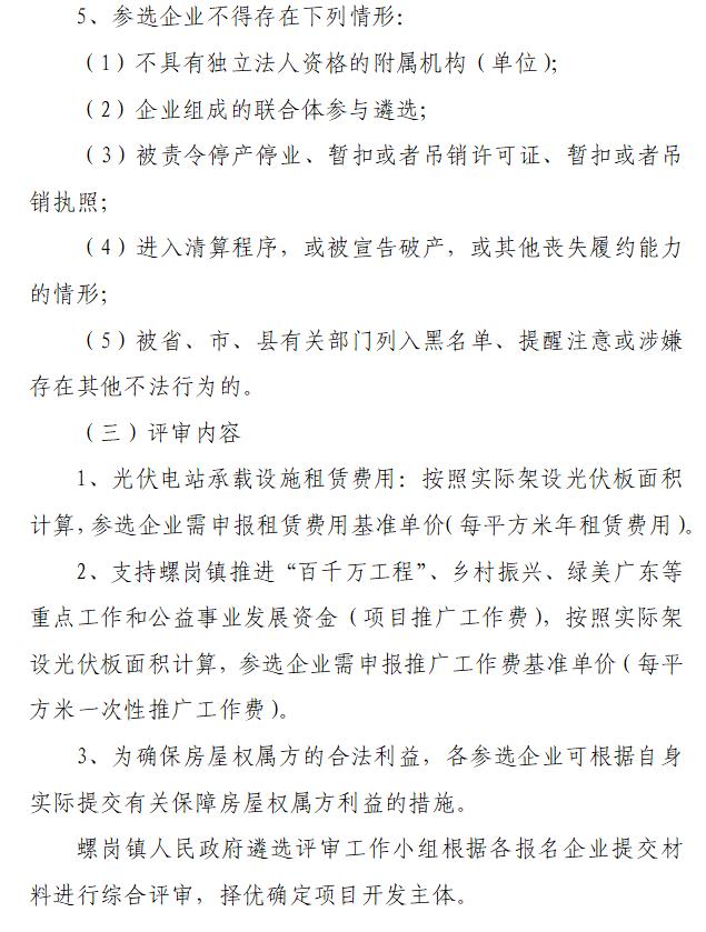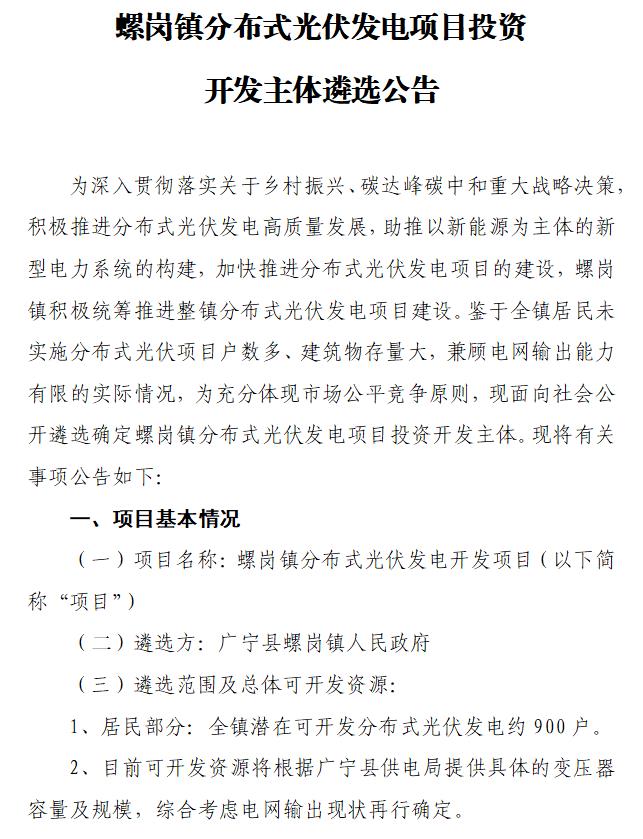 10月22日,廣東省肇慶市廣寧縣人民政府發(fā)布《關(guān)于螺崗鎮(zhèn)分布式光伏發(fā)電項(xiàng)目投資開(kāi)發(fā)主體的遴選公告》,根據(jù)公告,廣寧縣螺崗鎮(zhèn)人民政府將遴選1家有實(shí)力、講誠(chéng)信、負(fù)責(zé)任的企業(yè)為項(xiàng)目的投資開(kāi)發(fā)主體,在螺崗鎮(zhèn)轄區(qū)范圍內(nèi),按照后續(xù)簽訂合作框架協(xié)議規(guī)定開(kāi)發(fā)分布式光伏資源。目前,該鎮(zhèn)全鎮(zhèn)潛在可開(kāi)發(fā)分布式光伏發(fā)電約900戶。 遴選公告時(shí)間自2024年10月22日至2024年11月5日(共十五日),申報(bào)企業(yè)需按照遴選公告要求,提交有關(guān)材料,于2024年11月5日下午5時(shí)前將紙質(zhì)材料及電子版報(bào)送至廣寧縣螺崗鎮(zhèn)人民政府經(jīng)濟(jì)發(fā)展辦公室,逾期報(bào)送不予受理。 公告如下: