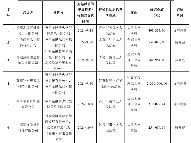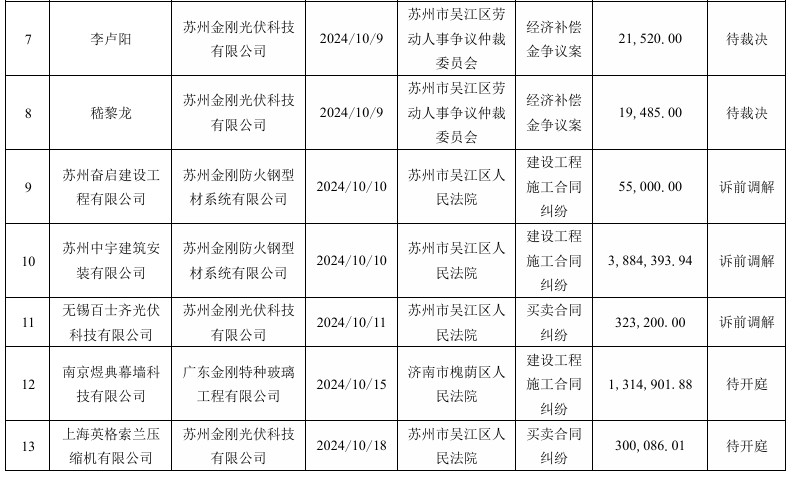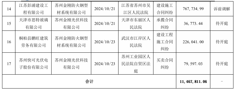 10月25日,金剛光伏發(fā)布公告稱,截至本公告披露日,公司及控股子公司新增訴訟、仲裁金額累計為人民幣 11,467,811.06 元(不含以及前期已履行披露義務的案件金額)。具體情況如下: