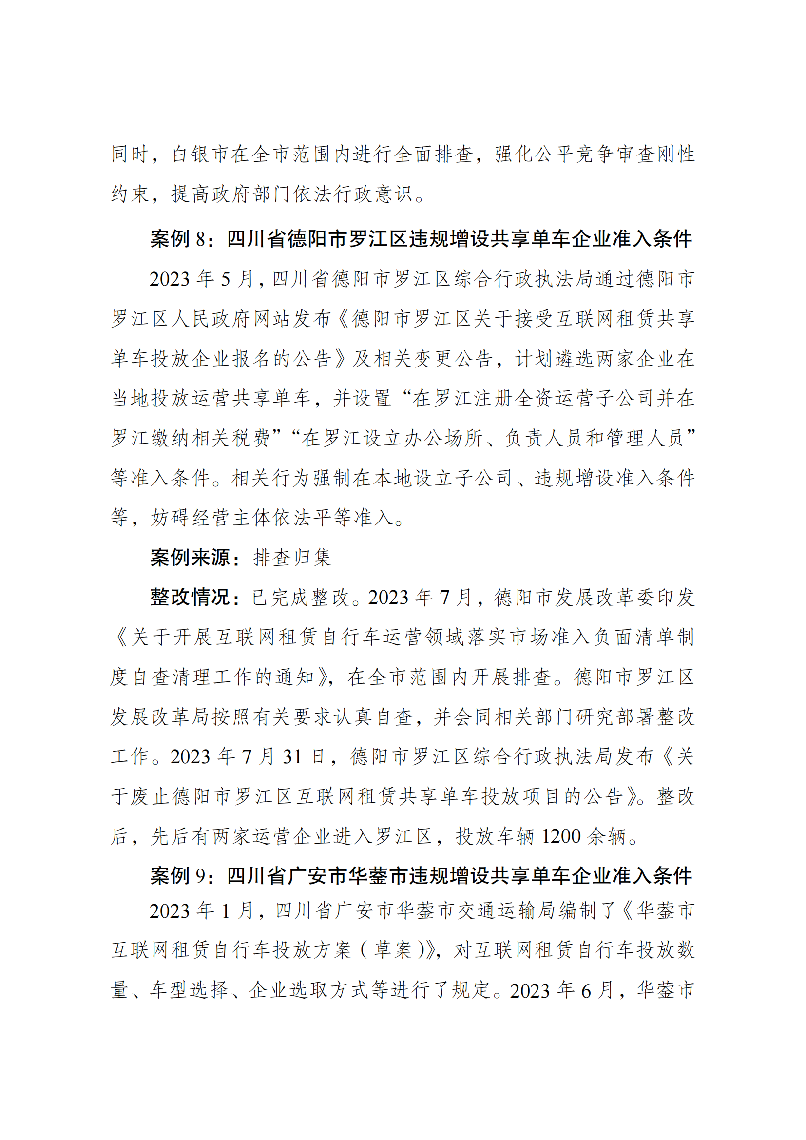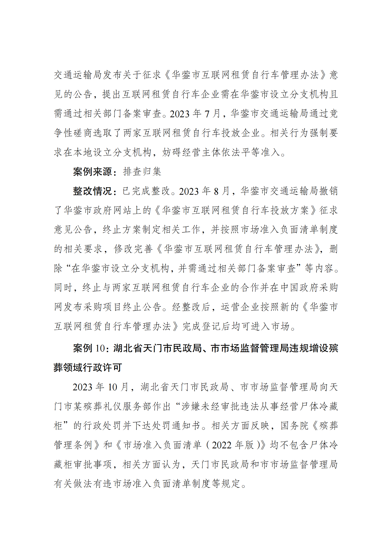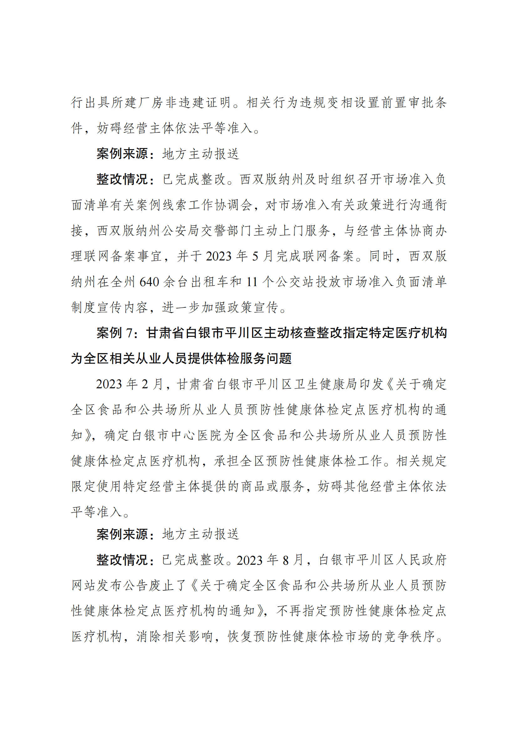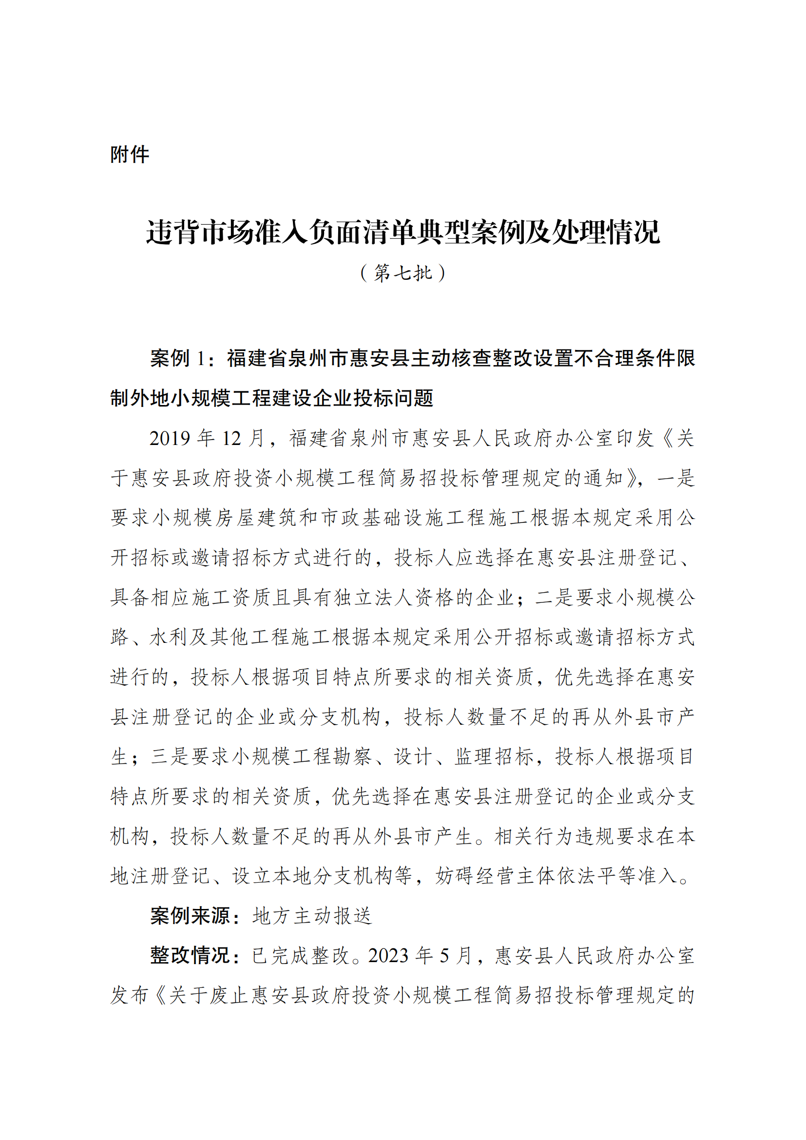 10月28日,國家發(fā)改委辦公廳對第七批違背市場準入負面清單典型案例進行通報。 詳情如下: 國家發(fā)展改革委辦公廳關(guān)于違背市場準入負面清單典型案例的通報(第七批) 發(fā)改辦體改〔2024〕837號 中央和國家機關(guān)有關(guān)部門辦公廳(辦公室、綜合司),各省、自治區(qū)、直轄市、新疆生產(chǎn)建設(shè)兵團發(fā)展改革委: 為深入貫徹《中共中央辦公廳、國務(wù)院辦公廳關(guān)于完善市場準入制度的意見》,抓好市場準入制度落實,按照《國家發(fā)展改革委關(guān)于建立違背市場準入負面清單案例歸集和通報制度的通知》要求,國家發(fā)展改革委會同有關(guān)部門、地方發(fā)展改革委對違背市場準入負面清單情況開展第七批排查清理,現(xiàn)對案例及處理情況進行通報。福建、云南、甘肅省發(fā)展改革委及福建省泉州市、漳州市、龍巖市、平潭綜合實驗區(qū),云南省楚雄州、西雙版納州,甘肅省白銀市認真落實市場準入負面清單制度規(guī)定,能夠主動發(fā)現(xiàn)、主動排查問題并及時完成問題整改,切實推動解決市場準入難題,取得良好效果,現(xiàn)予表揚。請各地區(qū)、各部門對照通報所列案例自查自糾,認真學(xué)習(xí)有關(guān)經(jīng)驗做法,充分發(fā)揮工作機制作用,大力破除市場準入壁壘,進一步健全優(yōu)化市場化、法治化、國際化一流營商環(huán)境。 附件:違背市場準入負面清單典型案例及處理情況(第七批) 國家發(fā)展改革委辦公廳 2024年10月18日