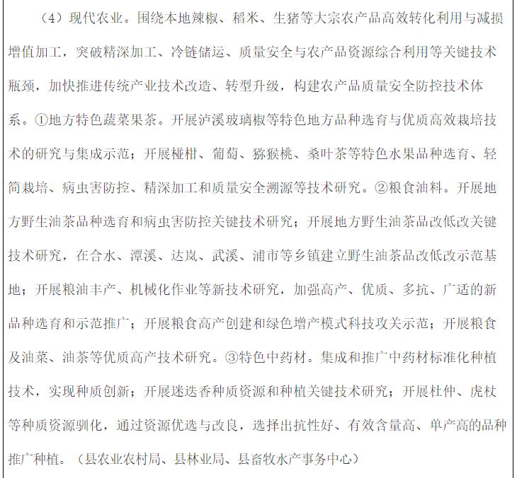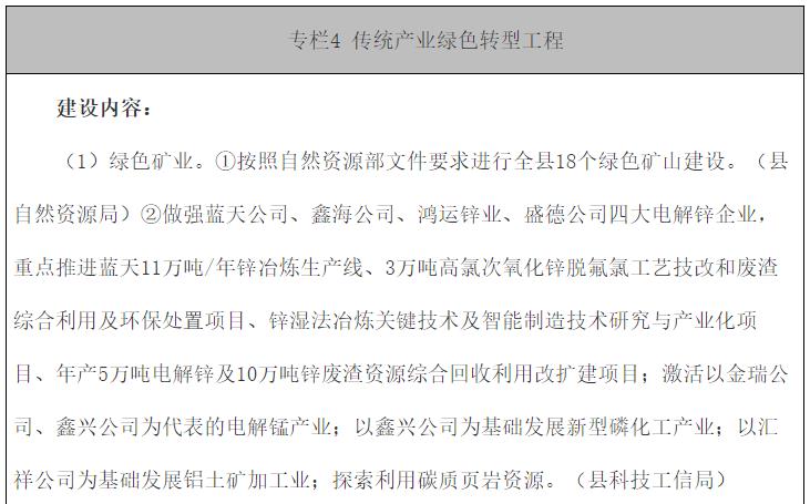 2.促進傳統(tǒng)產(chǎn)業(yè)綠色轉(zhuǎn)型升級。引導(dǎo)和支持傳統(tǒng)企業(yè)采用和推廣新技術(shù)、新材料、新工藝、先進裝備,推進產(chǎn)品結(jié)構(gòu)調(diào)整,改造現(xiàn)有生產(chǎn)設(shè)施,積極發(fā)展綠色、環(huán)保產(chǎn)品,提高企業(yè)核心競爭力。加大應(yīng)用數(shù)字化、自動化技術(shù)改造,提升傳統(tǒng)產(chǎn)業(yè)力度,推動研發(fā)設(shè)計、生產(chǎn)、流通、企業(yè)管理等環(huán)節(jié)的信息化改造升級。加快發(fā)展高端制造業(yè),開展錳鋅傳統(tǒng)產(chǎn)業(yè)科技創(chuàng)新工程,突破錳鋅精深加工關(guān)鍵技術(shù)瓶頸,開發(fā)錳鋅高端材料,推動傳統(tǒng)產(chǎn)業(yè)轉(zhuǎn)型升級和高質(zhì)量發(fā)展。依托瀘溪高新技術(shù)產(chǎn)業(yè)園區(qū),加快推進建成區(qū)內(nèi)現(xiàn)有有色金屬冶煉、鉛鋅產(chǎn)業(yè)等涉重金屬企業(yè)有序搬遷改造或依法關(guān)閉。提質(zhì)改造水泥粉磨站、砂石加工、混凝土、混凝土空心小砌塊等建材企業(yè)。優(yōu)化農(nóng)產(chǎn)品加工業(yè)、現(xiàn)代物流服務(wù)業(yè),著力構(gòu)建有瀘溪優(yōu)勢的現(xiàn)代農(nóng)業(yè)產(chǎn)業(yè)體系,促進生產(chǎn)要素優(yōu)化配置。發(fā)展地方特色蔬菜果茶、中藥材,實施“優(yōu)質(zhì)種苗”工程,打造“十大優(yōu)質(zhì)產(chǎn)業(yè)”,推動農(nóng)業(yè)產(chǎn)業(yè)特色化、優(yōu)質(zhì)化發(fā)展。開展地方野生油茶和糧食品種選育、病蟲害防控、高產(chǎn)創(chuàng)建和綠色增產(chǎn)模式技術(shù)攻關(guān),建立野生油茶品改低改示范基地。大力發(fā)展設(shè)施農(nóng)業(yè),全面推廣先進適用山區(qū)特色的農(nóng)機裝備與機械化技術(shù),不斷提高農(nóng)機裝備水平和普及應(yīng)用率。構(gòu)建農(nóng)產(chǎn)品質(zhì)量安全防控技術(shù)體系,推進農(nóng)產(chǎn)品檢測中心、鄉(xiāng)鎮(zhèn)檢測站建設(shè)。推動農(nóng)旅融合發(fā)展,大力發(fā)展農(nóng)村電子商務(wù)、智慧農(nóng)業(yè)等新業(yè)態(tài),發(fā)展壯大龍頭企業(yè)、農(nóng)民合作社、家庭農(nóng)場等新型農(nóng)業(yè)經(jīng)營主體,建設(shè)現(xiàn)代農(nóng)業(yè)園區(qū),加快構(gòu)建現(xiàn)代農(nóng)業(yè)經(jīng)營體系。提質(zhì)發(fā)展現(xiàn)代服務(wù)業(yè),大力發(fā)展現(xiàn)代商貿(mào)業(yè)、健康養(yǎng)老服務(wù)業(yè)等現(xiàn)代服務(wù)業(yè),加快培育引導(dǎo)“互聯(lián)網(wǎng)+”、現(xiàn)代金融業(yè)、電子商務(wù)、科技服務(wù)、居民和家庭服務(wù)業(yè)等新興行業(yè)和業(yè)態(tài)發(fā)展,加快構(gòu)建高效生產(chǎn)生活服務(wù)體系。到2025年,在生產(chǎn)礦山全部達到綠色礦山建設(shè)標準。全縣發(fā)展綠色食品和國家地理標志產(chǎn)品10個,建成潭溪柑橘、合水油茶、興隆場白茶3個萬畝精品園,各鄉(xiāng)鎮(zhèn)建設(shè)1個以上千畝標準園。(縣科技工信局、縣發(fā)改局、縣農(nóng)業(yè)農(nóng)村局、縣農(nóng)經(jīng)站、縣畜牧水產(chǎn)事務(wù)中心、縣自然資源局、縣商務(wù)局、州生態(tài)環(huán)境局瀘溪分局、縣文化旅游廣電局、縣林業(yè)局、縣衛(wèi)健局、縣民政局、縣殘聯(lián)、縣天橋山管理局、華瑞公司、全域旅投公司、匯金公司等按職責(zé)分工負責(zé))