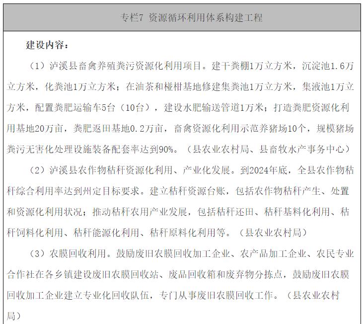 (六)推動循環(huán)經(jīng)濟發(fā)展 1.加快園區(qū)循環(huán)化改造。把資源節(jié)約、環(huán)境友好貫穿工業(yè)生產(chǎn)全過程,加快開展循環(huán)化改造,全面推進工業(yè)園區(qū)用煤企業(yè)煤改氣,小型工業(yè)鍋爐更新替代。優(yōu)化園區(qū)內(nèi)企業(yè)、產(chǎn)業(yè)和基礎(chǔ)設(shè)施空間布局,綜合運用熱電聯(lián)供和集中供熱等措施。合理延伸產(chǎn)業(yè)鏈,推進工業(yè)園區(qū)循環(huán)化改造,推動企業(yè)循環(huán)式生產(chǎn)、產(chǎn)業(yè)循環(huán)式組合,提高資源產(chǎn)出率。推動園區(qū)企業(yè)推行清潔生產(chǎn),開展節(jié)能降碳改造,加強工業(yè)生產(chǎn)用水、用能全過程管理,大力提高廢水、污水處理回用率。積極采用清污分流、閉路循環(huán)、一水多用等措施,提高水的重復(fù)利用率。實施節(jié)水技術(shù)改造,組織企業(yè)廢水處理回用成套裝置技術(shù)設(shè)備的研發(fā)。對生產(chǎn)過程中產(chǎn)生的廢液、余熱余壓實施綜合利用處理。(縣發(fā)改局、縣科技工信局、州生態(tài)環(huán)境局瀘溪分局、縣水利局、縣住建局、瀘溪高新區(qū)管委會、華瑞公司、匯金公司等按職責(zé)分工負責(zé)) 2.構(gòu)建資源循環(huán)利用體系。構(gòu)建廢舊物資和可再生資源循環(huán)利用體系,加快垃圾分類和資源化利用,對復(fù)合包裝物、電池、農(nóng)膜等低值廢棄物實行強制回收,積極引導(dǎo)資源綜合利用及廢舊回收企業(yè)做強做大。實行生產(chǎn)者責(zé)任延伸制度,推動生產(chǎn)者落實廢棄產(chǎn)品回收處理等責(zé)任。建立資源再生產(chǎn)品和原料推廣使用制度,相關(guān)原材料消耗企業(yè)要使用一定比例的資源再生產(chǎn)品。整縣推進養(yǎng)殖廢棄物資源化利用,在柑橘、葡萄、蔬菜、茶園等園藝作物集聚區(qū),建立政府、企業(yè)、社會共同參與的畜禽廢棄物資源化利用運營機制。推動秸稈農(nóng)用產(chǎn)業(yè)發(fā)展,完善農(nóng)作物秸稈資源化利用數(shù)據(jù)庫建設(shè),推動秸稈基料化、飼料化、秸稈能源化、原料化利用,提高資源化利用效率。加強廢棄農(nóng)膜回收利用,開展農(nóng)用薄膜回收利用,通過改進農(nóng)藝、回收重復(fù)利用等,減少農(nóng)膜的使用量。開展農(nóng)藥包裝廢棄物回收情況監(jiān)測調(diào)查,探索可復(fù)制、能推廣的回收模式,推進農(nóng)藥包裝廢棄物加快回收利用,引導(dǎo)專業(yè)化統(tǒng)防統(tǒng)治組織,開展農(nóng)藥包裝廢棄物回收服務(wù),探索開展肥料包裝廢棄物回收處理試點。到2025年,再生資源回收利用網(wǎng)絡(luò)體系覆蓋到全縣所有鄉(xiāng)鎮(zhèn)和行政村,形成全縣再生資源回收利用行業(yè)規(guī)范化經(jīng)營管理格局,城市生活垃圾資源化利用率完成州下達指標,重點產(chǎn)品的再生原料使用比例達到20%,廢棄產(chǎn)品規(guī)范回收與循環(huán)利用率達到50%左右,實現(xiàn)畜禽糞污資源化利用率達85%,農(nóng)作物秸稈資源化利用率達90%,農(nóng)膜回收率達到85%,農(nóng)業(yè)包裝廢棄物回收利用率達80%以上,實現(xiàn)再生資源回收利用網(wǎng)絡(luò)化、產(chǎn)業(yè)化和無害化目標。(縣住建局、縣發(fā)改局、州生態(tài)環(huán)境局瀘溪分局、縣商務(wù)局、縣科技工信局、縣農(nóng)業(yè)農(nóng)村局、縣畜牧水產(chǎn)事務(wù)中心、縣水利局、縣機關(guān)事務(wù)服務(wù)中心等按職責(zé)分工負責(zé))