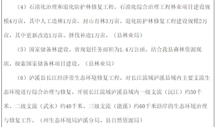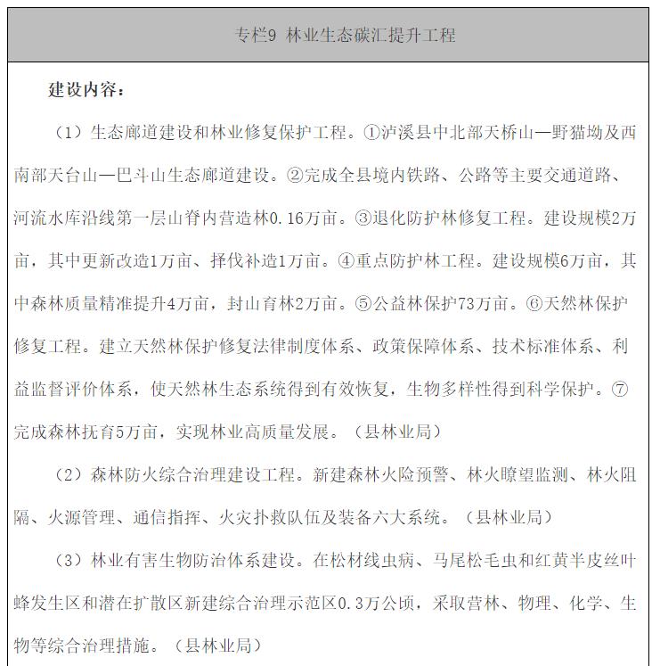 4.推動生活垃圾減量化資源化利用。實施生活垃圾分類制度,推進生活垃圾源頭減量化、資源化,推動建設(shè)分類投放、分類收集、分類運輸、分類處置的生活垃圾管理系統(tǒng)。推進農(nóng)村生活垃圾處理,鄉(xiāng)鎮(zhèn)和農(nóng)村地區(qū)發(fā)展堆肥等就近資源化、減量化或衛(wèi)生填埋的處理模式,全面禁止亂倒、亂堆、亂埋、露天焚燒垃圾行為。減少過度包裝,加強塑料污染治理,狠抓源頭防控,推廣應(yīng)用替代產(chǎn)品和模式,強化塑料廢棄物回收利用和處置,加強監(jiān)管執(zhí)法。推行綠色、無紙化辦公,倡導(dǎo)縣內(nèi)旅游、住宿等行業(yè)不主動提供一次性用品、塑料制品,堅決制止餐飲浪費行為,積極踐行“光盤行動”。推進建設(shè)瀘溪縣城市餐廚垃圾資源利用和無害化處理項目,建設(shè)餐廚垃圾收轉(zhuǎn)運系統(tǒng),新建餐廚垃圾無害化處理場。到2025年,新增垃圾分類設(shè)備1552臺(套)、垃圾轉(zhuǎn)運場(站)145處、垃圾轉(zhuǎn)運設(shè)備139臺(套),所有鄉(xiāng)鎮(zhèn)、村莊生活垃圾治理全覆蓋,村莊生活垃圾有效治理處理率達100%。(縣住建局、縣發(fā)改局、州生態(tài)環(huán)境局瀘溪分局、縣商務(wù)局、縣科技工信局、縣市場監(jiān)督管理局、縣機關(guān)事務(wù)服務(wù)中心、縣農(nóng)業(yè)農(nóng)村局、縣城管執(zhí)法局等按職責(zé)分工負責(zé)) (七)開展科技創(chuàng)新降碳 1.加快綠色低碳先進適用技術(shù)的推廣及應(yīng)用。增強新材料、新能源、生物醫(yī)藥等特色優(yōu)勢產(chǎn)業(yè)技術(shù)和節(jié)能環(huán)保技術(shù)的科技成果轉(zhuǎn)化和科技人才團隊建設(shè)。圍繞瀘溪重點科技創(chuàng)新工程,加大綠色低碳先進適用技術(shù)校企合作研究,布局引進一批技術(shù)水平領(lǐng)先、減排效果突出、減污降碳協(xié)同、示范效應(yīng)明顯的項目,同時積極開展開發(fā)現(xiàn)有的先進復(fù)合材料、金屬新材料、先進儲能材料、增材制造材料、化工新材料、綠色建筑材料、錳鋅精深加工等技術(shù)攻關(guān)。積極推進森林碳匯產(chǎn)品開發(fā),通過開展森林經(jīng)營、森林改造、經(jīng)濟林選育,使“綠水青山”的生態(tài)價值得以轉(zhuǎn)換成“金山銀山”的經(jīng)濟價值。編制碳匯開發(fā)設(shè)計文件,開展相關(guān)監(jiān)測活動。爭取進入湖南省森林碳匯交易試點縣,充分利用市場機制,擴寬林業(yè)融資渠道,引進外資項目。(縣科技工信局、縣林業(yè)局、縣教體局、縣人社局、縣市場監(jiān)督管理局、縣住建局等按職責(zé)分工負責(zé)) 2.加強創(chuàng)新能力建設(shè)和人才培養(yǎng)。聚焦綠色低碳、減污降碳等方面,圍繞我縣制造業(yè)產(chǎn)業(yè),推進創(chuàng)新平臺建設(shè),加快傳統(tǒng)產(chǎn)業(yè)和中小企業(yè)數(shù)字化轉(zhuǎn)型,著力提升高端化、智能化、綠色化水平。加強綠色低碳技術(shù)和產(chǎn)品知識產(chǎn)權(quán)保護。著力引進高水平和多學(xué)科交叉的綠色低碳領(lǐng)域技術(shù)人才,進一步壯大碳達峰人才隊伍。(縣科技工信局、縣教體局、州生態(tài)環(huán)境局瀘溪分局、縣人社局、瀘溪高新區(qū)管委會等按職責(zé)分工負責(zé)) (八)鞏固提升生態(tài)碳匯能力 1.鞏固提升林業(yè)生態(tài)系統(tǒng)碳匯。強化國土空間規(guī)劃和用途管控,設(shè)立并嚴守生態(tài)保護紅線,落實最嚴格的生態(tài)環(huán)境保護制度,助力鞏固生態(tài)系統(tǒng)碳匯能力。嚴格保護自然生態(tài)空間,夯實生態(tài)系統(tǒng)碳匯基礎(chǔ)。結(jié)合瀘溪縣的自然地理特征和生態(tài)空間特征,構(gòu)建“三山兩水——百川群峰”的生態(tài)保護格局,劃定森林最低保有量。提高森林質(zhì)量,優(yōu)化全縣森林資源結(jié)構(gòu),推進宜林荒山、疏林地、無立木林地和未成林地的綠化建設(shè),推深做實林長制,積極探索碳匯林業(yè)發(fā)展。統(tǒng)籌開展森林生態(tài)保護修復(fù)、長江流域瀘溪縣域內(nèi)主要支流生態(tài)環(huán)境綜合治理與修復(fù)工作,完成省州下達的人工造林、封山育林、森林撫育等項目指標。強化森林防火基礎(chǔ)建設(shè)和林業(yè)有害生物防控體系。全面推進歷史遺留礦山修復(fù),生態(tài)重塑,建立健全礦產(chǎn)資源開發(fā)利用與保護管理制度,全面推動綠色礦山建設(shè)。到2025年,全縣森林覆蓋率不低于58.29%,歷史遺留礦山治理率達到60%以上,森林碳密度、總碳儲量全面增長,森林質(zhì)量穩(wěn)步提升,生態(tài)狀況進一步改善,森林碳匯等生態(tài)功能和適應(yīng)氣候變化的能力不斷增強。到2030年,全縣森林覆蓋率不低于58.90%。(縣林業(yè)局、縣自然資源局、縣發(fā)改局、縣交通運輸局、州生態(tài)環(huán)境局瀘溪分局、縣水利局等按職責(zé)分工負責(zé))