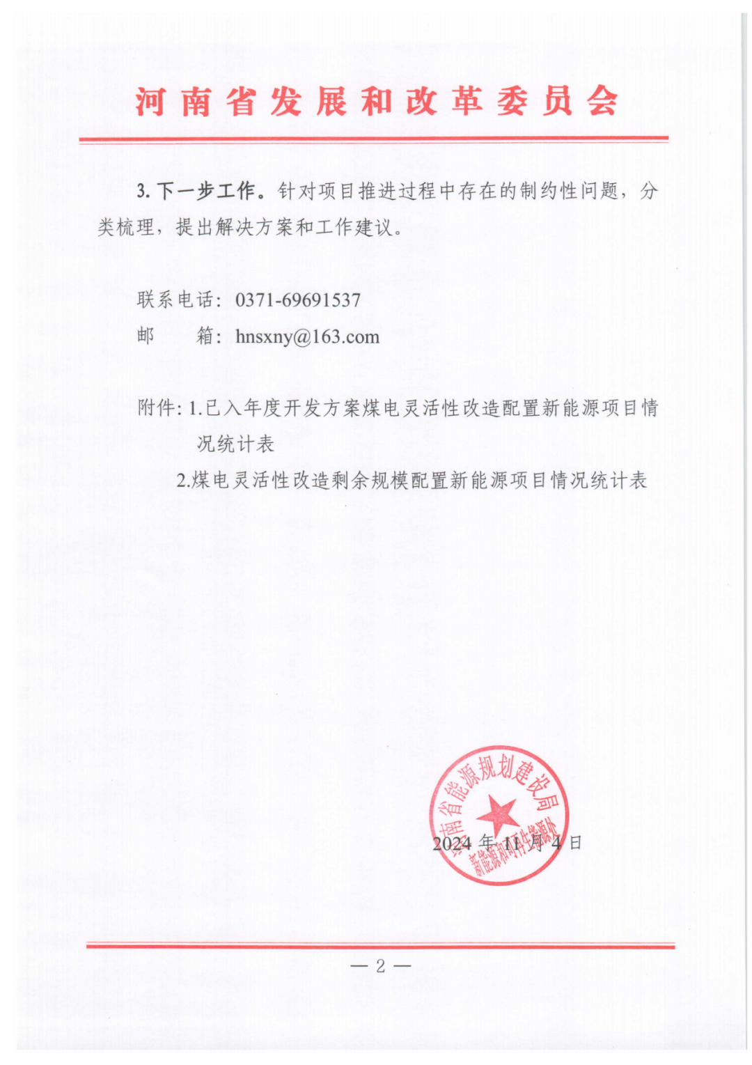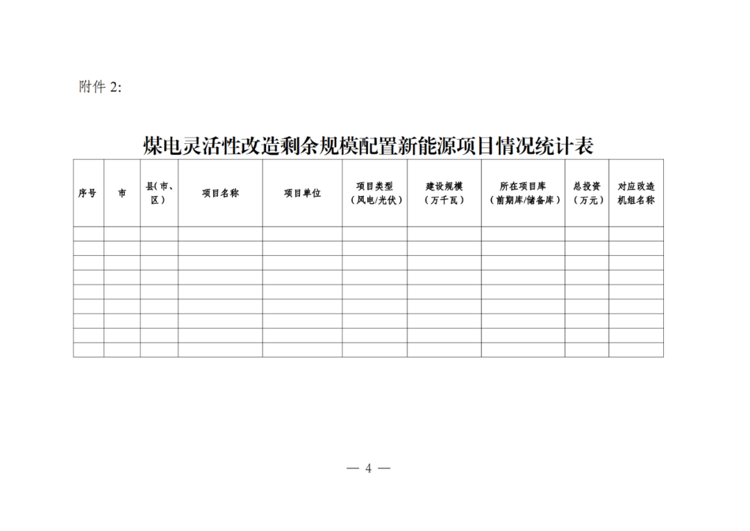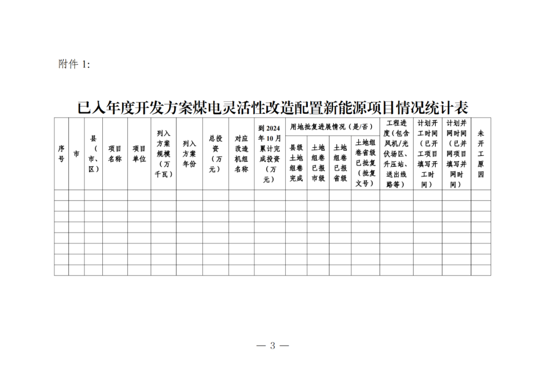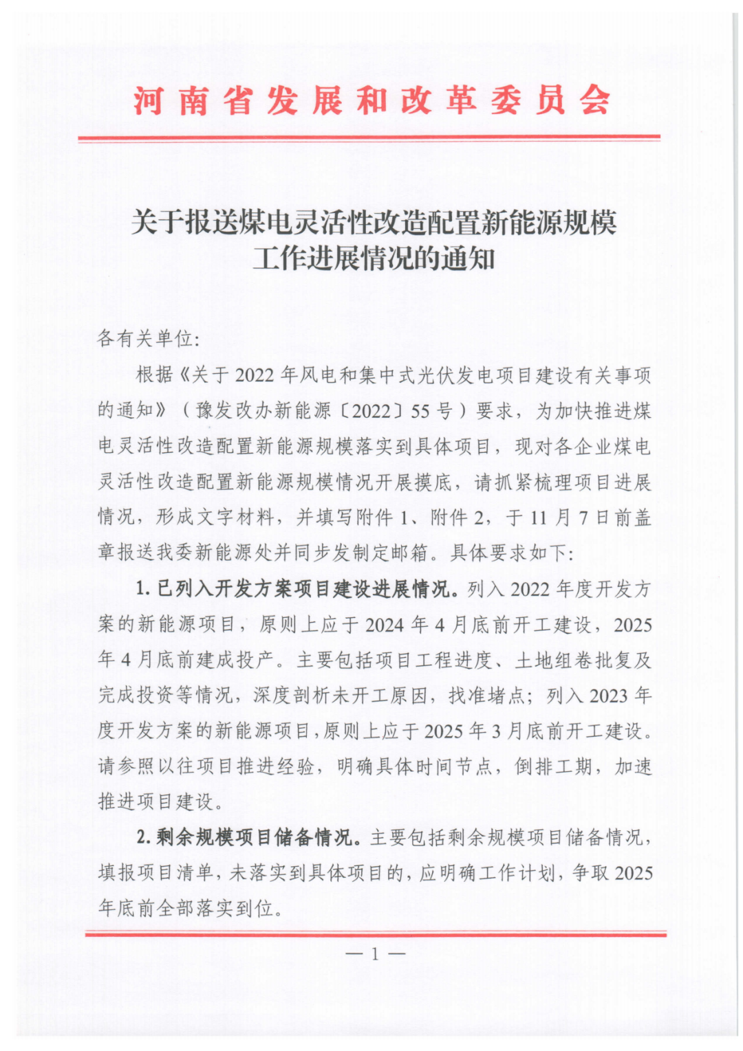 11月4日,河南發(fā)改委發(fā)布《關(guān)于報(bào)送煤電靈活性改造配置新能源規(guī)模工作進(jìn)展情況的通知》。 通知指出,為加快推進(jìn)煤電靈活性改造配置新能源規(guī)模落實(shí)到具體項(xiàng)目,現(xiàn)對(duì)各企業(yè)煤電靈活性改造配置新能源規(guī)模情況開(kāi)展摸底,請(qǐng)各有關(guān)單位抓緊梳理項(xiàng)目進(jìn)展情況,形成文字材料,并填寫附件(見(jiàn)文末),于11月7日前蓋章報(bào)送我委新能源處并同步發(fā)制定郵箱。 要求如下: 1 已列入開(kāi)發(fā)方案項(xiàng)目建設(shè)進(jìn)展情況。列入2022年度開(kāi)發(fā)方案的新能源項(xiàng)目,原則上應(yīng)于2024年4月底前開(kāi)工建設(shè),2025年4月底前建成投產(chǎn)。主要包括項(xiàng)目工程進(jìn)度、土地組卷批復(fù)及完成投資等情況,深度剖析未開(kāi)工原因,找準(zhǔn)堵點(diǎn);列入2023年度開(kāi)發(fā)方案的新能源項(xiàng)目,原則上應(yīng)于2025年3月底前開(kāi)工建設(shè)。請(qǐng)參照以往項(xiàng)目推進(jìn)經(jīng)驗(yàn),明確具體時(shí)間節(jié)點(diǎn),倒排工期,加速推進(jìn)項(xiàng)目建設(shè)。 2 剩余規(guī)模項(xiàng)目?jī)?chǔ)備情況。主要包括剩余規(guī)模項(xiàng)目?jī)?chǔ)備情況,填報(bào)項(xiàng)目清單,未落實(shí)到具體項(xiàng)目的,應(yīng)明確工作計(jì)劃,爭(zhēng)取2025年底前全部落實(shí)到位。 原文見(jiàn)下: