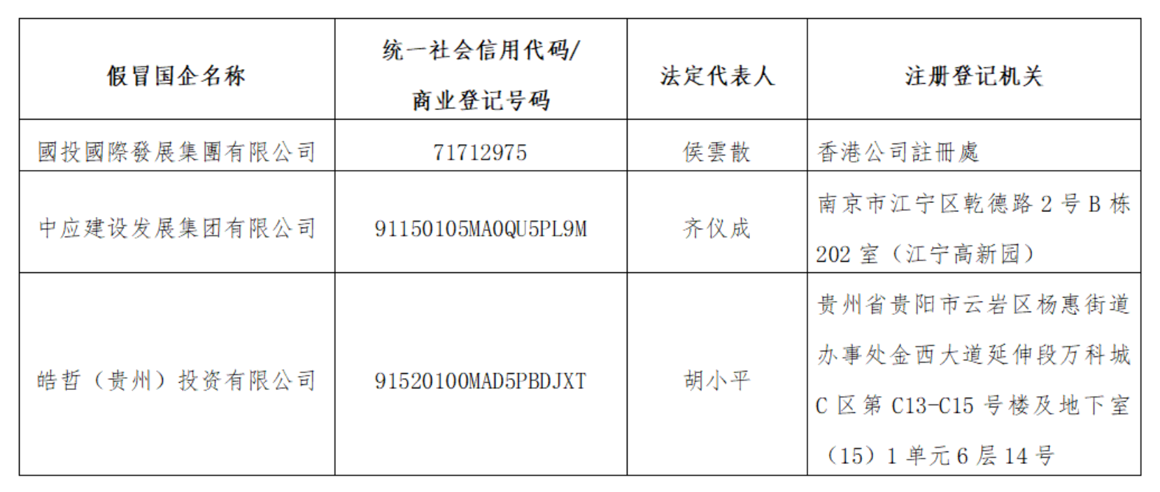 11月11日,國(guó)投集團(tuán)管委發(fā)布嚴(yán)正聲明。 國(guó)家開發(fā)投資集團(tuán)有限公司(以下簡(jiǎn)稱“我司”)成立于1995年,是中央直接管理的國(guó)有重要骨干企業(yè),2022年6月正式轉(zhuǎn)為國(guó)有資本投資公司。 近期,我司發(fā)現(xiàn)國(guó)投國(guó)際發(fā)展集團(tuán)有限公司(香港注冊(cè)登記企業(yè),以下簡(jiǎn)稱國(guó)投國(guó)際)及其下屬企業(yè)(部分企業(yè)情況見下表)假借我司名義,參與各地招商引資和商業(yè)活動(dòng)。 經(jīng)我司核實(shí),國(guó)投國(guó)際系通過偽造印章/簽字等方式,注冊(cè)登記為我司下屬企業(yè),國(guó)投國(guó)際及其在境內(nèi)投資的各級(jí)子企業(yè)均為假冒國(guó)企,與我司及關(guān)聯(lián)企業(yè)無任何隸屬或股權(quán)關(guān)系,也不存在任何投資、合作、業(yè)務(wù)等關(guān)系,其一切行為均與我司無關(guān)。 為避免廣大公眾混淆和誤認(rèn),維護(hù)我司合法權(quán)益,我司嚴(yán)正聲明如下: 1.請(qǐng)社會(huì)各界提高警惕,切勿輕易相信或參與上述假冒國(guó)企的任何活動(dòng),注意防范風(fēng)險(xiǎn),避免財(cái)產(chǎn)損失。如果發(fā)現(xiàn)違法犯罪行為,請(qǐng)盡快到公安機(jī)關(guān)報(bào)案。 2.我司將采取必要的法律措施,嚴(yán)肅追究假冒國(guó)企及相關(guān)人員的責(zé)任,堅(jiān)決維護(hù)我司的合法權(quán)益。 特此聲明! 國(guó)家開發(fā)投資集團(tuán)有限公司 2024年11月11日