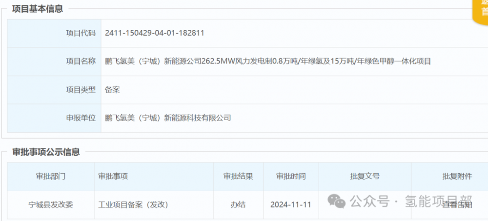 11月11日,鵬飛氫美(寧城)新能源公司262.5MW風(fēng)力發(fā)電制0.8萬(wàn)噸/年綠氫及15萬(wàn)噸/年綠色甲醇一體化項(xiàng)目獲備案。 項(xiàng)目單位:鵬飛氫美(寧城)新能源科技有限公司 建設(shè)地點(diǎn):赤峰市--寧城縣--寧城縣汐子工業(yè)園區(qū) 總投資:182000萬(wàn)元,其中 自有資金:36400 萬(wàn)元 , 申請(qǐng)銀行貸款:145600萬(wàn)元 , 其他0 萬(wàn)元 計(jì)劃建設(shè)起止年限:2024/11至2026/11 建設(shè)規(guī)模及內(nèi)容:本項(xiàng)目為制綠氫及綠甲醇部分。新建電解水制氫和綠氫配合生物質(zhì)氣化制綠色甲醇廠區(qū)一處。綠氫生產(chǎn)規(guī)模為8000噸/年,綠色甲醇生產(chǎn)規(guī)模為15萬(wàn)噸/年。項(xiàng)目總占地面積550畝??偨ㄖ娣e160629平方米,其中新建廠房80829平方米,庫(kù)房480平方米,生活用房8730平方米,配套設(shè)施用房1750平方米。購(gòu)置安裝水電解制氫裝置和綠氫配合生物質(zhì)氣化制綠甲醇裝置設(shè)備共160臺(tái)(套)。配套供水、排水、供電、硬化、綠化等附屬設(shè)施。電解水制氫工藝流程:外購(gòu)原料(水)→水電解制氫→氫氣貯罐→氫氣壓縮→氫氣充裝站。生物質(zhì)氣化制綠色甲醇工藝流程:外購(gòu)原料(生物質(zhì)顆粒)→氣化裝置→變換→低溫甲醇洗→(氫氣貯罐→氫氣增壓)甲醇合成氣壓縮→甲醇合成→甲醇精餾→甲醇罐區(qū)→汽車(chē)裝卸站。