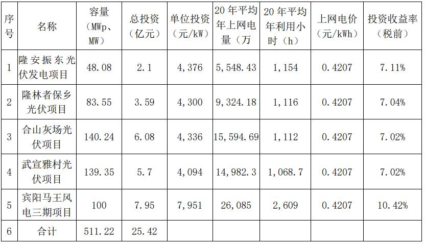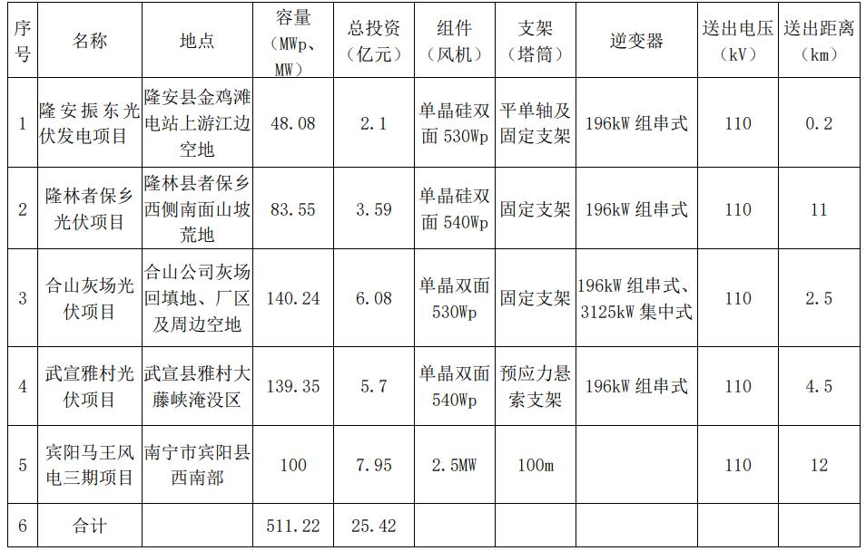 9月29日晚,廣西桂冠電力股份有限公司(簡稱“桂冠電力”)發(fā)布公告稱,公司計劃投資建設(shè)廣西隆安振東光伏發(fā)電項目、廣西隆林縣者保鄉(xiāng)光伏項目、廣西合山公司灰場光伏項目、廣西武宣縣雅村光伏項目和廣西賓陽馬王風(fēng)電三期項目。上述項目總裝機(jī)容量511.22MW,累計總投資額約25.42億元,資金來源為資本金 30%,銀行貸款70%。 根據(jù)公告,廣西隆安振東光伏發(fā)電項目由公司控股子公司橫縣江南發(fā)電有限公司投資建設(shè),廣西隆林縣者保鄉(xiāng)光伏項目由公司控股子公司廣西平班水電開發(fā)有限公司投資建設(shè),廣西合山公司灰場光伏項目由公司全資子公司龍灘水電開發(fā)有限公司投資建設(shè),廣西武宣縣雅村光伏項目由公司控股子公司廣西桂冠開投電力有限責(zé)任公司投資建設(shè),廣西賓陽馬王風(fēng)電三期項目由公司全資子公司廣西大唐桂冠新能源有限公司投資建設(shè)。 各項目主要投資建設(shè)內(nèi)容如下: 廣西隆安振東光伏發(fā)電項目、廣西隆林縣者保鄉(xiāng)光伏項目、廣西合山公司灰場光伏項目、廣西武宣縣雅村光伏項目建設(shè)期約 4-6 個月,廣西賓陽馬王風(fēng)電三期項目建設(shè)期約12個月。 桂冠電力稱,電站建成后自持營運,所發(fā)電量由廣西電網(wǎng)全額消納,經(jīng)測算,各項目二十年運行期相應(yīng)的項目投資財務(wù)內(nèi)部收益率(稅前)超過7%,具有較好的盈利能力。