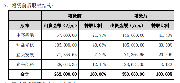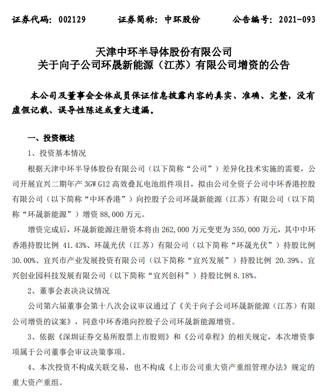 9月30日,中環(huán)股份公告,為開展宜興二期年產(chǎn)3GW G12高效疊瓦電池組件項(xiàng)目,擬由公司全資子公司中環(huán)香港控股有限公司向控股子公司環(huán)晟新能源(江蘇)有限公司增資8.8億元,公告內(nèi)容如下: 關(guān)于向子公司環(huán)晟新能源(江蘇)有限公司增資的公告 本公司及董事會(huì)全體成員保證信息披露內(nèi)容的真實(shí)、準(zhǔn)確、完整,沒有虛假記載、誤導(dǎo)性陳述或重大遺漏。 一、投資概述 1、投資基本情況 根據(jù)天津中環(huán)半導(dǎo)體股份有限公司(以下簡(jiǎn)稱“公司”)差異化技術(shù)實(shí)施的需要,公司開展宜興二期年產(chǎn) 3GW G12 高效疊瓦電池組件項(xiàng)目,擬由公司全資子公司中環(huán)香港控股有限公司(以下簡(jiǎn)稱“中環(huán)香港”)向控股子公司環(huán)晟新能源(江蘇)有限公司(以下簡(jiǎn)稱“環(huán)晟新能源”)增資 88,000 萬元。 增資完成后,環(huán)晟新能源注冊(cè)資本將由 262,000 萬元變更為 350,000 萬元,其中中環(huán) 香港持股比例 41.43%、環(huán)晟光伏(江蘇)有限公司(以下簡(jiǎn)稱“環(huán)晟光伏”)持股比例30.00%、宜興市產(chǎn)業(yè)發(fā)展投資有限公司(以下簡(jiǎn)稱“宜興發(fā)展”)持股比例 20.39%、宜興創(chuàng)業(yè)園科技發(fā)展有限公司(以下簡(jiǎn)稱“宜興創(chuàng)科”)持股比例 8.18%。 2、董事會(huì)表決決議情況 公司第六屆董事會(huì)第十八次會(huì)議審議通過了《關(guān)于向子公司環(huán)晟新能源(江蘇)有限公司增資的議案》,同意中環(huán)香港向控股子公司環(huán)晟新能源增資。 3、依據(jù)《深圳證券交易所股票上市股則》和《公司章程》的相關(guān)規(guī)定,本次增資事項(xiàng)屬于公司董事會(huì)審議決策事項(xiàng)。 4、本次投資不構(gòu)成關(guān)聯(lián)交易,也不構(gòu)成《上市公司重大資產(chǎn)重組管理辦法》規(guī)定的重大資產(chǎn)重組。 二、投資標(biāo)的情況 1、公司名稱:環(huán)晟新能源(江蘇)有限公司 2、住所:江蘇省宜興經(jīng)濟(jì)技術(shù)開發(fā)區(qū)邊莊村路西 3、法定代表人:王巖 4、注冊(cè)資本:262,000 萬元 5、經(jīng)營(yíng)范圍:許可項(xiàng)目:貨物進(jìn)出口;技術(shù)進(jìn)出口;進(jìn)出口代理(依法須經(jīng)批準(zhǔn)的項(xiàng)目,經(jīng)相關(guān)部門批準(zhǔn)后方可開展經(jīng)營(yíng)活動(dòng),具體經(jīng)營(yíng)項(xiàng)目以審批結(jié)果為準(zhǔn))一般項(xiàng)目:光伏設(shè)備及元器件制造;光伏設(shè)備及元器件銷售;技術(shù)服務(wù)、技術(shù)開發(fā)、技術(shù)咨詢、技術(shù)交流、技術(shù)轉(zhuǎn)讓、技術(shù)推廣(除依法須經(jīng)批準(zhǔn)的項(xiàng)目外,憑營(yíng)業(yè)執(zhí)照依法自主開展經(jīng)營(yíng)活動(dòng))。 6、最近一年一期的主要財(cái)務(wù)數(shù)據(jù):截至 2020 年 12 月 31 日,總資產(chǎn) 226,055.20 萬 元,總負(fù)債 24,690.96 萬元,凈資產(chǎn) 201,364.24 萬元;2020 年度實(shí)現(xiàn)營(yíng)業(yè)收入 41,459.93 萬元,凈利潤(rùn) 1,364.24 萬元(經(jīng)審計(jì))。截至 2021 年 6 月 30 日,資產(chǎn)總額為 337,323.08 萬元,負(fù)債總額為 85,155.70 萬元,凈資產(chǎn)為 252,167.38 萬元;2021 年 1-6 月實(shí)現(xiàn)營(yíng)業(yè) 收入為 115,087.00 萬元,凈利潤(rùn) 2,001.65 萬元(未經(jīng)審計(jì))。 8、環(huán)晟新能源不是失信被執(zhí)行人。 三、定價(jià)依據(jù)及增資方式 本次公司全資子公司中環(huán)香港以自有資金向環(huán)晟新能源增資 88,000 萬元,增資完成 后,環(huán)晟新能源注冊(cè)資本將由 262,000 萬元變更為 350,000 萬元,其中中環(huán)香港持股比例由 21.75%變?yōu)?41.43%、環(huán)晟光伏持股比例由 40.08%變?yōu)?30.00%、宜興發(fā)展持股比例由27.24%變?yōu)?20.39%、宜興創(chuàng)科持股比例由 12.13%變?yōu)?8.18%。 四、對(duì)外投資的目的、存在的風(fēng)險(xiǎn)和對(duì)公司的影響 1、本次增資是根據(jù)差異化疊瓦組件技術(shù)實(shí)施的需要,將公司 G12 硅片技術(shù)優(yōu)勢(shì)與疊 瓦組件技術(shù)優(yōu)勢(shì)相結(jié)合,提升產(chǎn)品轉(zhuǎn)換效率、降低制造成本,服務(wù)行業(yè)客戶。 2、投資建設(shè) G12 疊瓦太陽能電池組件智慧工廠項(xiàng)目,有利于光伏行業(yè)提效降本,提 升光伏發(fā)電對(duì)其他能源形式的競(jìng)爭(zhēng)力,推動(dòng)人與自然和諧共生的環(huán)境友好。 3、本次投資不會(huì)對(duì)本公司財(cái)務(wù)及經(jīng)營(yíng)狀況產(chǎn)生不利影響,不存在損害公司及全體股東利益的情形。 4、公司將按照《中華人民共和國證券法》、《上市公司信息披露管理辦法》等有關(guān)法律、法規(guī)、規(guī)范性文件和深圳證券交易所有關(guān)規(guī)定,及時(shí)履行信息披露義務(wù),敬請(qǐng)廣大投資者注意投資風(fēng)險(xiǎn)。 五、備查文件 第六屆董事會(huì)第十八次會(huì)議決議。 特此公告 天津中環(huán)半導(dǎo)體股份有限公司董事會(huì)