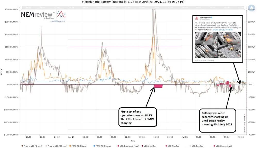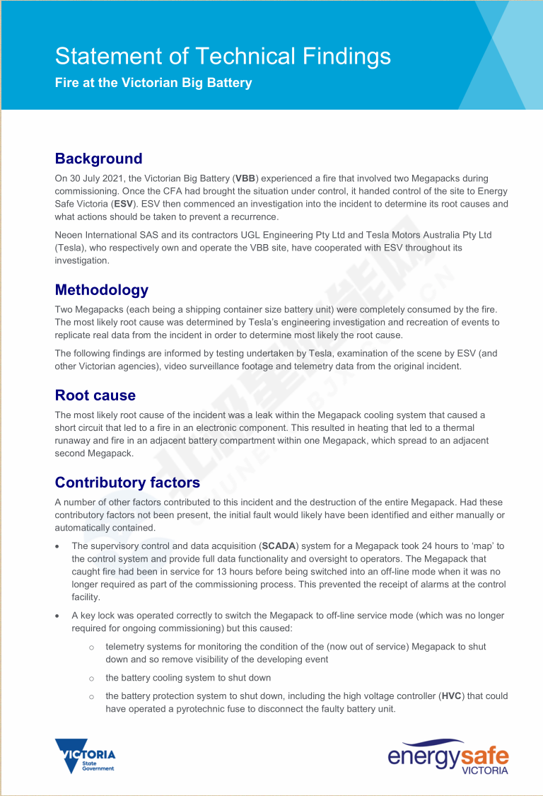 9月28日,澳大利亞維多利州亞州能源安全部門正式發(fā)布了儲能火災(zāi)事故調(diào)查結(jié)果,報告顯示冷卻系統(tǒng)內(nèi)泄漏造成短路、繼而引發(fā)了儲能火災(zāi)。而監(jiān)控系統(tǒng)沒有按要求24小時運行也是該事故的另內(nèi)在原因。 儲能火災(zāi)事件回顧 當?shù)貢r間2021年7月30日上午10:00~10:15左右,澳大利亞最大儲能項目——維多利亞大型電池儲能項目在設(shè)備調(diào)試期間發(fā)生火災(zāi),據(jù)當時新聞顯示一個集裝箱內(nèi)13噸鋰電池完全著火,當?shù)爻鰟恿?0 多輛消防車和支援車輛以及約 150 名消防員,消防人員連夜監(jiān)視、控制火勢并阻止火勢蔓延到附近的電池儲能系統(tǒng),大火持續(xù)四天后才被撲滅,現(xiàn)場經(jīng)過緊急疏散沒有人員受傷。 維多利亞儲能項目總裝機容量300MW/450MWh,此前Neoen與澳大利亞能源市場運營商簽訂了一份為期 10 年的合同,主要是提供電力輔助服務(wù)以滿足新南威爾士州和維多利亞州之間的主要電力傳輸?shù)娜萘扛叻逍枨?,原計劃于今?2月投運。信息就在火災(zāi)發(fā)生之前的7月29和7月30日早上該項目還進行了一些測試。