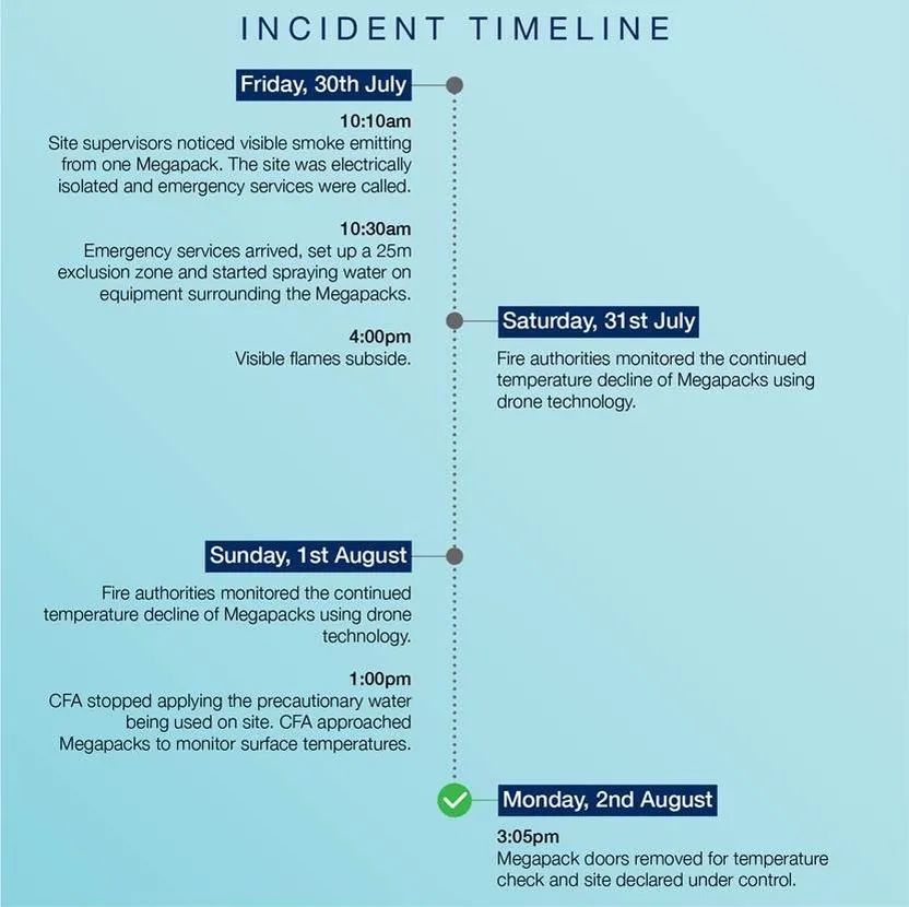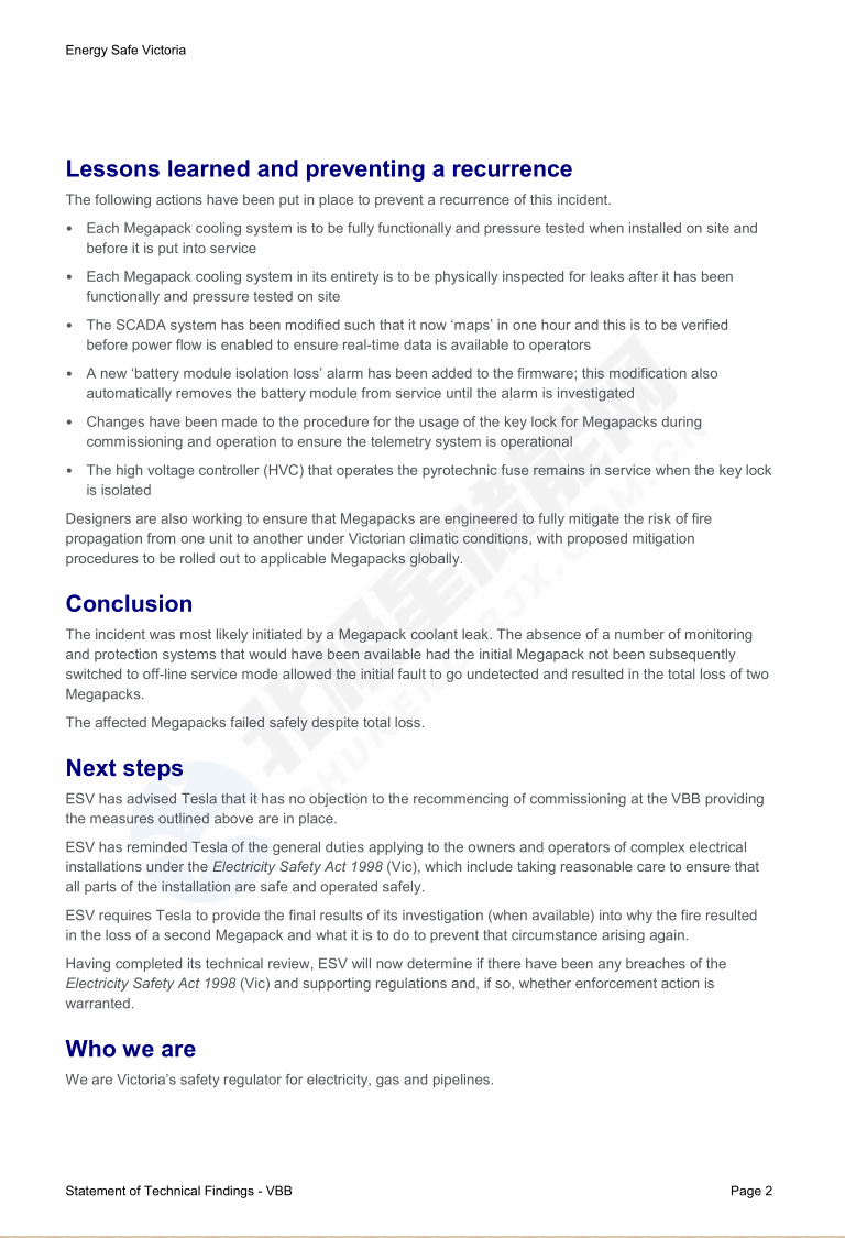 項目現(xiàn)場共有200多個特斯拉的Megapack集裝箱儲能系統(tǒng),每套Megapack系統(tǒng)的鋰離子電池容量3MWh。此次火災(zāi)導致項目場地的兩個Megapack儲能系統(tǒng)被燒毀。 冷卻系統(tǒng)成元兇?安全防護也失效 事故發(fā)生后,事發(fā)地的控制權(quán)交給了維多利亞能源安全局,項目運營商法國可再生能源巨頭Neoen、承包商UGL Engineering、以及設(shè)備供應(yīng)商特斯拉配合與其一起開展事件原因調(diào)查、研究采取哪些措施以避免事故再次發(fā)生。 9月28日,維多利亞能源安全局正式發(fā)布了事故調(diào)查結(jié)果報告。報告顯示,綜合特斯拉進行的詳細測試、維多利亞能源安全局和其他維多利亞州機構(gòu)對現(xiàn)場的檢查、以及視頻監(jiān)控錄像和原始事件的遙測數(shù)據(jù)等,最終得出結(jié)論:事件最可能的根本原因是 Megapack 集裝箱儲能系統(tǒng)冷卻系統(tǒng)內(nèi)泄漏導致短路,并引發(fā)電子元件起火。而局部過熱造成了熱失控,并引燃了同一個集裝箱內(nèi)與其相鄰的儲能電池,而后火勢又蔓延到相鄰的另一個集裝箱。 報告還顯示, Megapack儲能系統(tǒng)的監(jiān)控和數(shù)據(jù)采集系統(tǒng)(SCADA)需要24小時才能反饋到控制系統(tǒng),并為操作員提供完整的數(shù)據(jù)和監(jiān)督服務(wù)。而當時起火的Megapack已經(jīng)調(diào)試運行了13個小時,并在調(diào)試后已通過正確的操作將其切換為離線模式,這意味著原本可以提供監(jiān)控保護的遙感系統(tǒng)被斷開導致故障無法被檢測,同時電池冷卻系統(tǒng)被關(guān)閉,包括可以斷開故障電池單元的高壓控制器(HVC)在內(nèi)電池保護系統(tǒng)都被關(guān)閉。如果不是以上種種促成因素,則故障初始階段很可能就已被識別并可通過手動或自動控制來阻止火災(zāi)發(fā)生。 有媒體報道稱,在事故調(diào)查期間特斯拉對Megapack 裝置進行了詳細測試,包括在內(nèi)華達州的某設(shè)施中曾點燃一些裝置以確定火災(zāi)的根本原因和任何故障。從以上報告的分析來看,事故起因不在儲能電池,但儲能系統(tǒng)設(shè)計和操作存在一些隱患。 采取措施后儲能項目可復工 在調(diào)查報告中,還列出了一系列改善措施以避免類似事故的發(fā)生。 首先要求每個Megapack儲能系統(tǒng)的冷卻系統(tǒng)在現(xiàn)場安裝和投入使用之前都必須經(jīng)過全面的功能和壓力測試,而且在現(xiàn)場進行功能和壓力測試后都要進行物理檢查是否有泄漏。 其次,SCADA系統(tǒng)經(jīng)過修改現(xiàn)在可以在一小時內(nèi)“繪制”地圖,但在正式批量啟用之前還將進行驗證,以確保操作員可以獲得實時數(shù)據(jù)。 另外系統(tǒng)中還增加了新的“電池模組隔離丟失”警報,該修改可以自動將故障電池的服務(wù)斷開直到人員確認警報。 此外,特斯拉對 Megapack 在調(diào)試和運行期間的鑰匙鎖使用程序進行了更改,以確保遙感系統(tǒng)正常運行。而且即使鑰匙鎖被斷開服務(wù)時,控制煙感保險絲的高壓控制器 (HVC) 仍會持續(xù)工作。而相關(guān)設(shè)計人員還在努力探索新的方式,以確保在維多利亞州的氣候條件下充分降低火災(zāi)在集裝箱之間傳播的風險,并在未來向適用Megapack的全球范圍內(nèi)推廣。 Neoen稱,特斯拉已通過以上措施提高了針對此類罕見事件的可檢測性和相關(guān)故障保護。此外,Neoen還表示,能源安全響應(yīng)小組和Fisher Engineering正在收集維多利亞州大電池火災(zāi)的教訓,獨立報告將于11月公開分享。 報告最后顯示已告知特斯拉,只要上述措施到位、不反對項目重新開始調(diào)試。據(jù)最新報道顯示,9月29日,維多利亞儲能項目已獲批恢復其調(diào)試過程。