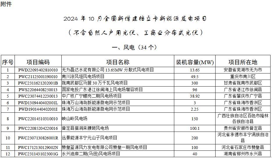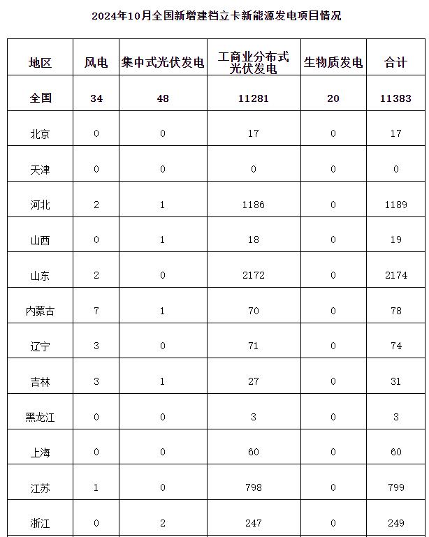 12月2日,國家能源局發(fā)布《關于2024年10月全國新增建檔立卡新能源發(fā)電(不含自然人戶用光伏)項目情況的公告》。2024年10月,全國新增建檔立卡新能源發(fā)電(不含自然人戶用光伏)項目共11383個,其中風電項目34個,光伏發(fā)電項目11329個(集中式光伏發(fā)電項目48個,工商業(yè)分布式光伏發(fā)電項目11281個),生物質發(fā)電項目20個。 國家能源局 2024年11月28日