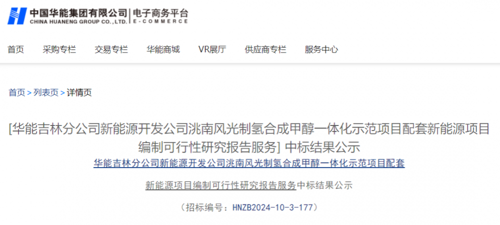 12月3日,中國華能集團(tuán)有限公司電子商務(wù)平臺發(fā)布《華能吉林分公司新能源開發(fā)公司洮南風(fēng)光制氫合成甲醇一體化示范項目配套新能源項目編制可行性研究報告服務(wù)中標(biāo)結(jié)果公示》。