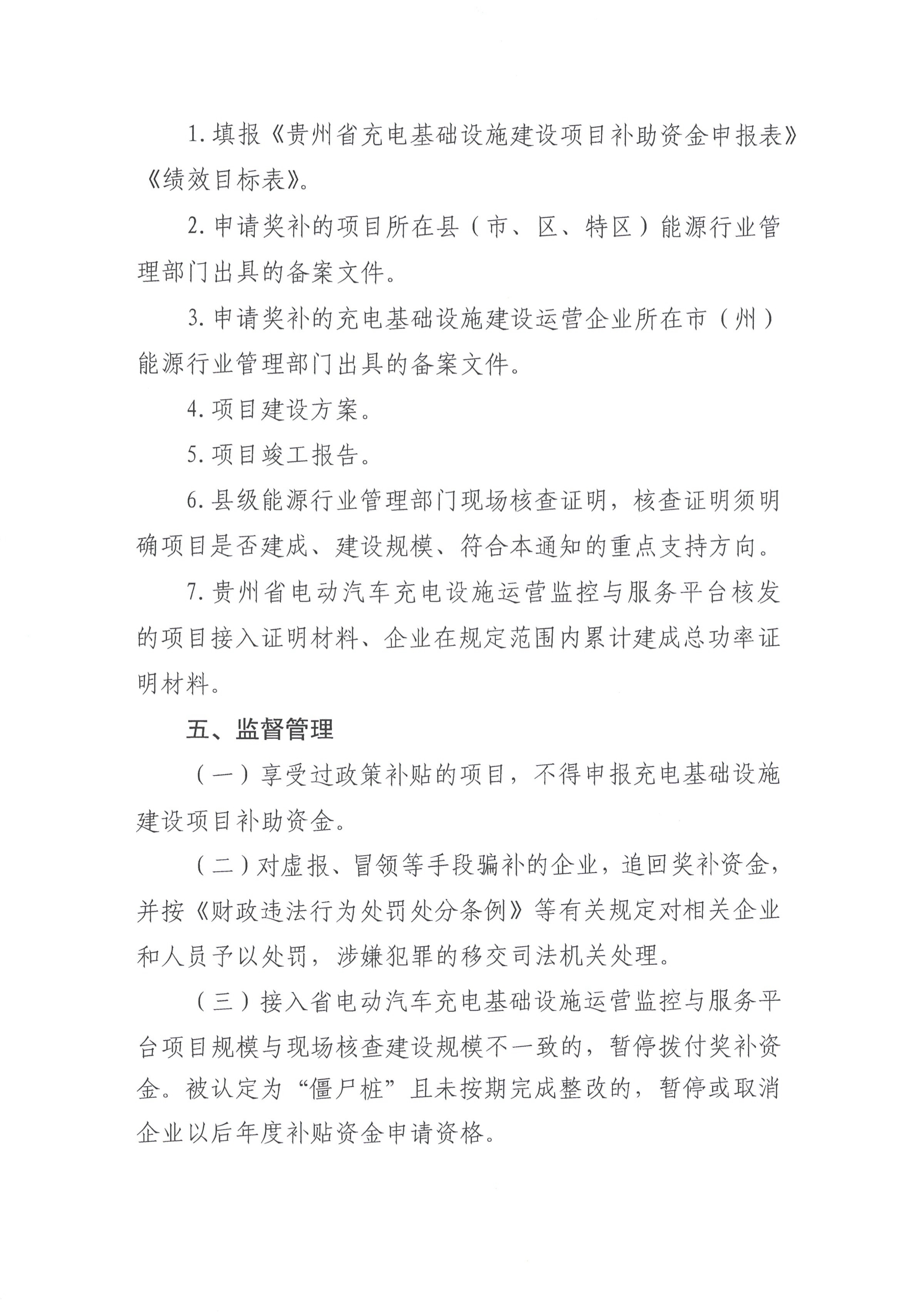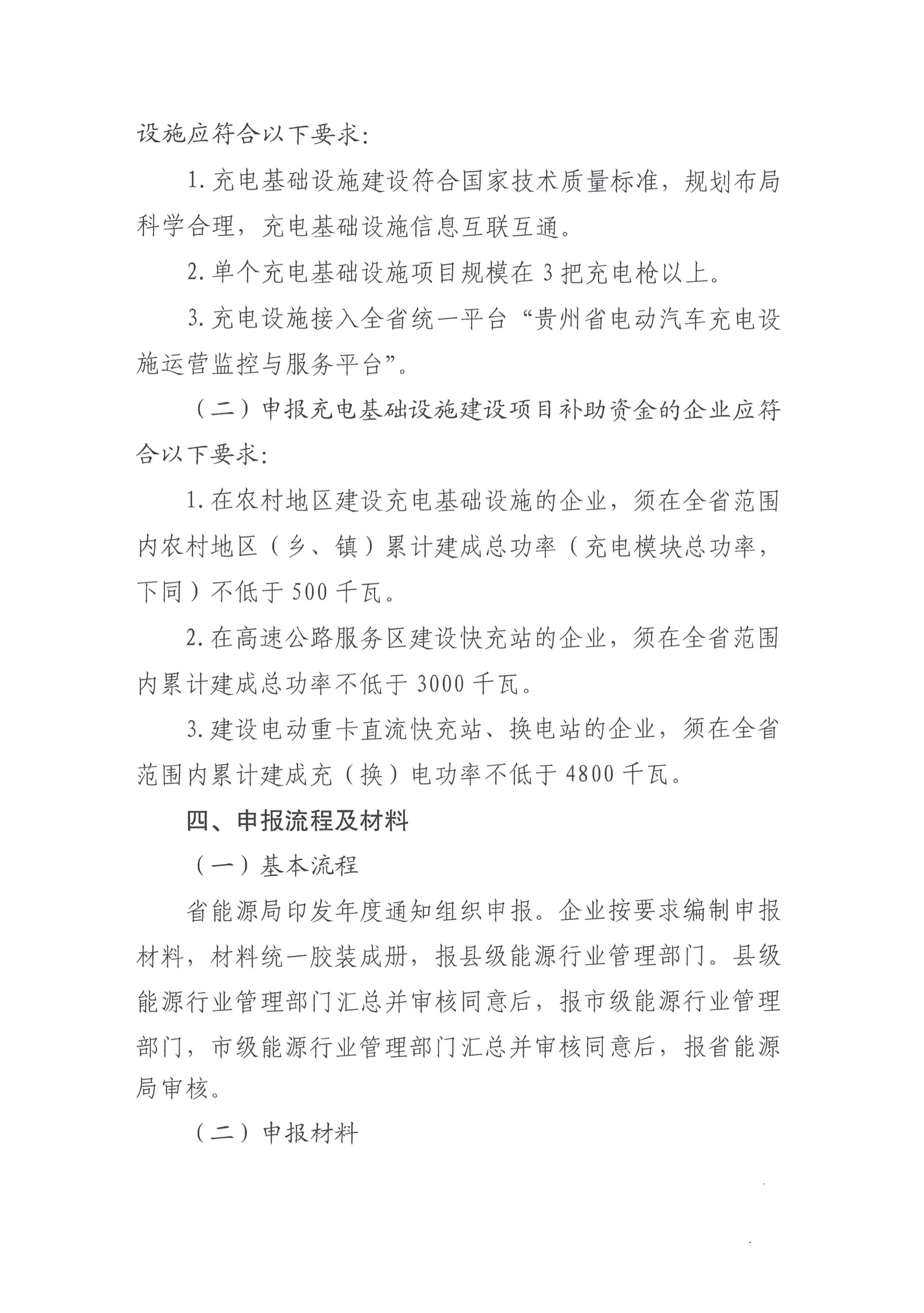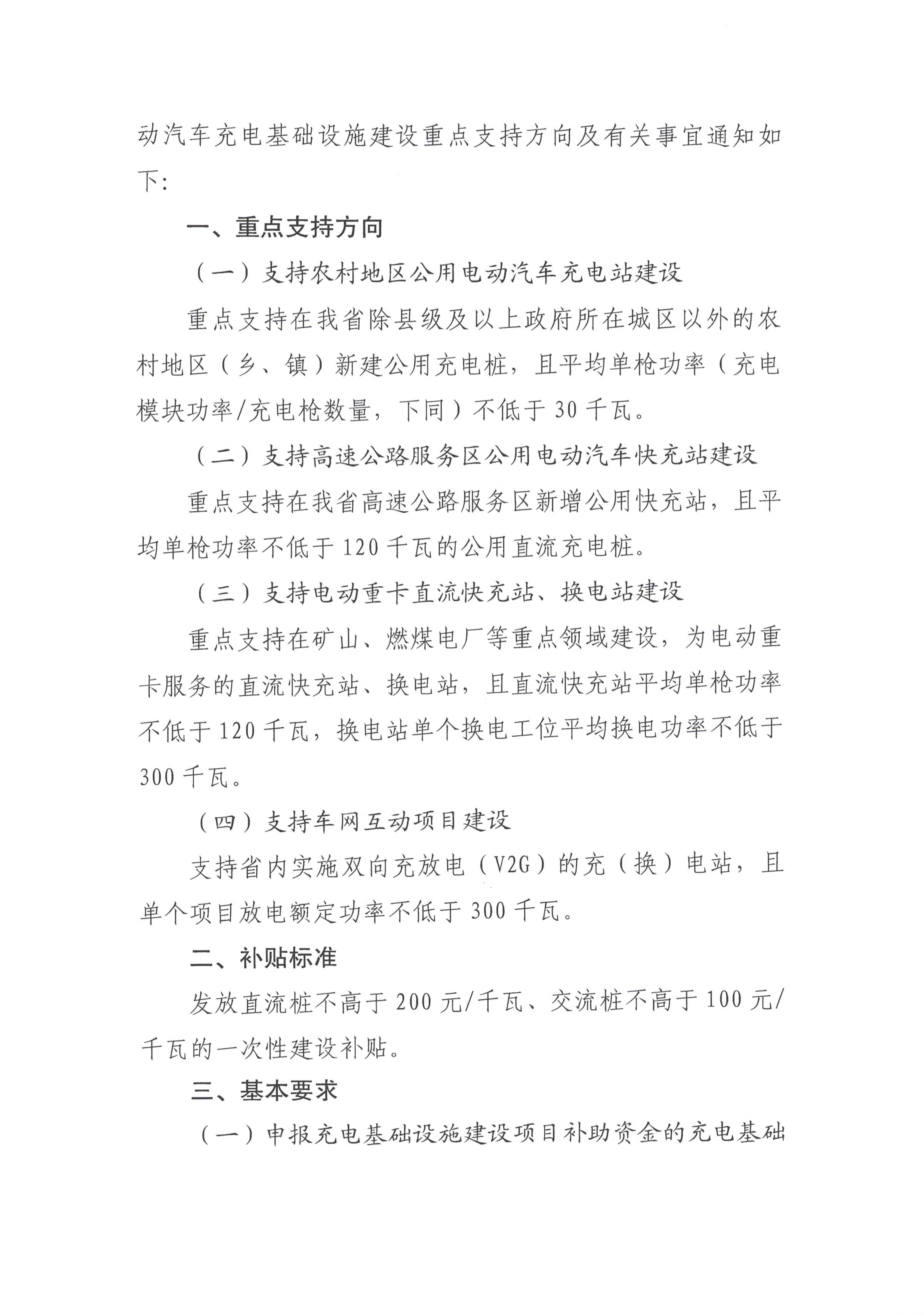 11月25日,貴州省能源局印發(fā)《省能源局關(guān)于印發(fā)貴州省電動(dòng)汽車充電基礎(chǔ)設(shè)施建設(shè)重點(diǎn)支持方向》。其中提出四個(gè)重點(diǎn)支持方向:(一)重點(diǎn)支持在我省除縣級(jí)及以上政府所在城區(qū)以外的農(nóng)村地區(qū)(鄉(xiāng)、鎮(zhèn))新建公用充電樁,平均單槍功率不低于30千瓦。重點(diǎn)支持在我省高速公路服務(wù)區(qū)新增公用快充站,且平均單槍功率不低于120千瓦的公用直流充電樁。重點(diǎn)支持在礦山、燃煤電廠等重點(diǎn)領(lǐng)域建設(shè),為電動(dòng)重卡服務(wù)的直流快充站、換電站,直流快充站平均單槍功率不低于120千瓦,換電站單個(gè)換電工位平均換電功率不低于300千瓦。支持車網(wǎng)互動(dòng)項(xiàng)目建設(shè)。單個(gè)項(xiàng)目放電額定功率不低于300千瓦。指出補(bǔ)貼標(biāo)準(zhǔn)為:發(fā)放直流樁不高于200元/千瓦、交流樁不高于100元/千瓦的一次性建設(shè)補(bǔ)貼。 其中要求在農(nóng)村地區(qū)建設(shè)充電基礎(chǔ)設(shè)施的企業(yè),須在全省范圍內(nèi)農(nóng)村地區(qū)累計(jì)建成總功率不低于500千瓦;在高速公路服務(wù)區(qū)建設(shè)快充站的企業(yè),須在全省范圍內(nèi)累計(jì)建成總功率不低于 3000千瓦;建設(shè)電動(dòng)重卡直流快充站、換電站的企業(yè),須在全省范圍內(nèi)累計(jì)建成充(換)電功率不低于4800千瓦。 原文如下: