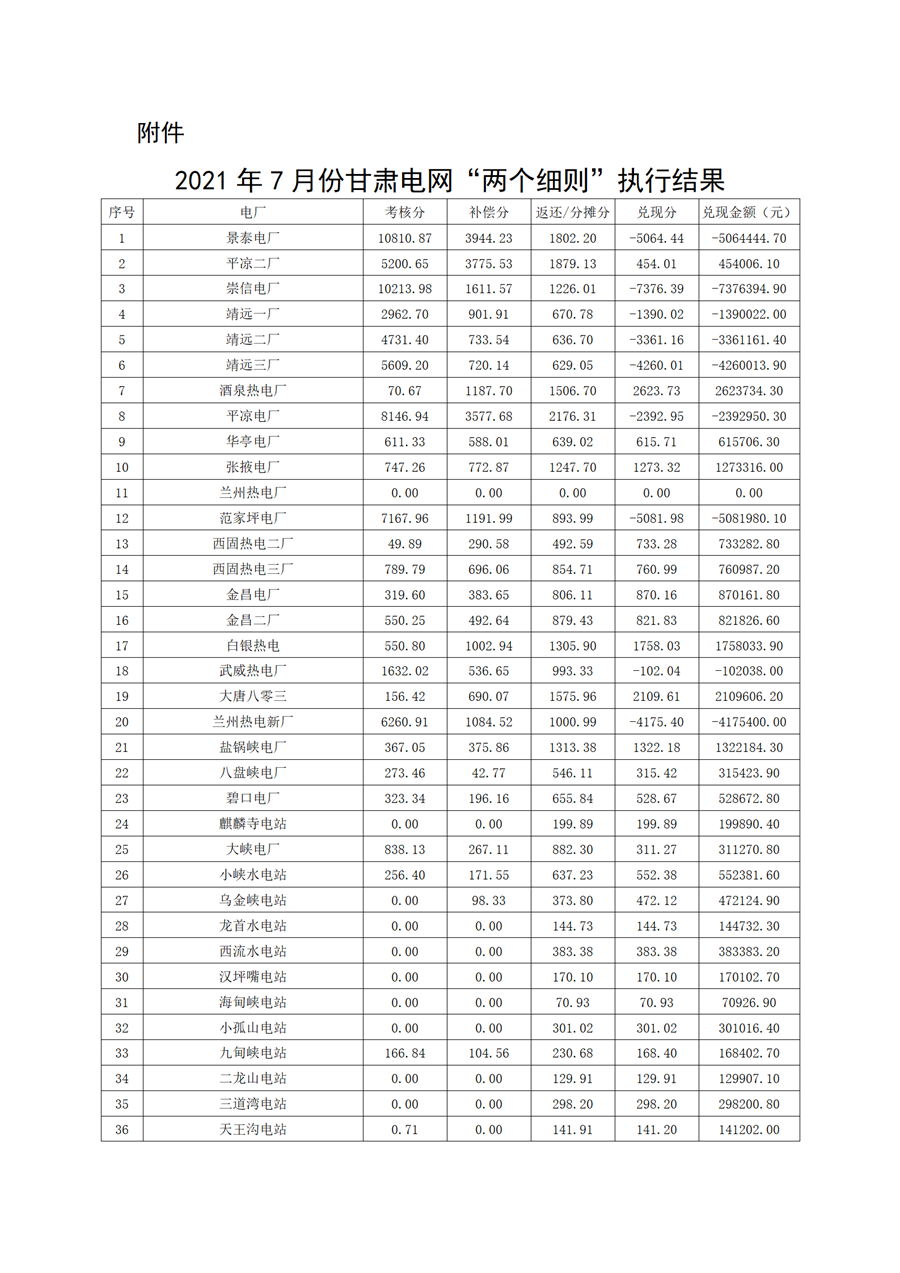 9月30日,甘肅能源監(jiān)管辦發(fā)布關(guān)于甘肅電網(wǎng)2021年7月份 《兩個細(xì)則》考核補(bǔ)償結(jié)果預(yù)公告,其中光伏項目204個。 原文如下: 甘肅能源監(jiān)管辦關(guān)于公布2021年7月份 甘肅電網(wǎng)“兩個細(xì)則”執(zhí)行結(jié)果的通知 國網(wǎng)甘肅省電力公司,甘肅電力交易中心有限公司: 國網(wǎng)甘肅省電力公司報送的《關(guān)于2021年7月份甘肅電網(wǎng)“兩個細(xì)則”執(zhí)行結(jié)果的報告》(甘電司調(diào)度〔2021〕517號)收悉。根據(jù)《國家能源局西北監(jiān)管局關(guān)于印發(fā)<西北區(qū)域發(fā)電廠并網(wǎng)運(yùn)行管理實施細(xì)則>及<西北區(qū)域并網(wǎng)發(fā)電廠輔助服務(wù)管理實施細(xì)則>的通知》(西北監(jiān)能市場〔2018〕66號)規(guī)定,對2021年7月份甘肅電網(wǎng)“兩個細(xì)則”考核補(bǔ)償結(jié)果完成復(fù)核,現(xiàn)予公布,請甘肅電力交易中心有限公司依據(jù)附件結(jié)算。 特此通知。 甘肅能源監(jiān)管辦 2021年9月29日