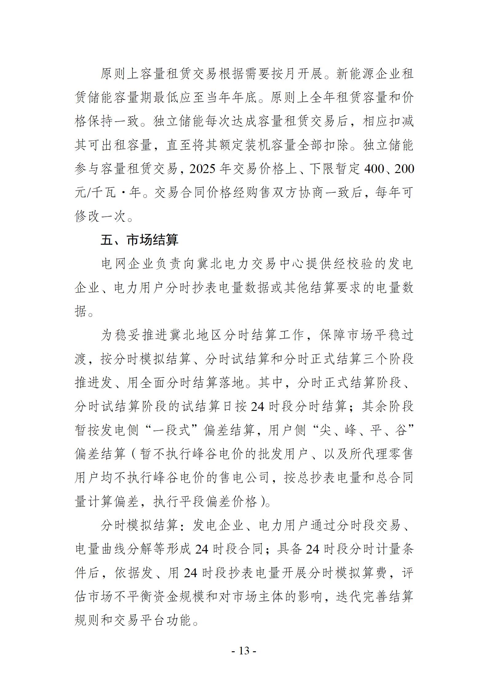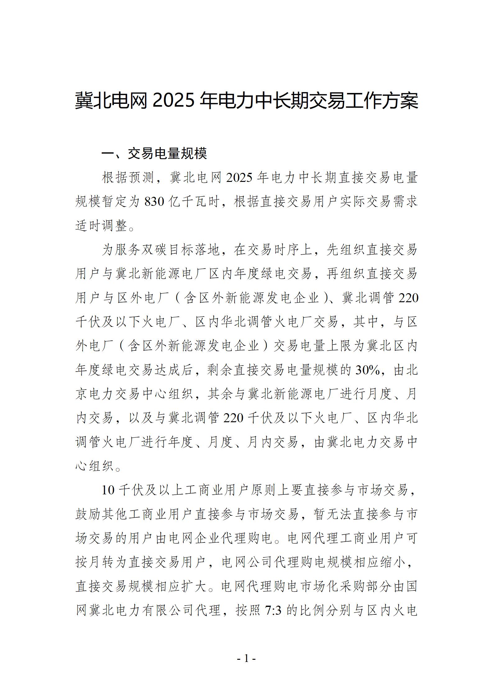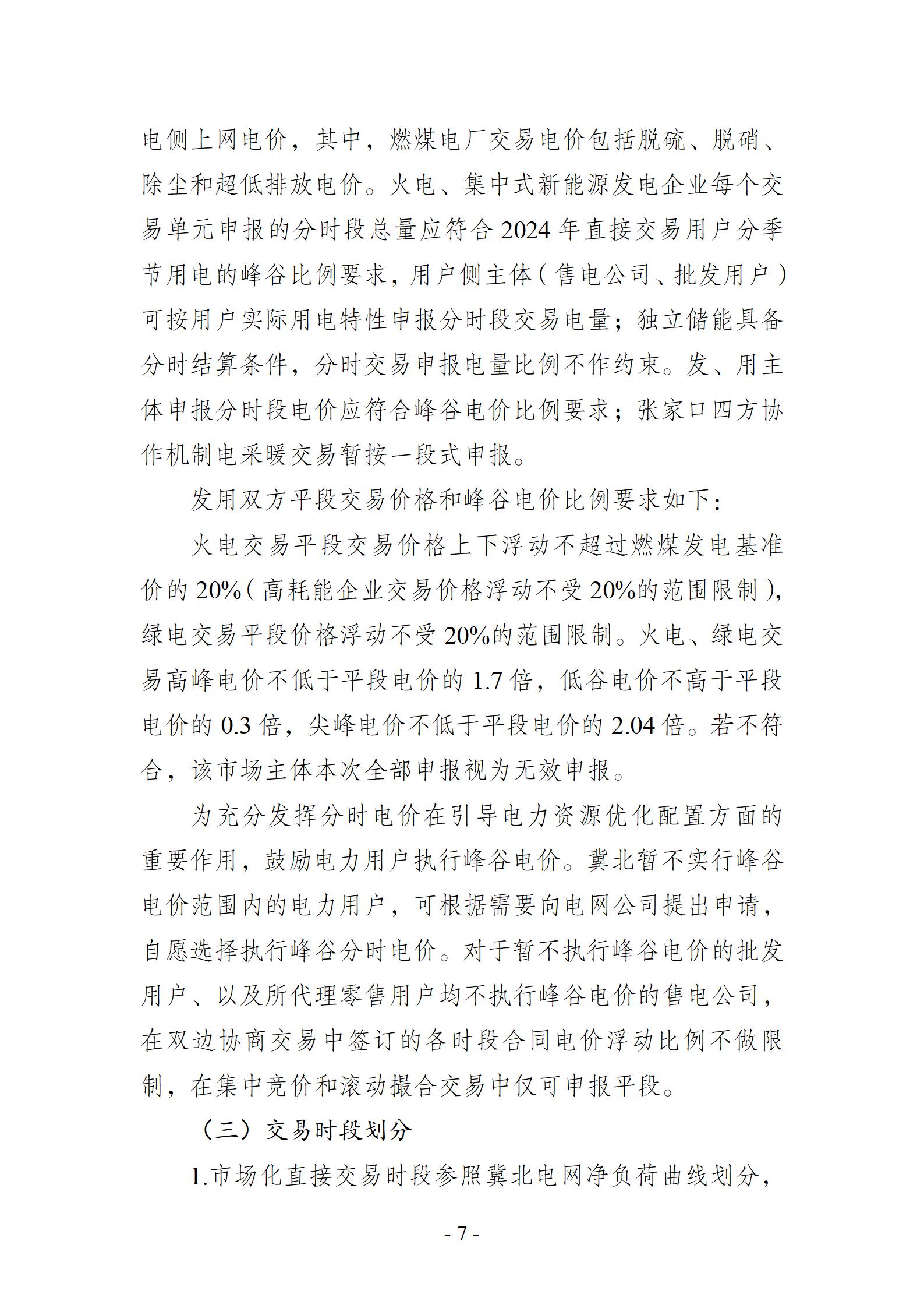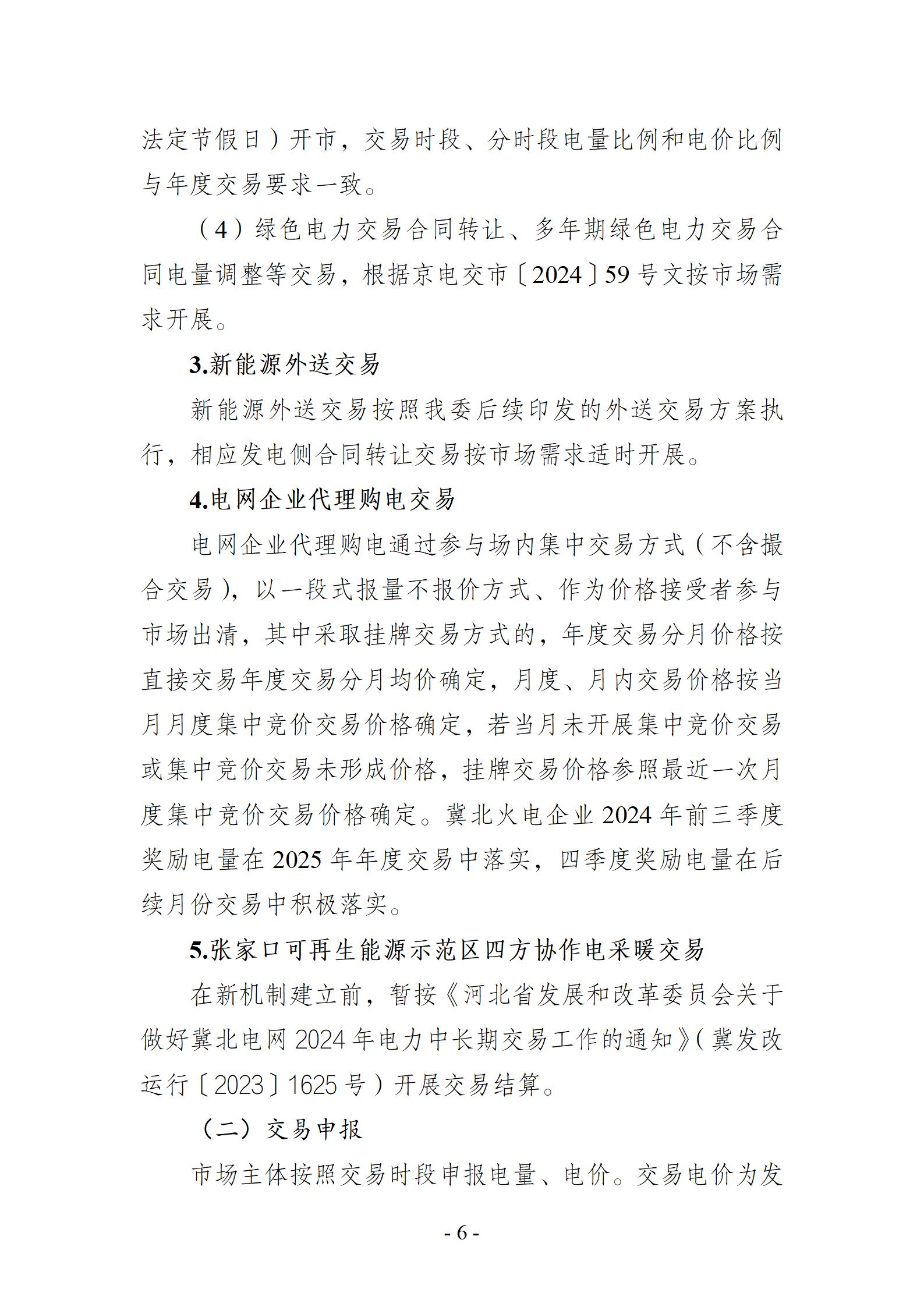 12月11日,河北省發(fā)展和改革委員會(huì)關(guān)于印發(fā)《冀北電網(wǎng)2025年電力中長期交易工作方案》的通知,通知指出,月度交易:按照雙邊協(xié)商方式組織,按照24個(gè)交易時(shí)段簽約,尖峰、峰、平、谷時(shí)段的加權(quán)均價(jià)應(yīng)符合峰谷電價(jià)比例浮動(dòng)要求,風(fēng)電、光伏發(fā)電企業(yè)根據(jù)實(shí)際發(fā)電特性申報(bào)分時(shí)段電量、電價(jià)。 月內(nèi)交易:按照雙邊協(xié)商方式組織,交易標(biāo)的為月內(nèi)剩余天數(shù)的24時(shí)段交易電量,按周(不含法定節(jié)假日)開市,按照24個(gè)交易時(shí)段簽約,尖峰、峰、平、谷時(shí)段的加權(quán)均價(jià)應(yīng)符合峰谷電價(jià)比例浮動(dòng)要求,風(fēng)電、光伏發(fā)電企業(yè)根據(jù)實(shí)際發(fā)電特性申報(bào)分時(shí)段電量、電價(jià)。 綠色電力交易合同轉(zhuǎn)讓、多年期綠色電力交易合同電量調(diào)整等交易,根據(jù)京電交市〔2024〕59號(hào)文按市場需求開展。 原文如下: 河北省發(fā)展和改革委員會(huì)關(guān)于印發(fā)《冀北電網(wǎng)2025年電力中長期交易工作方案》的通知 冀發(fā)改運(yùn)行[2024]1633號(hào) 承德、張家口、秦皇島、唐山、廊坊市發(fā)展改革委,張家口市能源局,北京電力交易中心有限公司、國家電網(wǎng)華北分部、國網(wǎng)冀北電力有限公司、冀北電力交易中心有限公司,大唐國際電力公司、華潤華北電力公司、省建投公司,各有關(guān)發(fā)電企業(yè)、電力用戶、售電公司: 為做好冀北電網(wǎng)2025年電力中長期交易工作,依據(jù)《中共中央 國務(wù)院關(guān)于進(jìn)一步深化電力體制改革的若干意見》(中發(fā)〔2015〕9號(hào))及其配套文件、《電力中長期交易基本規(guī)則》(發(fā)改能源規(guī)〔2020〕889號(hào))等文件要求,我委制定了《冀北電網(wǎng)2025年電力中長期交易工作方案》,現(xiàn)印發(fā)給你們,請遵照執(zhí)行。 河北省發(fā)展和改革委員會(huì) 2024年12月11日