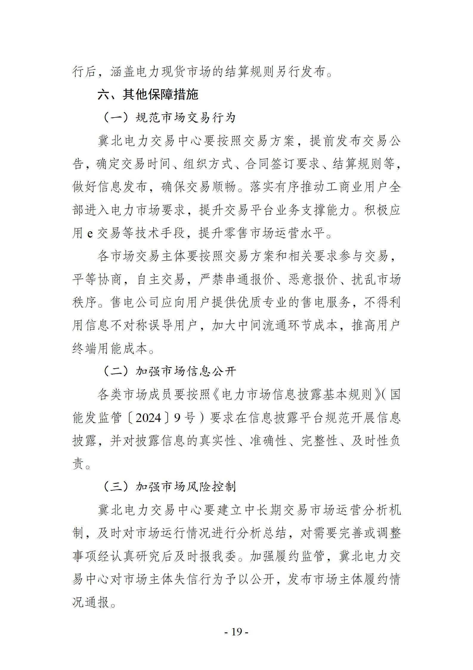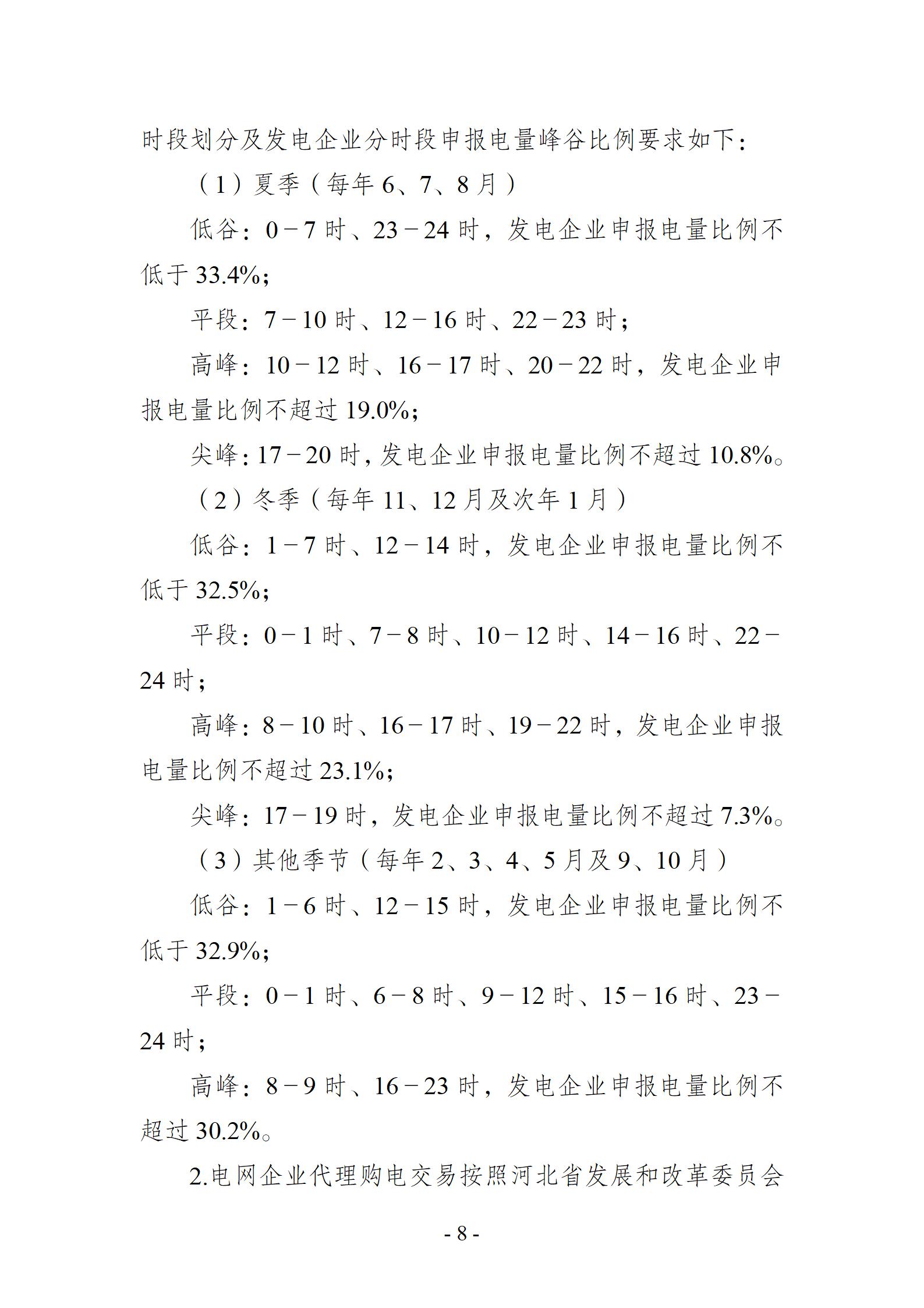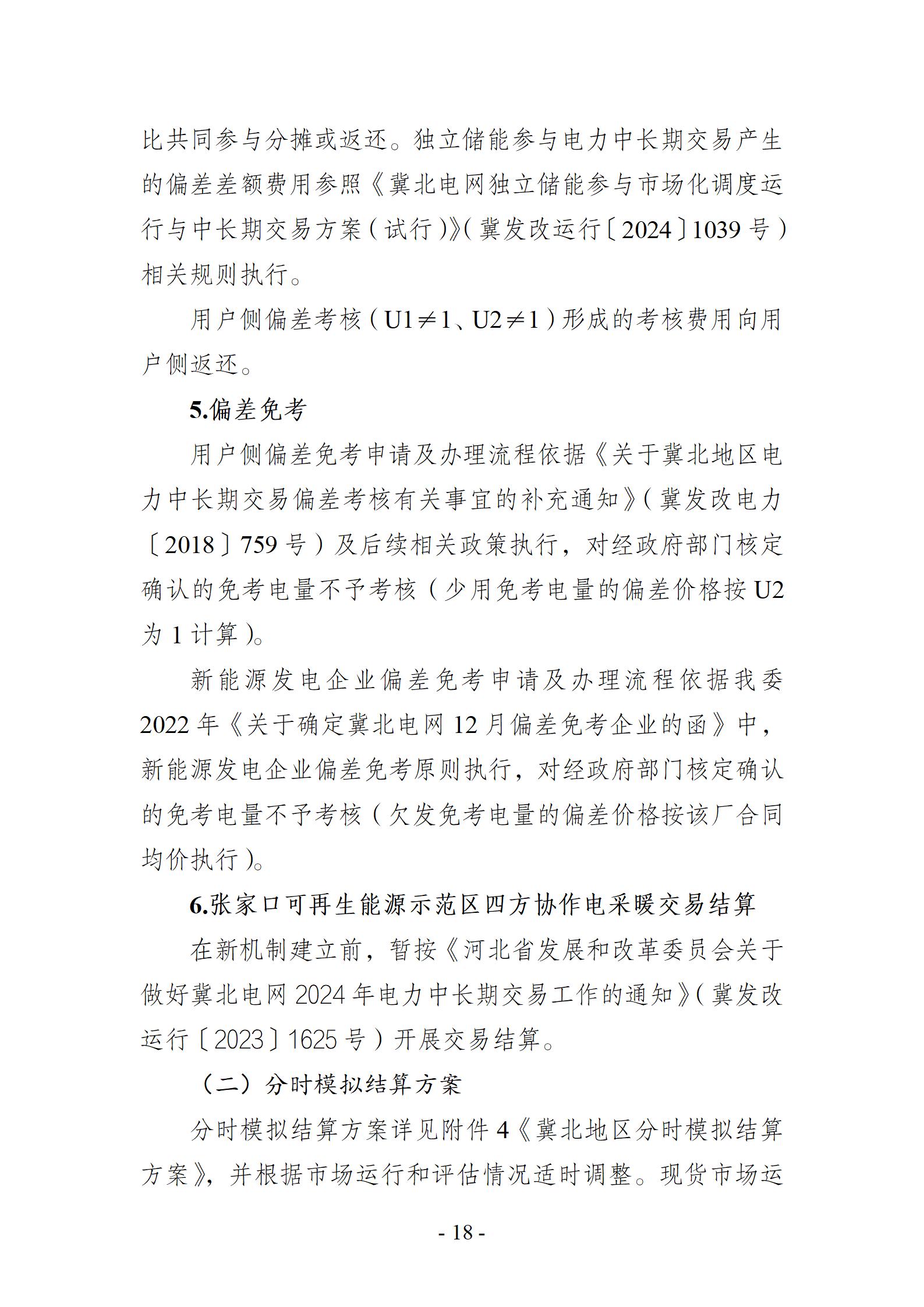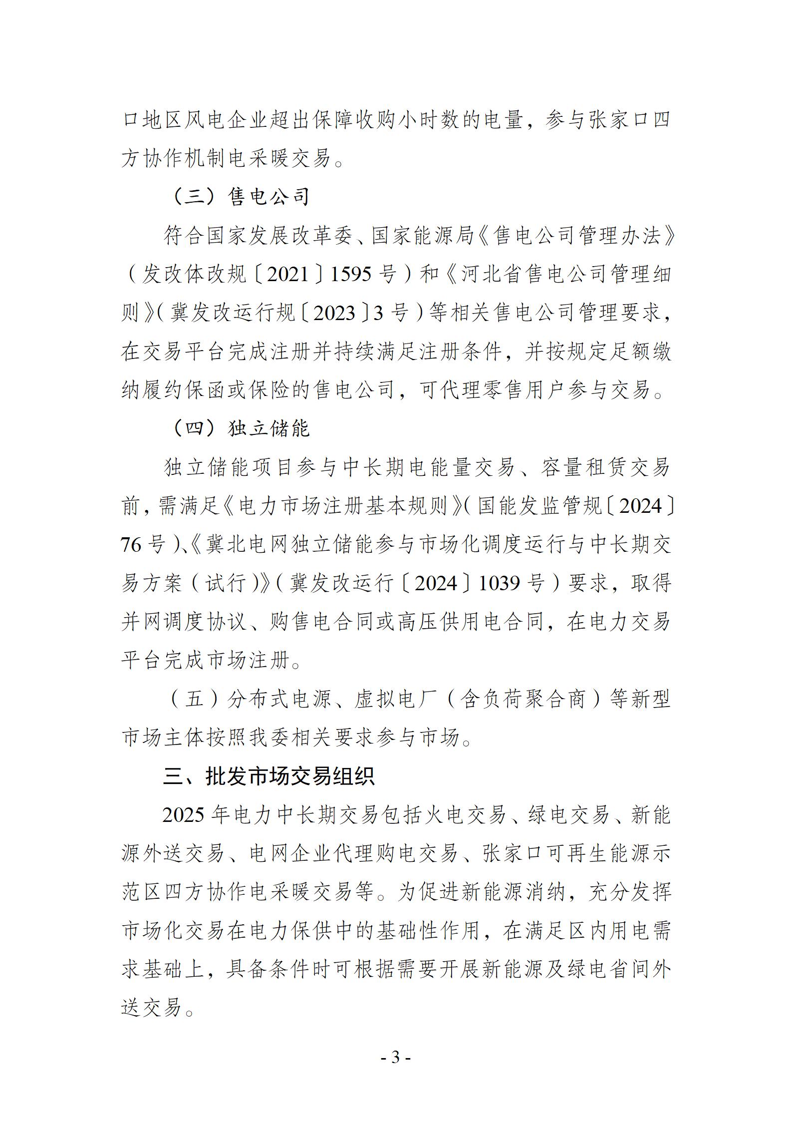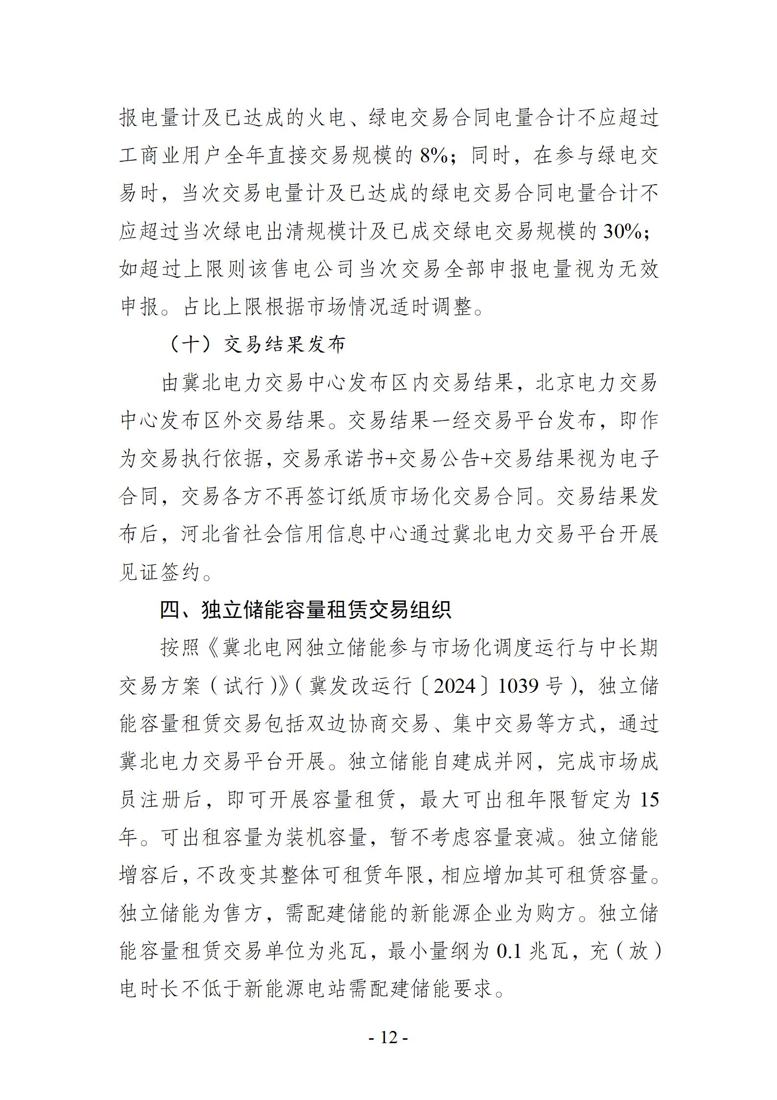 12月11日,河北省發(fā)展和改革委員會(huì)關(guān)于印發(fā)《冀北電網(wǎng)2025年電力中長期交易工作方案》的通知,通知指出,月度交易:按照雙邊協(xié)商方式組織,按照24個(gè)交易時(shí)段簽約,尖峰、峰、平、谷時(shí)段的加權(quán)均價(jià)應(yīng)符合峰谷電價(jià)比例浮動(dòng)要求,風(fēng)電、光伏發(fā)電企業(yè)根據(jù)實(shí)際發(fā)電特性申報(bào)分時(shí)段電量、電價(jià)。 月內(nèi)交易:按照雙邊協(xié)商方式組織,交易標(biāo)的為月內(nèi)剩余天數(shù)的24時(shí)段交易電量,按周(不含法定節(jié)假日)開市,按照24個(gè)交易時(shí)段簽約,尖峰、峰、平、谷時(shí)段的加權(quán)均價(jià)應(yīng)符合峰谷電價(jià)比例浮動(dòng)要求,風(fēng)電、光伏發(fā)電企業(yè)根據(jù)實(shí)際發(fā)電特性申報(bào)分時(shí)段電量、電價(jià)。 綠色電力交易合同轉(zhuǎn)讓、多年期綠色電力交易合同電量調(diào)整等交易,根據(jù)京電交市〔2024〕59號(hào)文按市場需求開展。 原文如下: 河北省發(fā)展和改革委員會(huì)關(guān)于印發(fā)《冀北電網(wǎng)2025年電力中長期交易工作方案》的通知 冀發(fā)改運(yùn)行[2024]1633號(hào) 承德、張家口、秦皇島、唐山、廊坊市發(fā)展改革委,張家口市能源局,北京電力交易中心有限公司、國家電網(wǎng)華北分部、國網(wǎng)冀北電力有限公司、冀北電力交易中心有限公司,大唐國際電力公司、華潤華北電力公司、省建投公司,各有關(guān)發(fā)電企業(yè)、電力用戶、售電公司: 為做好冀北電網(wǎng)2025年電力中長期交易工作,依據(jù)《中共中央 國務(wù)院關(guān)于進(jìn)一步深化電力體制改革的若干意見》(中發(fā)〔2015〕9號(hào))及其配套文件、《電力中長期交易基本規(guī)則》(發(fā)改能源規(guī)〔2020〕889號(hào))等文件要求,我委制定了《冀北電網(wǎng)2025年電力中長期交易工作方案》,現(xiàn)印發(fā)給你們,請遵照執(zhí)行。 河北省發(fā)展和改革委員會(huì) 2024年12月11日