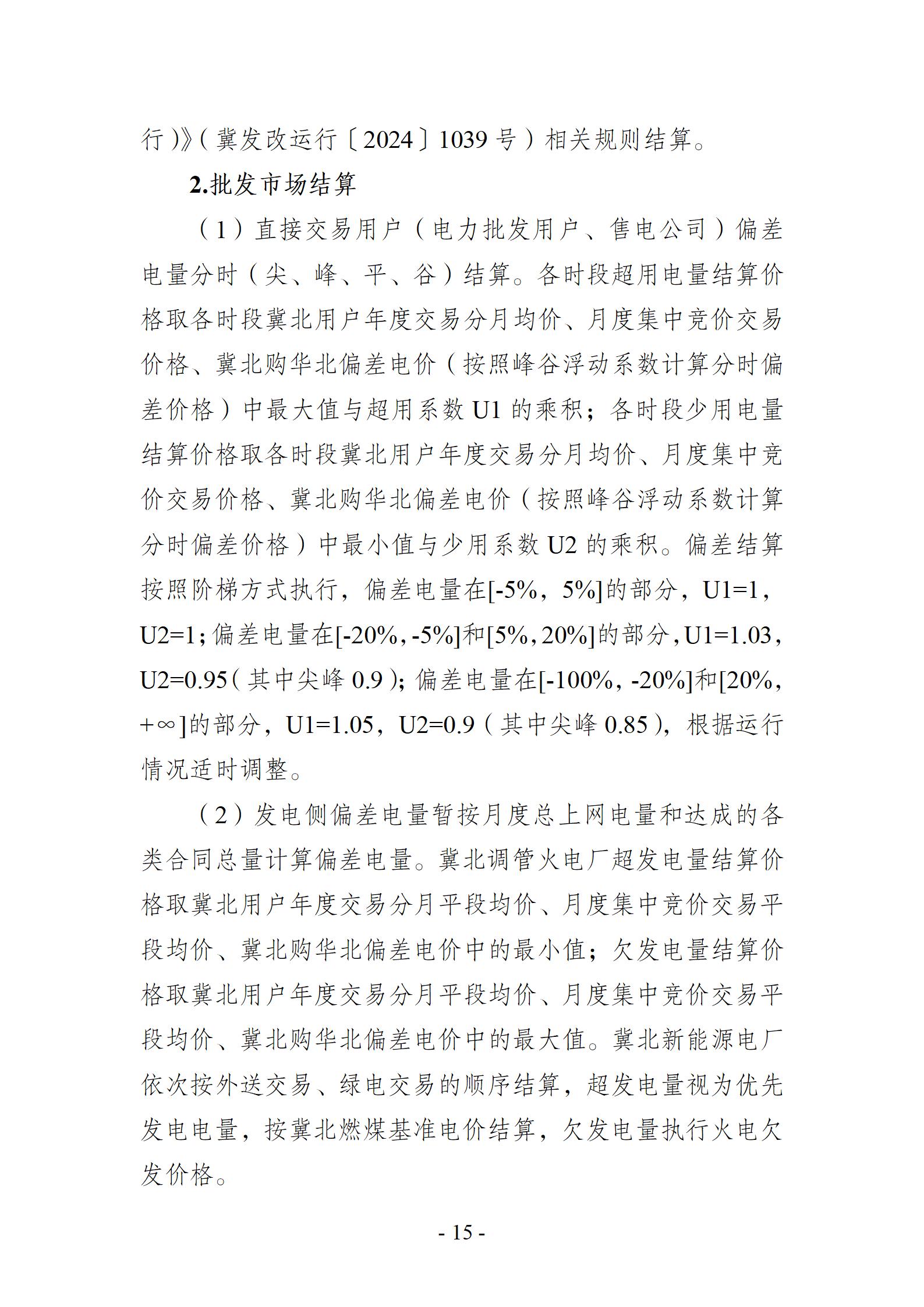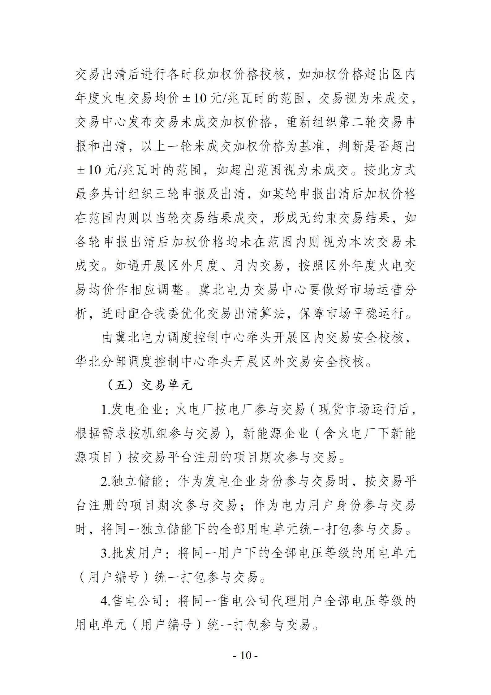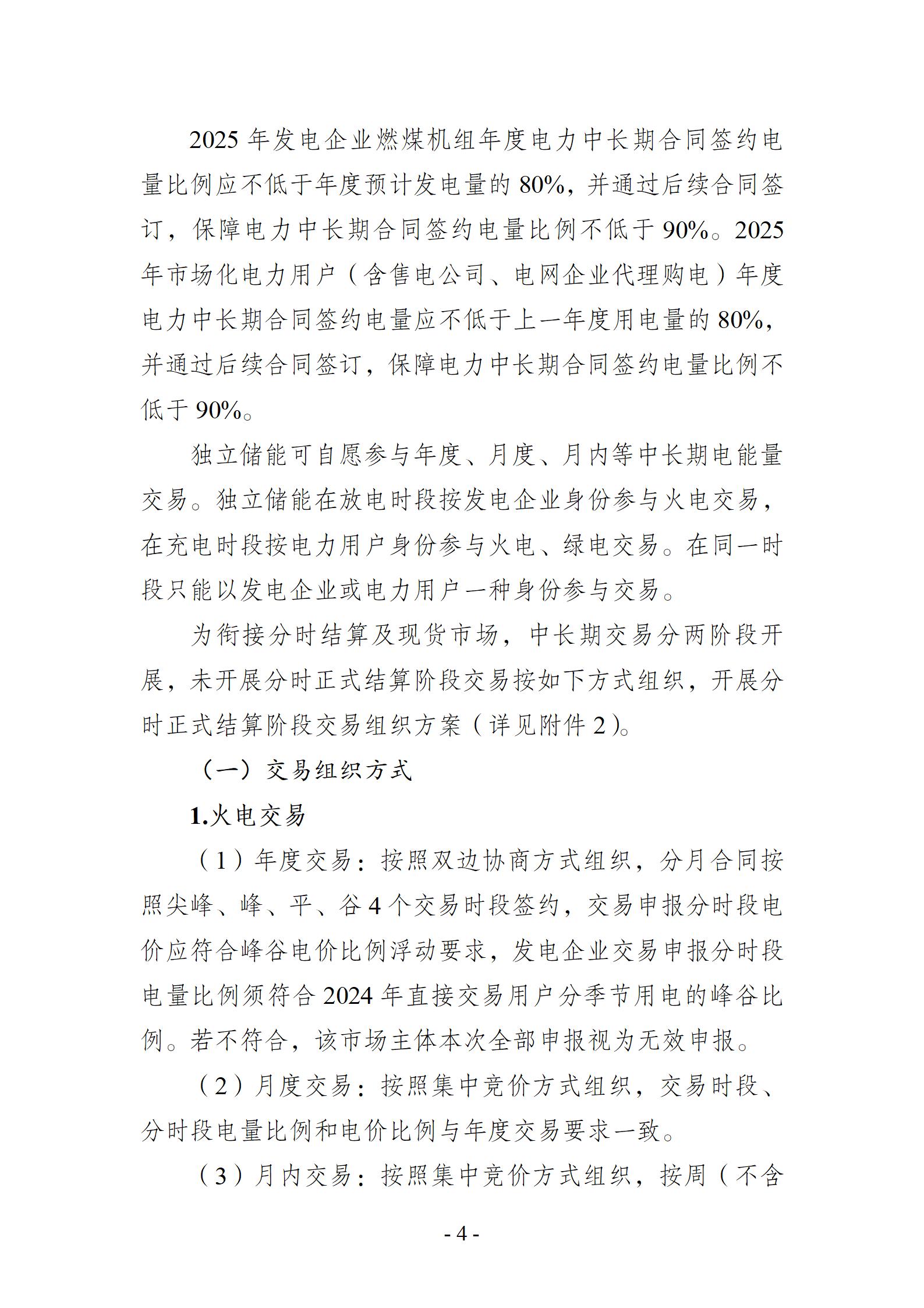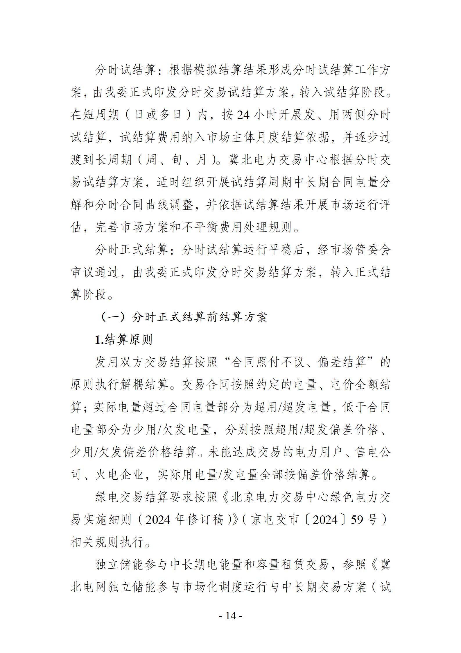 12月11日,河北省發(fā)展和改革委員會(huì)關(guān)于印發(fā)《冀北電網(wǎng)2025年電力中長期交易工作方案》的通知,通知指出,月度交易:按照雙邊協(xié)商方式組織,按照24個(gè)交易時(shí)段簽約,尖峰、峰、平、谷時(shí)段的加權(quán)均價(jià)應(yīng)符合峰谷電價(jià)比例浮動(dòng)要求,風(fēng)電、光伏發(fā)電企業(yè)根據(jù)實(shí)際發(fā)電特性申報(bào)分時(shí)段電量、電價(jià)。 月內(nèi)交易:按照雙邊協(xié)商方式組織,交易標(biāo)的為月內(nèi)剩余天數(shù)的24時(shí)段交易電量,按周(不含法定節(jié)假日)開市,按照24個(gè)交易時(shí)段簽約,尖峰、峰、平、谷時(shí)段的加權(quán)均價(jià)應(yīng)符合峰谷電價(jià)比例浮動(dòng)要求,風(fēng)電、光伏發(fā)電企業(yè)根據(jù)實(shí)際發(fā)電特性申報(bào)分時(shí)段電量、電價(jià)。 綠色電力交易合同轉(zhuǎn)讓、多年期綠色電力交易合同電量調(diào)整等交易,根據(jù)京電交市〔2024〕59號(hào)文按市場需求開展。 原文如下: 河北省發(fā)展和改革委員會(huì)關(guān)于印發(fā)《冀北電網(wǎng)2025年電力中長期交易工作方案》的通知 冀發(fā)改運(yùn)行[2024]1633號(hào) 承德、張家口、秦皇島、唐山、廊坊市發(fā)展改革委,張家口市能源局,北京電力交易中心有限公司、國家電網(wǎng)華北分部、國網(wǎng)冀北電力有限公司、冀北電力交易中心有限公司,大唐國際電力公司、華潤華北電力公司、省建投公司,各有關(guān)發(fā)電企業(yè)、電力用戶、售電公司: 為做好冀北電網(wǎng)2025年電力中長期交易工作,依據(jù)《中共中央 國務(wù)院關(guān)于進(jìn)一步深化電力體制改革的若干意見》(中發(fā)〔2015〕9號(hào))及其配套文件、《電力中長期交易基本規(guī)則》(發(fā)改能源規(guī)〔2020〕889號(hào))等文件要求,我委制定了《冀北電網(wǎng)2025年電力中長期交易工作方案》,現(xiàn)印發(fā)給你們,請遵照執(zhí)行。 河北省發(fā)展和改革委員會(huì) 2024年12月11日