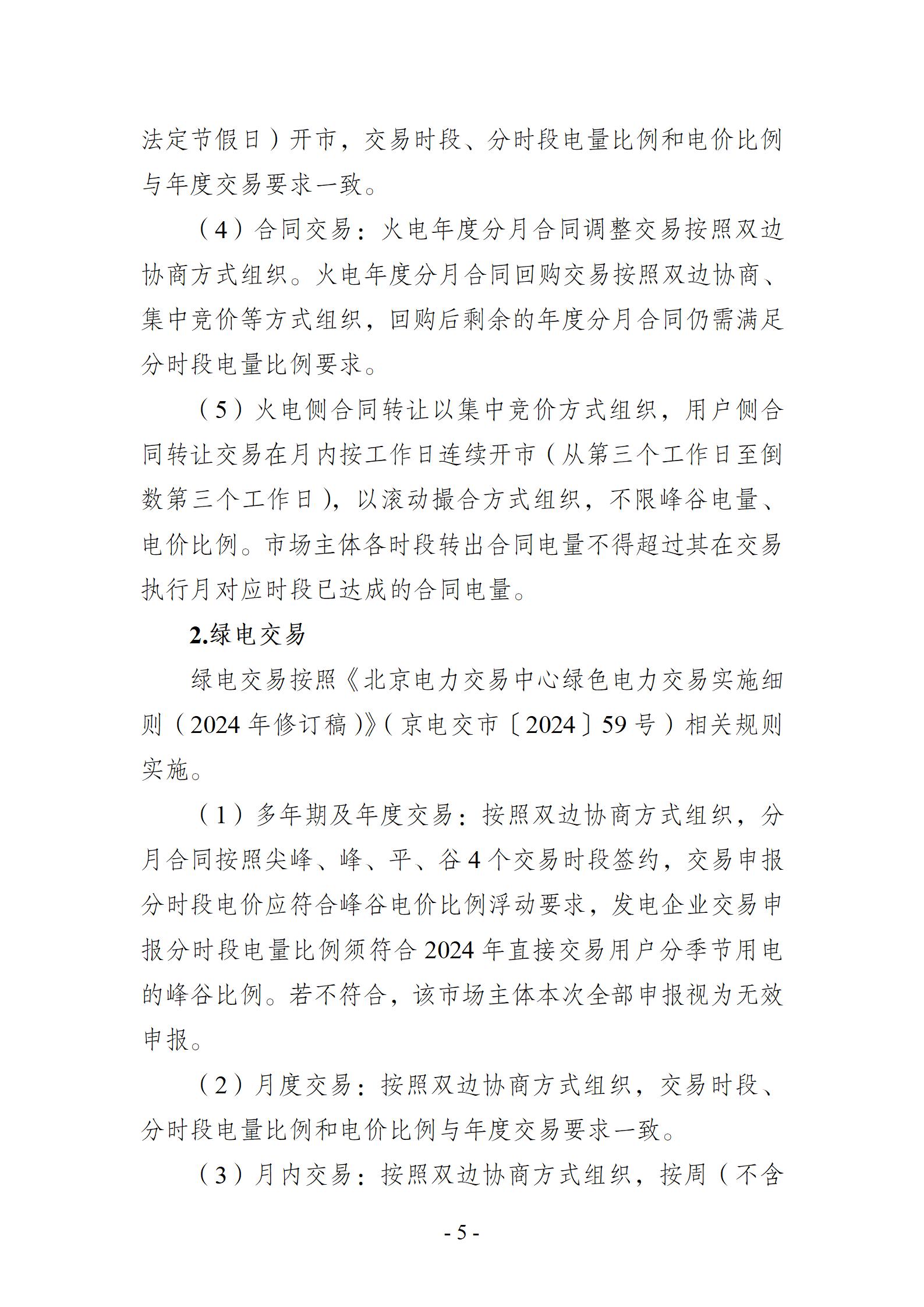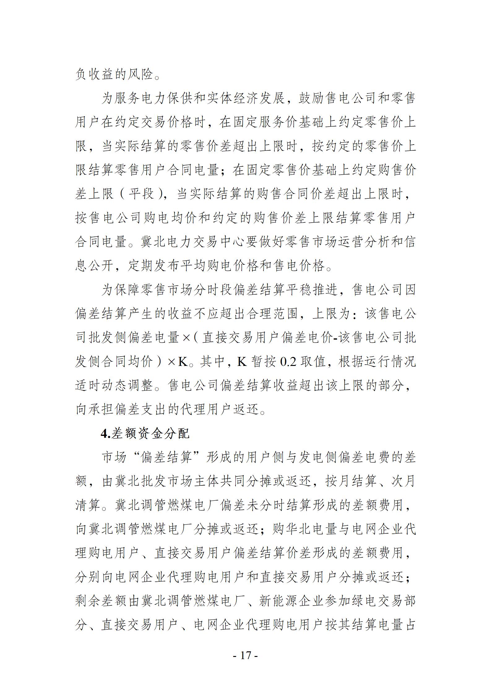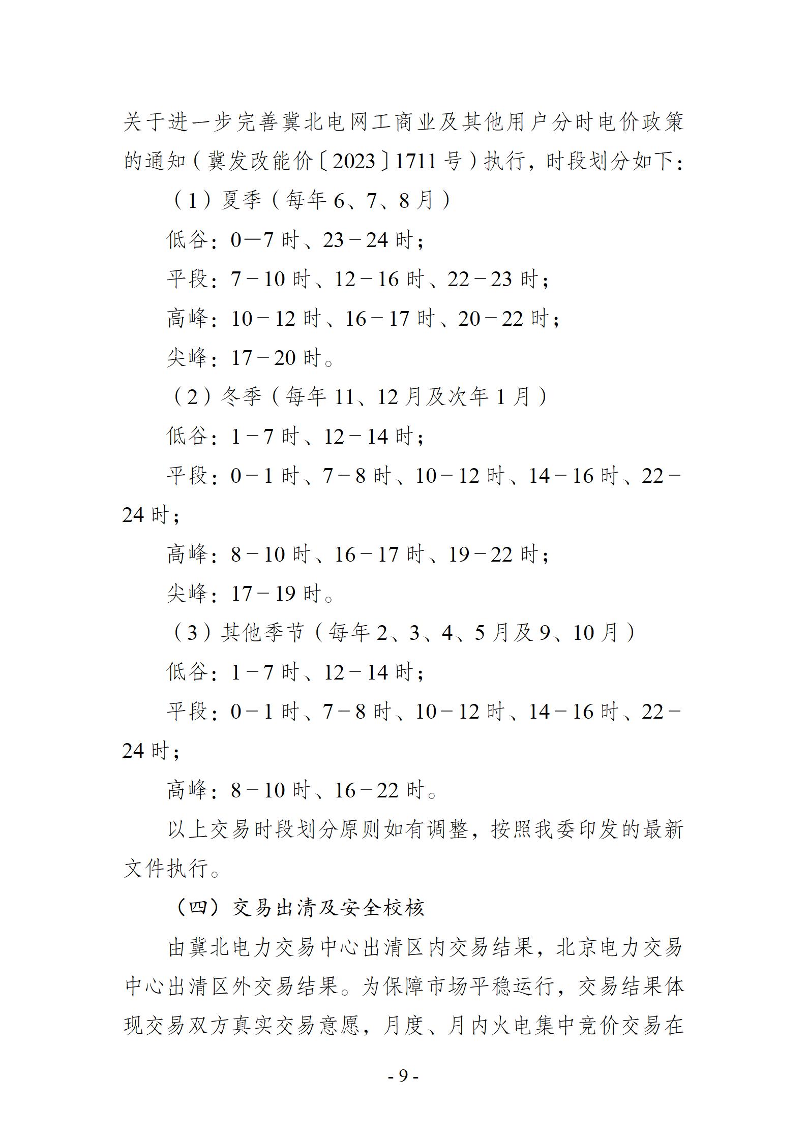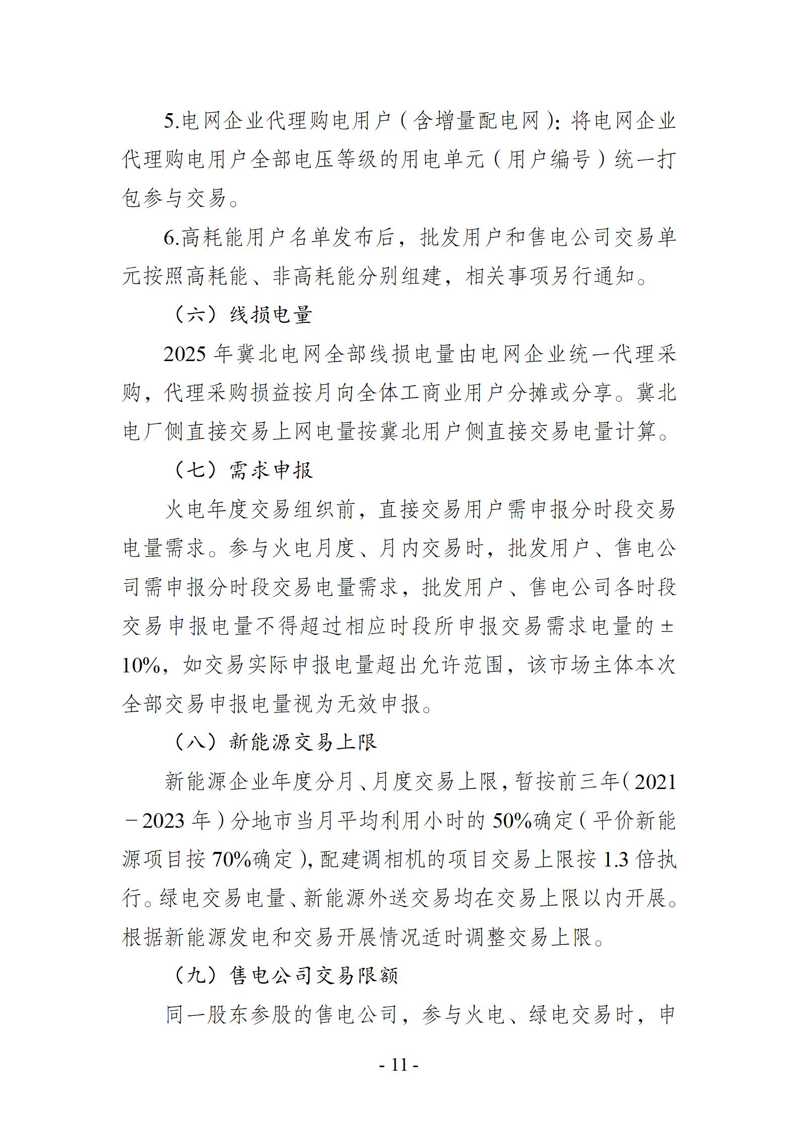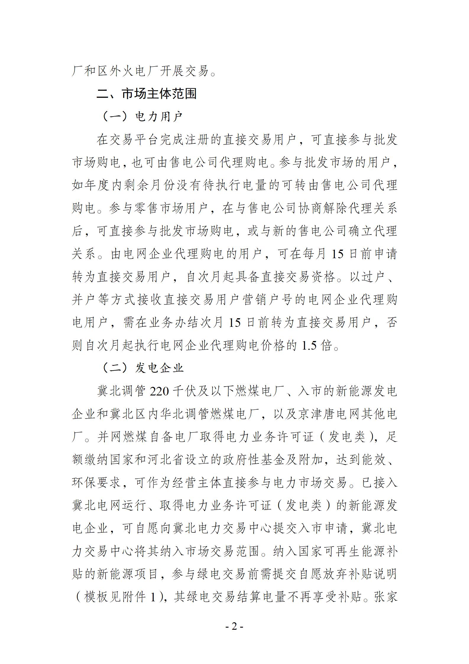 12月11日,河北省發(fā)展和改革委員會(huì)關(guān)于印發(fā)《冀北電網(wǎng)2025年電力中長期交易工作方案》的通知,通知指出,月度交易:按照雙邊協(xié)商方式組織,按照24個(gè)交易時(shí)段簽約,尖峰、峰、平、谷時(shí)段的加權(quán)均價(jià)應(yīng)符合峰谷電價(jià)比例浮動(dòng)要求,風(fēng)電、光伏發(fā)電企業(yè)根據(jù)實(shí)際發(fā)電特性申報(bào)分時(shí)段電量、電價(jià)。 月內(nèi)交易:按照雙邊協(xié)商方式組織,交易標(biāo)的為月內(nèi)剩余天數(shù)的24時(shí)段交易電量,按周(不含法定節(jié)假日)開市,按照24個(gè)交易時(shí)段簽約,尖峰、峰、平、谷時(shí)段的加權(quán)均價(jià)應(yīng)符合峰谷電價(jià)比例浮動(dòng)要求,風(fēng)電、光伏發(fā)電企業(yè)根據(jù)實(shí)際發(fā)電特性申報(bào)分時(shí)段電量、電價(jià)。 綠色電力交易合同轉(zhuǎn)讓、多年期綠色電力交易合同電量調(diào)整等交易,根據(jù)京電交市〔2024〕59號(hào)文按市場需求開展。 原文如下: 河北省發(fā)展和改革委員會(huì)關(guān)于印發(fā)《冀北電網(wǎng)2025年電力中長期交易工作方案》的通知 冀發(fā)改運(yùn)行[2024]1633號(hào) 承德、張家口、秦皇島、唐山、廊坊市發(fā)展改革委,張家口市能源局,北京電力交易中心有限公司、國家電網(wǎng)華北分部、國網(wǎng)冀北電力有限公司、冀北電力交易中心有限公司,大唐國際電力公司、華潤華北電力公司、省建投公司,各有關(guān)發(fā)電企業(yè)、電力用戶、售電公司: 為做好冀北電網(wǎng)2025年電力中長期交易工作,依據(jù)《中共中央 國務(wù)院關(guān)于進(jìn)一步深化電力體制改革的若干意見》(中發(fā)〔2015〕9號(hào))及其配套文件、《電力中長期交易基本規(guī)則》(發(fā)改能源規(guī)〔2020〕889號(hào))等文件要求,我委制定了《冀北電網(wǎng)2025年電力中長期交易工作方案》,現(xiàn)印發(fā)給你們,請遵照執(zhí)行。 河北省發(fā)展和改革委員會(huì) 2024年12月11日