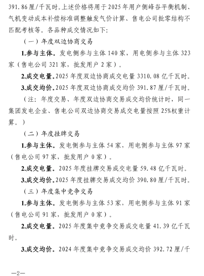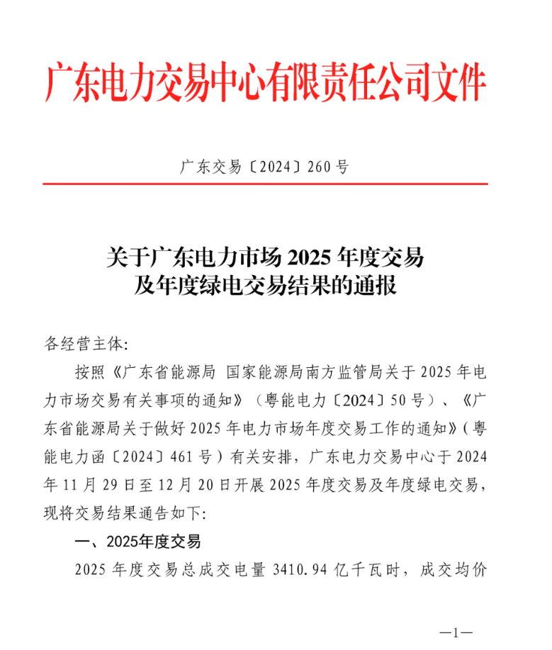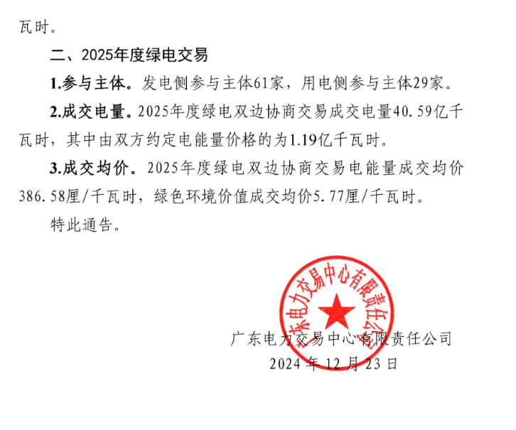 12月23日,廣東電力交易中心公布關于廣東電力市場2025年度交易及年度綠電交易結果的通報,2025年度交易總成交電量3410.94億千瓦時,成交均價391.86厘/千瓦時。 2025年度綠電交易 1.參與主體。發(fā)電側參與主體61家,用電側參與主體29家。 2.成交電量。2025年度綠電雙邊協(xié)商交易成交電量40.59億千瓦時,其中由雙方約定電能量價格的為1.19億千瓦時。 3.成交均價。2025年度綠電雙邊協(xié)商交易電能量成交均價386.58厘/千瓦時,綠色環(huán)境價值成交均價5.77厘/千瓦時。 詳情如下: