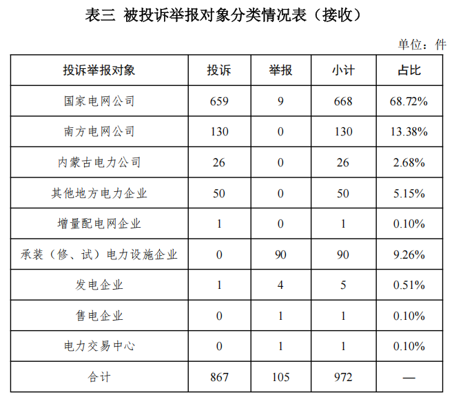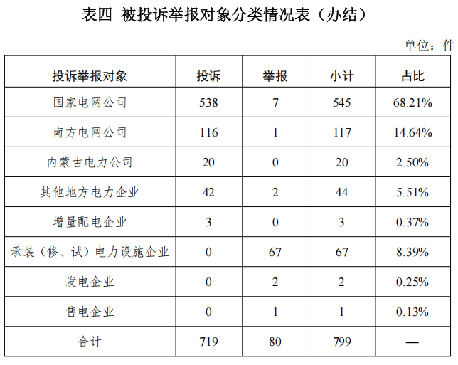 (二)地區(qū)分布情況 各省(自治區(qū)、直轄市)按照接收投訴舉報數(shù)量排序,山東、江蘇、四川、黑龍江、河北排在全國前5位。按百萬人均投訴舉報數(shù)量排序,海南,內(nèi)蒙,黑龍江,西藏,吉林排在全國前5位。(2024年11月全國接收投訴舉報地區(qū)分布情況見附件1) (三)主要問題 2024年11月,接收的投訴舉報主要反映了4個方面的問題。 1.用電報裝問題。部分供電企業(yè)在收到群眾電采暖、充電樁等用電報裝申請后,未按規(guī)定時限完成裝表接電。投訴舉報數(shù)量靠前的2個省份為內(nèi)蒙古(18件)、山東(14件)。 2.停電搶修問題。部分地區(qū)設(shè)備故障老化、催繳電費不及時,導(dǎo)致用戶停電,引發(fā)群眾投訴。相關(guān)投訴舉報數(shù)量靠前的2個省份為福建(12件)、重慶(12件)。 3.電能質(zhì)量問題。供電設(shè)施運維不到位或用電負荷激增,導(dǎo)致經(jīng)常停電和低電壓問題較多。相關(guān)投訴舉報數(shù)量靠前的2個省份為黑龍江(16件)、四川(13件)。 4.新能源和可再生能源行業(yè)相關(guān)問題。部分地區(qū)分布式光伏發(fā)電項目因當?shù)嘏_區(qū)容量不足等原因?qū)е虏⒕W(wǎng)困難。相關(guān)投訴舉報數(shù)量靠前的2個省份為江蘇(11件)、河北(10件)。 二、當月處理情況 (一)受理情況 2024年11月,根據(jù)國家有關(guān)法規(guī)政策規(guī)定,國家能源局派出機構(gòu)對屬于監(jiān)管職責范圍的879件投訴舉報進行了受理,占接收數(shù)量的90.43%;其他不予受理的,已按照國家有關(guān)法規(guī)政策規(guī)定及時轉(zhuǎn)辦。 (二)辦結(jié)情況 2024年11月,國家能源局派出機構(gòu)辦結(jié)投訴舉報799件(含往期結(jié)轉(zhuǎn)),同比下降8.99%、環(huán)比下降18.86%,累計辦結(jié)率99.12%。其中:投訴719件,同比下降4.52%、環(huán)比下降20.46%;舉報80件,同比下降36.51%、環(huán)比增長2.44%。 從被投訴舉報對象看,供電企業(yè)719件、占投訴舉報總數(shù)的89.99%,其中國家電網(wǎng)公司545件、占比68.21%,南方電網(wǎng)公司117件、占比14.64%,內(nèi)蒙古電力公司20件、占比2.50%,其他地方電力企業(yè)44件、占比5.51%,增量配電企業(yè)3件、占比0.37%;承裝(修、試)電力設(shè)施企業(yè)67件、占比8.39%;發(fā)電企業(yè)2件、占比0.25%;電力交易機構(gòu)1件、占比0.13%。