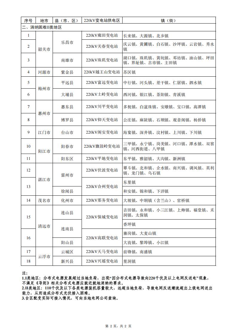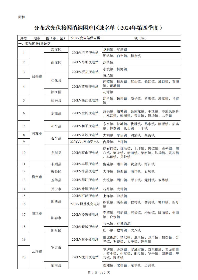 12月25日,廣東省能源局關(guān)于發(fā)布2024年第四季度接網(wǎng)消納困難區(qū)域名單及低壓配電網(wǎng)接網(wǎng)預(yù)警等級(jí)的公告。 公告指出,接網(wǎng)消納困難區(qū)域涉及韶關(guān)、河源、梅州、惠州、江門(mén)、陽(yáng)江、湛江、茂名、清遠(yuǎn)、云浮等10個(gè)地市共38個(gè)220kV變電站供電區(qū)。 對(duì)比2024年第三季度接網(wǎng)消納困難區(qū)域名單及低壓配電網(wǎng)接網(wǎng)預(yù)警等級(jí),地市增加了茂名、清遠(yuǎn)、云浮3各個(gè)地市,但220kV變電站供電區(qū)從40個(gè)減少到了38個(gè)。 原文如下: 廣東省能源局關(guān)于發(fā)布2024年第四季度接網(wǎng)消納困難區(qū)域名單及低壓配電網(wǎng)接網(wǎng)預(yù)警等級(jí)的公告 為引導(dǎo)分布式光伏合理布局、有序建設(shè),促進(jìn)源網(wǎng)協(xié)調(diào)發(fā)展,經(jīng)組織評(píng)估,現(xiàn)將我省2024年第四季度接網(wǎng)消納困難區(qū)域名單及低壓配電網(wǎng)接網(wǎng)預(yù)警等級(jí)予以公告。 一、接網(wǎng)消納困難區(qū)域名單 接網(wǎng)消納困難區(qū)域涉及韶關(guān)、河源、梅州、惠州、江門(mén)、陽(yáng)江、湛江、茂名、清遠(yuǎn)、云浮等10個(gè)地市共38個(gè)220kV變電站供電區(qū),具體名單見(jiàn)附件。 二、低壓配電網(wǎng)接網(wǎng)預(yù)警等級(jí) 按照《國(guó)家能源局綜合司關(guān)于印發(fā)開(kāi)展分布式光伏接入電網(wǎng)承載力及提升措施評(píng)估試點(diǎn)工作的通知》(國(guó)能綜通新能〔2023〕74號(hào)),經(jīng)評(píng)估,上述接網(wǎng)消納困難區(qū)域低壓配電網(wǎng)接網(wǎng)預(yù)警等級(jí)均為“受限”,其余區(qū)域低壓配電網(wǎng)接網(wǎng)預(yù)警等級(jí)均為“良好”或“一般”。具體低壓配電網(wǎng)可接入情況,可向電網(wǎng)公司查詢。 附件:分布式光伏接網(wǎng)消納困難區(qū)域名單(2024年第四季度) 廣東省能源局 2024年12月25日
