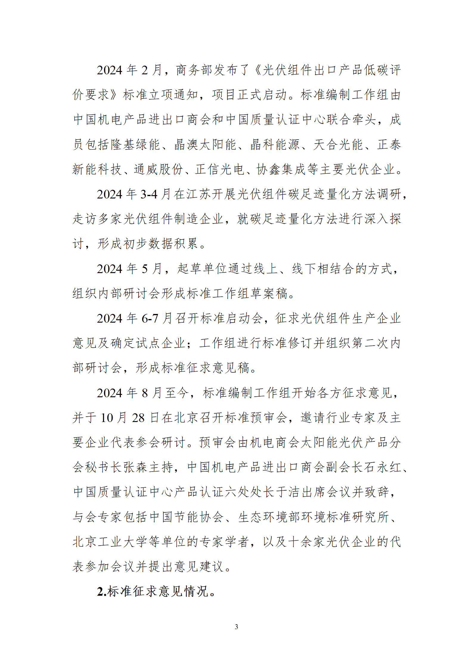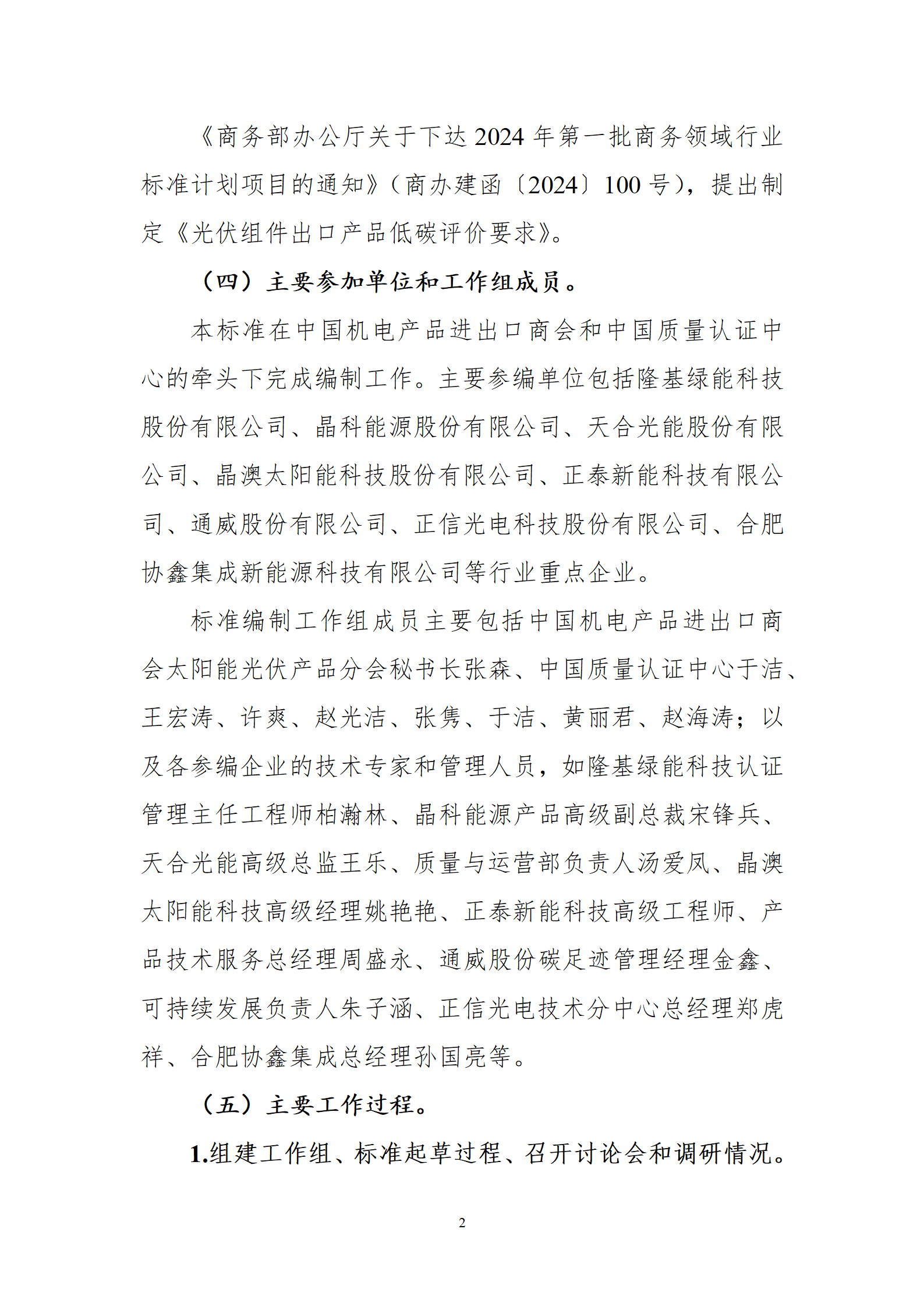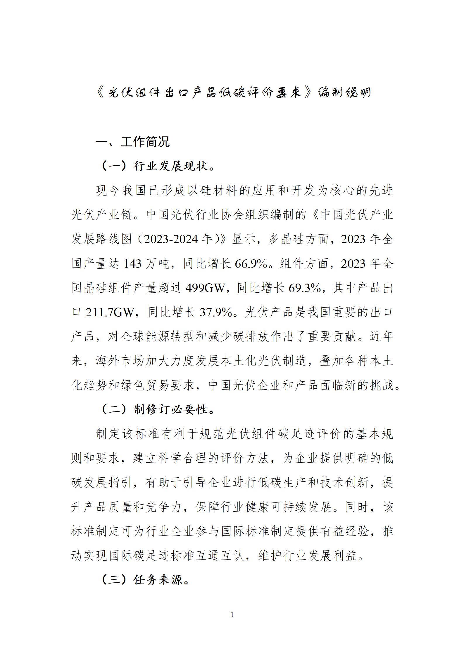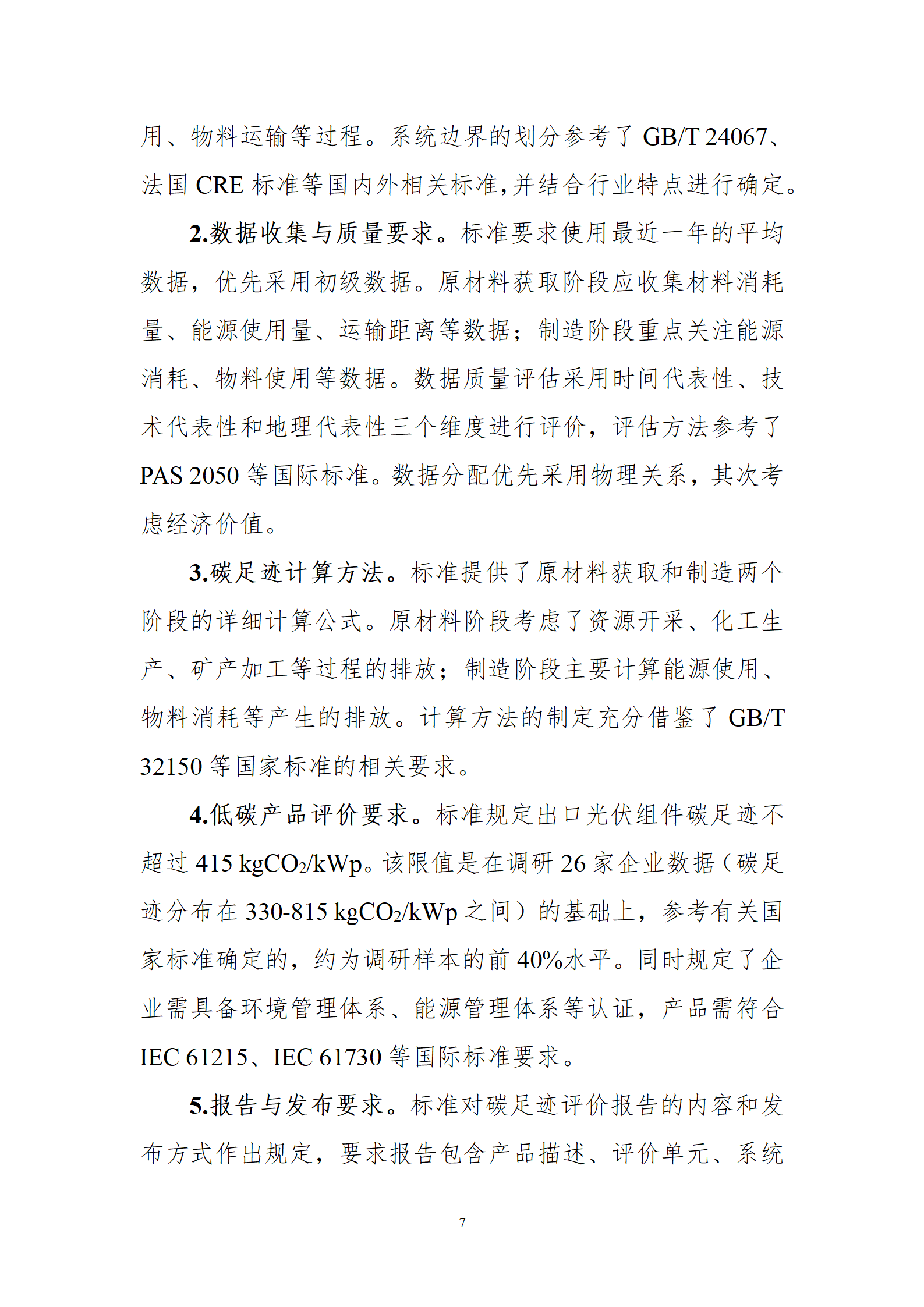 1月6日,商務(wù)部外貿(mào)司就《光伏組件出口產(chǎn)品低碳評價要求(征求意見稿)》行業(yè)標(biāo)準(zhǔn)公開征求意見,該文件規(guī)定了光伏組件碳足跡評價的功能單位、系統(tǒng)邊界、取舍準(zhǔn)則、數(shù)據(jù)和數(shù)據(jù)質(zhì)量、計算方法、數(shù)據(jù)質(zhì)量評估、低碳評價要求、產(chǎn)品碳足跡研究報告的一般原則和方法。文件適用于光伏組件出口產(chǎn)品的低碳評價。 全文如下: 公開征求《光伏組件出口產(chǎn)品低碳評價要求(征求意見稿)》行業(yè)標(biāo)準(zhǔn)意見 根據(jù)商務(wù)部相關(guān)行業(yè)標(biāo)準(zhǔn)項目計劃,中國機電產(chǎn)品進(jìn)出口商會編制完成《光伏組件出口產(chǎn)品低碳評價要求》行業(yè)標(biāo)準(zhǔn)征求意見稿,現(xiàn)公開征求意見。如有意見建議,請?zhí)顚憽兑庖姺答伇怼?,并?025年2月6日前以電子郵件形式反饋至中國機電產(chǎn)品進(jìn)出口商會。 聯(lián) 系 人:中國機電產(chǎn)品進(jìn)出口商會 張森 電 話:13426331987 電子郵箱:zhangsen@cccme.org.cn 附件:1.光伏組件出口產(chǎn)品低碳評價要求(征求意見稿) 2.《光伏組件出口產(chǎn)品低碳評價要求(征求意見稿)》編制說明 3.意見反饋表 商務(wù)部外貿(mào)司 2025年1月6日