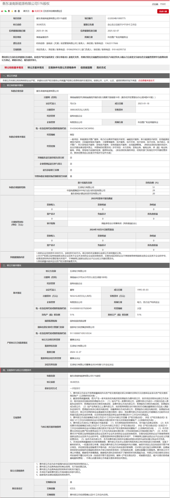 近日,國家電投的控股子公司五凌電力有限公司轉讓衡東凌南新能源有限公司51%股權,轉讓底價30.00萬元。 衡東凌南新能源有限公司成立于2023年1月18日,注冊資本3000萬元,由五凌電力有限公司控股51%,經營范圍包括一般項目:新能源技術推廣服務;電力行業(yè)高效節(jié)能技術研發(fā);儲能技術服務;新興能源技術研發(fā);在線能源監(jiān)測技術研發(fā);太陽能發(fā)電技術服務等。