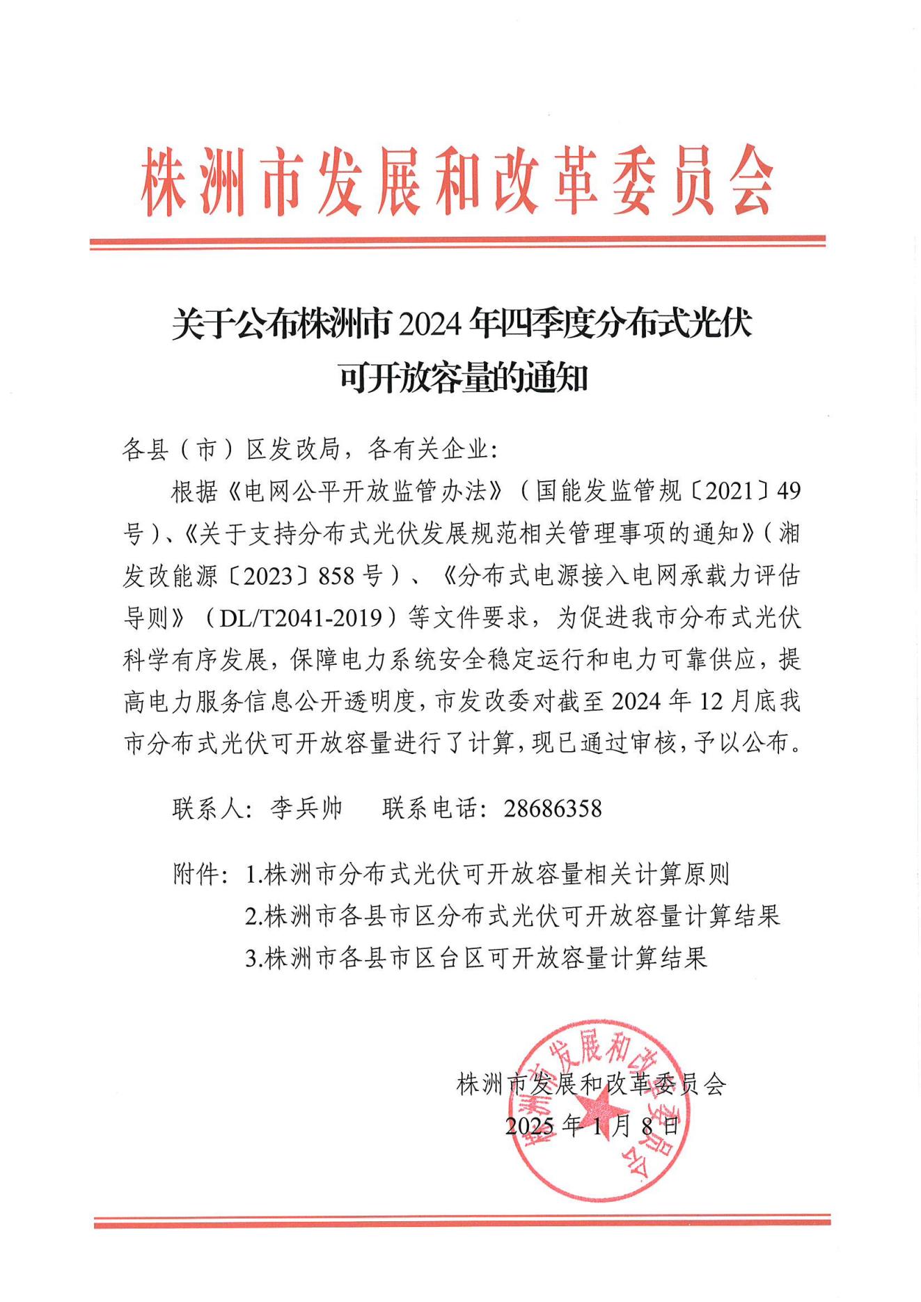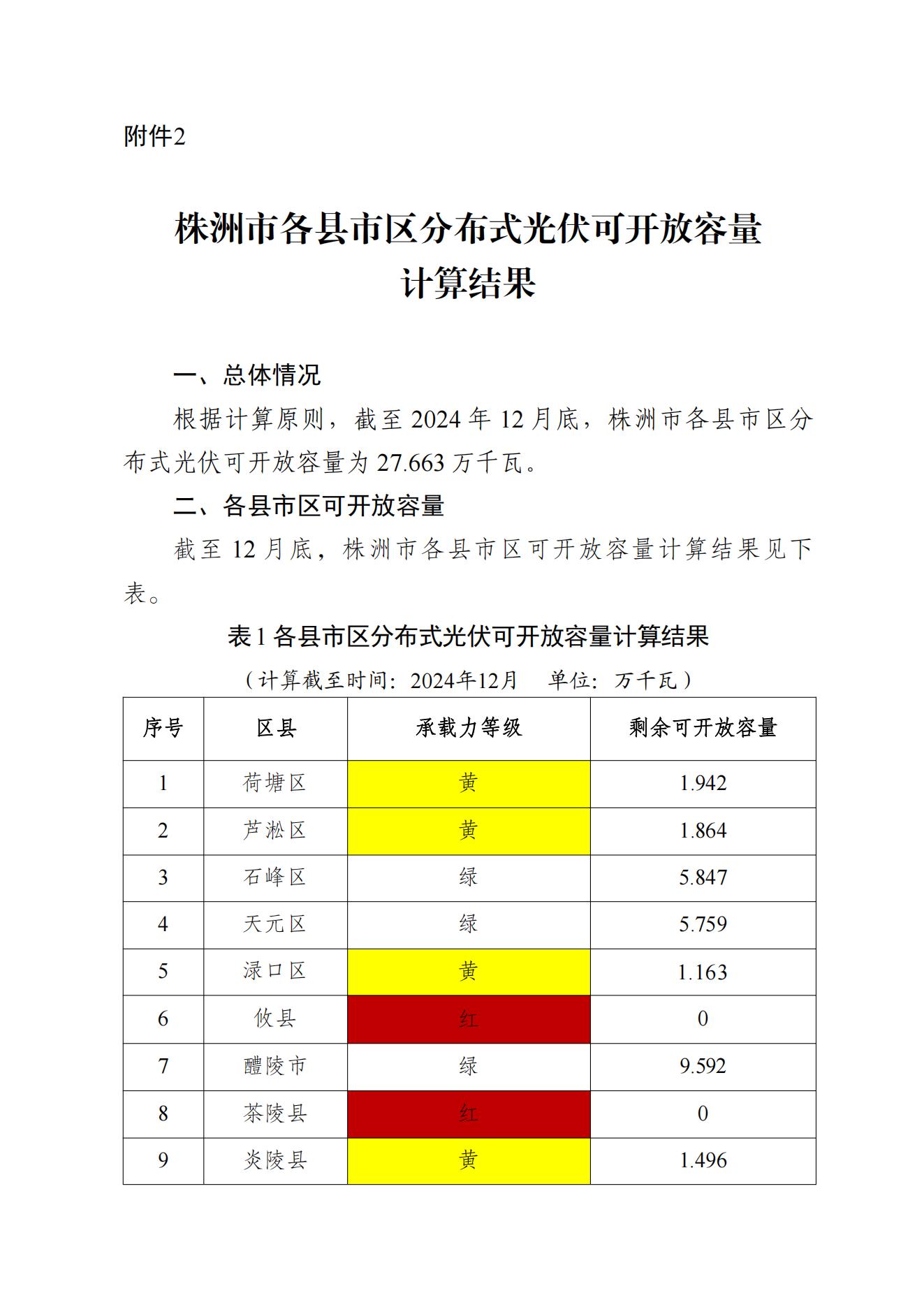 湖南株洲市發(fā)改委公布2024年四季度分布式光伏可開放容量的通知,通知顯示,截至2024年12月底,株洲市各縣市區(qū)分布式光伏可開放容量為27.663萬千瓦。 具體到各縣市區(qū),攸縣、茶陵縣分布式光伏可開放容量紅評(píng)估等級(jí)為紅色;荷塘區(qū)、蘆淞區(qū)、淥口區(qū)、炎陵縣分布式光伏可開放容量紅評(píng)估等級(jí)為黃色;石峰區(qū)、天元區(qū)、醴陵市分布式光伏可開放容量紅評(píng)估等級(jí)為綠色。 詳情如下: