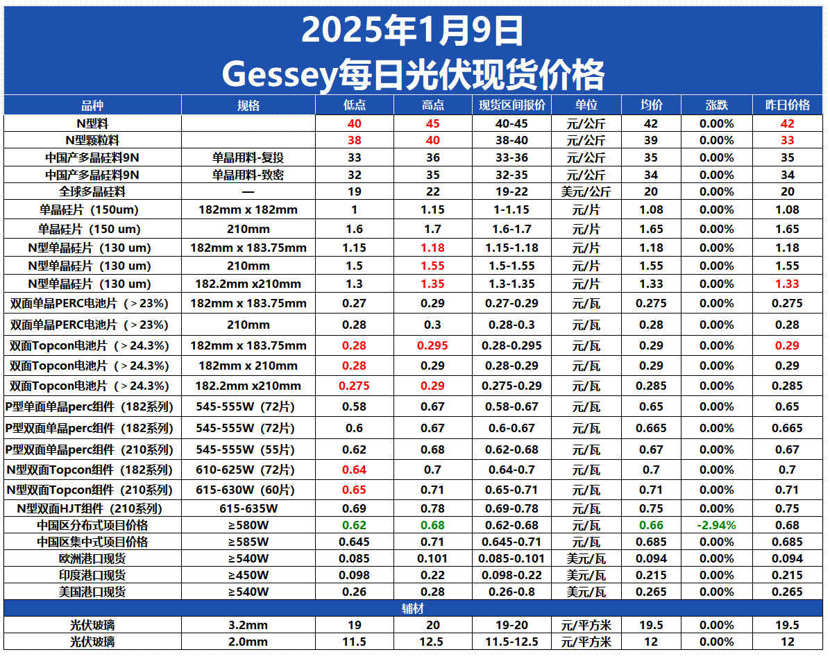 Gessey:1月9日每日光伏市場(chǎng)行情2025-01-09 18:20來(lái)源:gessey瀏覽數(shù):380次