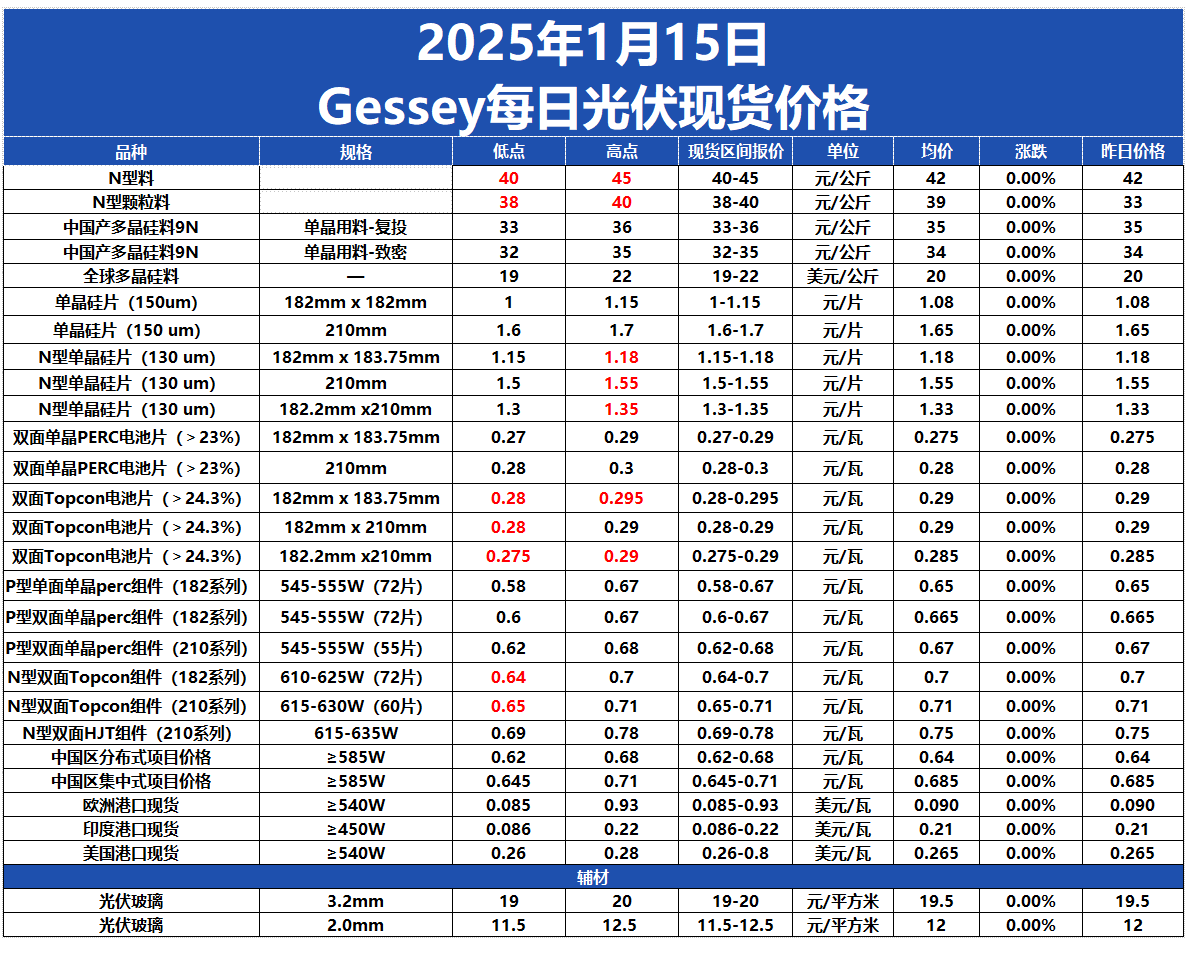 Gessey:1月15日每日光伏市場行情2025-01-15 17:25來源:gessey瀏覽數(shù):345次