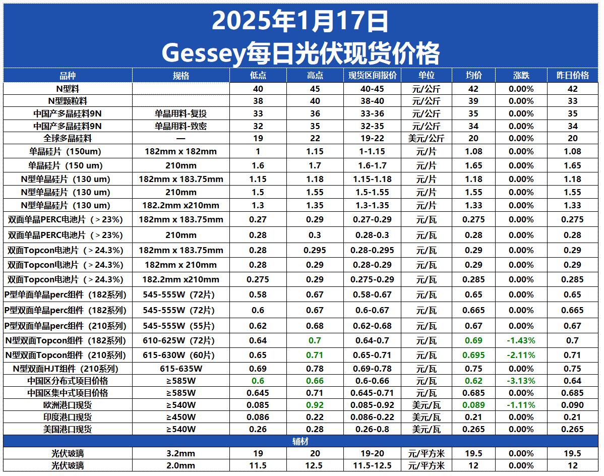 Gessey:1月17日每日光伏市場行情2025-01-17 17:37來源:gessey瀏覽數(shù):171次