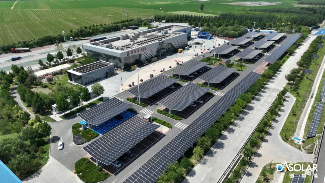 交通篇 向綠而行 引領(lǐng)零碳交通潮流 在高速服務(wù)區(qū)光伏應(yīng)用的創(chuàng)新實(shí)踐中,一道新能秉持高效、美觀、便捷的設(shè)計(jì)理念,推出基于柔性光伏支架的系統(tǒng)解決方案。憑借“大跨度、高凈空、廣覆蓋”的特點(diǎn),柔性支架系統(tǒng)適配服務(wù)區(qū)邊坡、停車場(chǎng)、充換電站等多樣場(chǎng)景,提供15-35米大跨距、8-10米凈空的定制化解決方案。其中,大中型車輛專用的柔性鋼構(gòu)光伏車棚,保障車輛便捷通行與高效停放;結(jié)構(gòu)緊湊的V字型柔性車棚,專為小型車設(shè)計(jì),集功能性與美觀性于一體;而出入匝道、邊坡及換電站等周邊受限區(qū)域,也可通過(guò)靈活布置的多樣化支架方案實(shí)現(xiàn)光伏最大化地覆蓋。 在山東省,一道新能攜手山東高速,共同開發(fā)建設(shè)了青銀高速濟(jì)南東服務(wù)區(qū)項(xiàng)目。結(jié)合服務(wù)區(qū)不同區(qū)域的特性,項(xiàng)目創(chuàng)新性地應(yīng)用了大跨距柔性支架系統(tǒng),成功打造出國(guó)內(nèi)首個(gè)“零碳服務(wù)區(qū)”,為綠色交通建設(shè)樹立了典范。