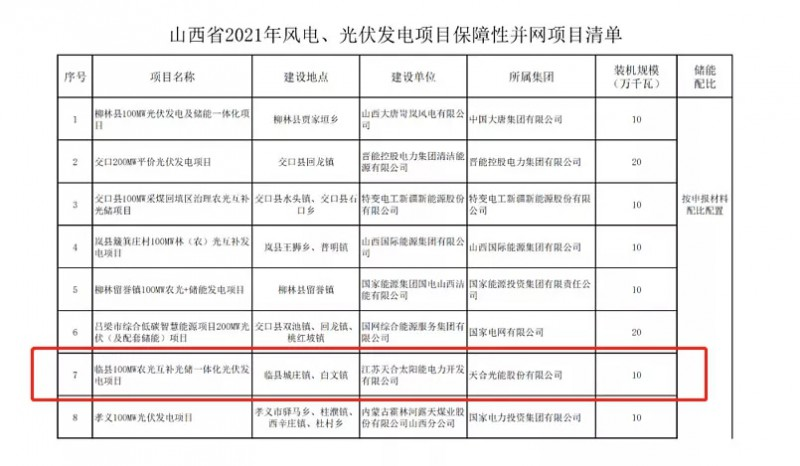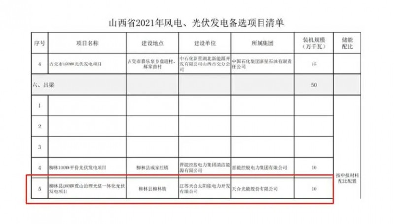 近日,山西省能源局下發(fā)了上報項目的評選結(jié)果,共選出11.2GW的保障性規(guī)模,5.9GW的備選規(guī)模。天合光能自主申報獲臨縣100MW農(nóng)光互補(bǔ)光儲一體化光伏發(fā)電項目保障性并網(wǎng)項目指標(biāo)、柳林縣100MW荒山治理光儲一體化光伏發(fā)電項目備選項目指標(biāo)。