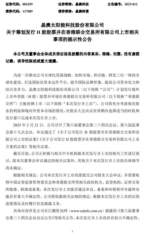 2月21日晚間,晶澳科技發(fā)布公告稱(chēng),公司計(jì)劃發(fā)行境外上市外資股(H股)股票并申請(qǐng)?jiān)谙愀勐?lián)交所主板掛牌上市。 晶澳科技表示,為進(jìn)一步推動(dòng)公司全球化發(fā)展戰(zhàn)略,加快市場(chǎng)、供應(yīng)鏈、研發(fā)三位一體的全球化建設(shè),打造國(guó)際化資本運(yùn)作平臺(tái),提升國(guó)際品牌形象,提高公司資本實(shí)力和綜合競(jìng)爭(zhēng)力,晶澳太陽(yáng)能科技股份有限公司計(jì)劃發(fā)行境外上市外資股(H股)股票,并申請(qǐng)?jiān)谙愀勐?lián)合交易所有限公司主板掛牌上市。 對(duì)于本次上市的募集資金,晶澳科技表示將主要用于公司全球化戰(zhàn)略用途,包括但不限于:推進(jìn)全球海外產(chǎn)能建設(shè)和全球化營(yíng)銷(xiāo)網(wǎng)絡(luò)建設(shè)、加大全球化研發(fā)與技改投入、提升公司數(shù)字化和智能化能力、優(yōu)化資本結(jié)構(gòu)、補(bǔ)充營(yíng)運(yùn)資金及其他一般公司用途。