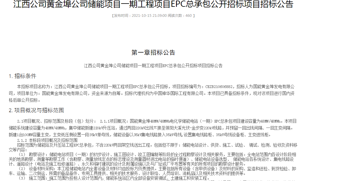儲(chǔ)能招標(biāo)丨48MW/48MWh!江西黃金埠公司儲(chǔ)能項(xiàng)目一期工程項(xiàng)目EPC總承包2021-10-18 13:33瀏覽數(shù):7次