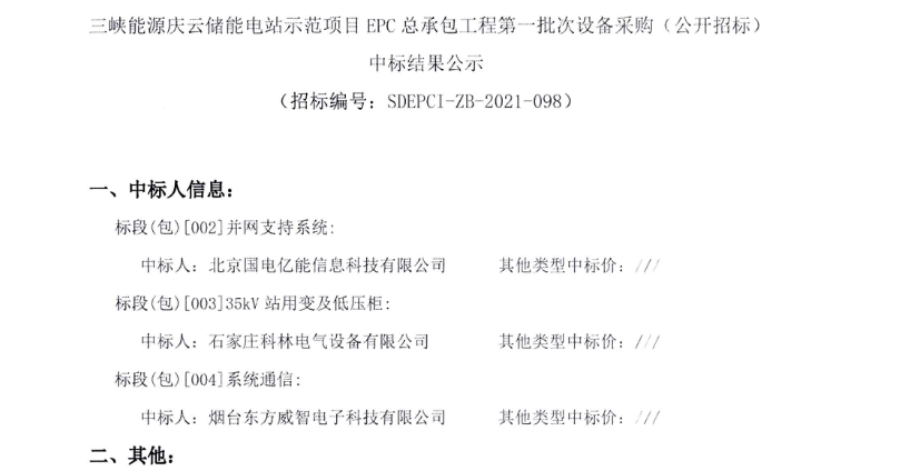 三峽能源慶云儲(chǔ)能電站示范項(xiàng)目EPC總承包發(fā)布了中標(biāo)結(jié)果公示,并網(wǎng)支持系統(tǒng)中標(biāo)人為北京國電億能信息科技有限公司;35KV站用變及低壓柜中標(biāo)人為石家莊科林電氣設(shè)備有限公司;系統(tǒng)通信中標(biāo)人為煙臺(tái)東方威智電子科技有限公司。