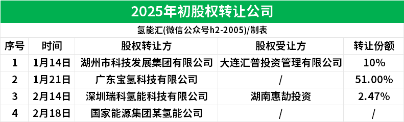股權(quán)轉(zhuǎn)讓帶來新的發(fā)的機(jī)遇 除了資本大額融資外,還有4家公司進(jìn)行了股權(quán)轉(zhuǎn)讓。 1月14日:國科綠氫(湖州)科技有限公司 10% 股權(quán)完成轉(zhuǎn)讓,受讓方為大連匯普投資管理有限公司,轉(zhuǎn)讓方為湖州市科技發(fā)展集團(tuán)有限公司。 1月21日:廣東寶氫科技有限公司的 51% 股權(quán)正式掛牌轉(zhuǎn)讓,寶武清潔能源有限公司擬轉(zhuǎn)讓其持有的 26.5% 股權(quán),廣東中南鋼鐵股份有限公司擬轉(zhuǎn)讓其持有的 24.5% 股權(quán)。 2月14日:深圳市瑞麟科技有限公司完成 2.47% 的股權(quán)轉(zhuǎn)讓,出讓方為深圳瑞科氫能科技有限公司,受讓方為湖南惠劼投資。 2月18日:國能 e 購網(wǎng)站發(fā)布《氫能科技公司擬轉(zhuǎn)讓某氫能源公司股權(quán)資產(chǎn)評估服務(wù)詢價采購》公告,國家能源集團(tuán)氫能科技有限責(zé)任公司擬轉(zhuǎn)讓某氫能源公司股權(quán)。