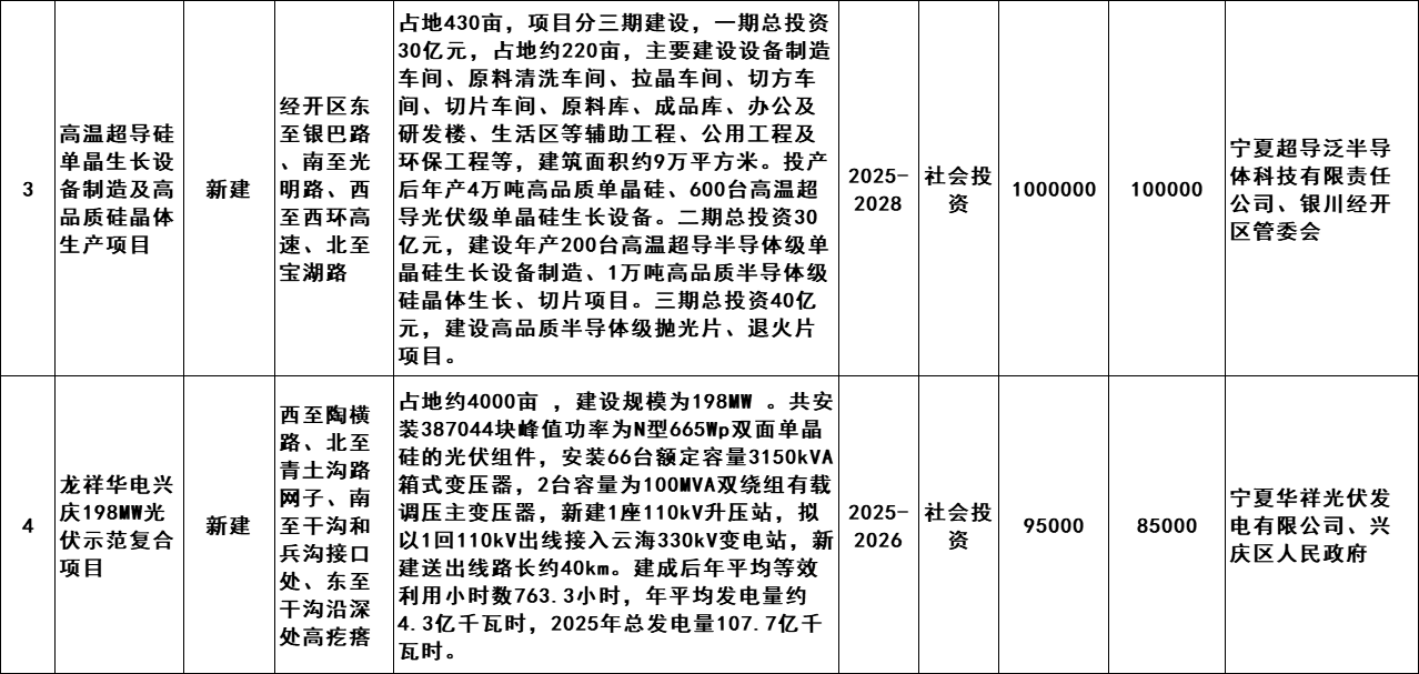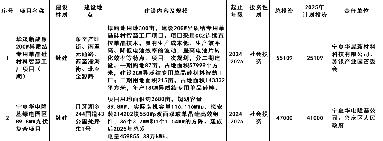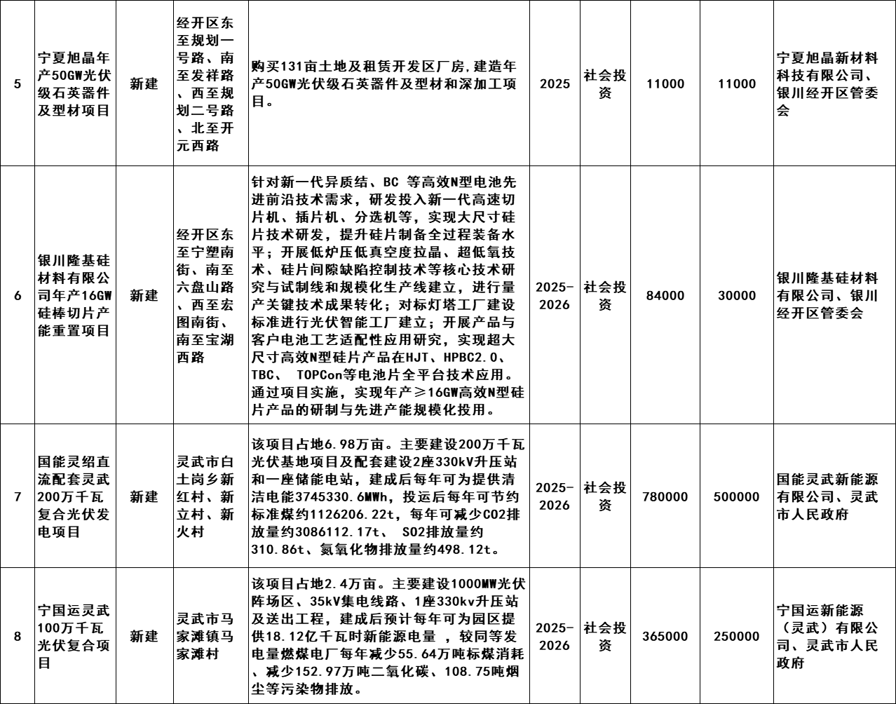 2月18日,銀川市人民政府辦公室關(guān)于印發(fā)《2025年銀川市重點建設(shè)項目投資計劃》的通知,通知指出,光伏重點項目8個,規(guī)模達(dá)到3.29GW,其中續(xù)建項目2個,分別為華晟新能源20GW異質(zhì)結(jié)專用單晶硅材料智慧工廠項目(一期)、寧夏華電隆基綠電園區(qū)89.8MW光伏復(fù)合項目;新建項目6個,規(guī)模達(dá)到3.2GW,包括國能靈紹直流配套靈武200萬千瓦復(fù)合光伏發(fā)電項目、寧國運(yùn)靈武100萬千瓦光伏復(fù)合項目、龍祥華電興慶198MW光伏示范復(fù)合項目、寧夏旭晶年產(chǎn)50GW光伏級石英器件及型材項目、銀川隆基硅材料有限公司年產(chǎn)16GW硅棒切片產(chǎn)能重置項目、高溫超導(dǎo)硅單晶生長設(shè)備制造及高品質(zhì)硅晶體生產(chǎn)項目。 原文如下: 銀川市人民政府辦公室關(guān)于印發(fā) 《2025年銀川市重點建設(shè)項目投資計劃》的通知 銀政辦發(fā)〔2025〕13號 各縣(市)區(qū)人民政府,市政府各部門、各直屬機(jī)構(gòu): 經(jīng)市委、市政府研究同意,現(xiàn)將《2025年銀川市重點建設(shè)項目投資計劃》印發(fā)實施,請認(rèn)真抓好落實。 一、抓好項目組織實施。各縣(市)區(qū)、園區(qū)及市直相關(guān)部門要強(qiáng)化責(zé)任意識,對標(biāo)項目年度建設(shè)目標(biāo)抓好責(zé)任細(xì)化分解和督促落實。全面實行市級領(lǐng)導(dǎo)包抓重點項目工作機(jī)制,統(tǒng)籌推動項目建設(shè)。各項目責(zé)任單位要嚴(yán)格落實主體責(zé)任,逐項目制定推進(jìn)計劃,全力推動市重點項目全年投資完成率達(dá)到100%以上。 二、抓好項目要素保障。堅持“要素跟著項目走”,各級發(fā)改、財政、自然資源、生態(tài)環(huán)境、住建、審批等要素資源保障部門,主動對接市重點項目需求,強(qiáng)化服務(wù)指導(dǎo),全力保障項目建設(shè)用地、用能、用工等資源要素供給,為項目加快建設(shè)提供有力保障。要堅持問題導(dǎo)向,緊盯項目前期手續(xù)辦理、開工復(fù)工、投資完成、入庫入統(tǒng)等情況,及時幫助項目單位解決制約項目建設(shè)中的難點堵點,保障項目有序建設(shè)。 三、抓好項目調(diào)度服務(wù)。各項目責(zé)任單位于每月28日前,將當(dāng)月項目開復(fù)工情況、投資完成情況、工程形象進(jìn)度、存在困難問題等情況報送市發(fā)改委。市發(fā)改委要加強(qiáng)監(jiān)測調(diào)度,結(jié)合現(xiàn)場調(diào)研情況,對項目推進(jìn)過程中存在的困難問題,及時交辦、分辦。各縣(市)區(qū)、園區(qū)及市直相關(guān)部門推進(jìn)重點項目建設(shè)情況,作為年度擴(kuò)大精準(zhǔn)有效投資和重大項目建設(shè)考核的重要依據(jù)。銀川市重點項目實行動態(tài)管理,由市發(fā)改委適時組織開展項目調(diào)整工作。 附件:2025年銀川市重點建設(shè)項目投資計劃(光伏) 銀川市人民政府辦公室 2025年2月11日 (此件公開發(fā)布)