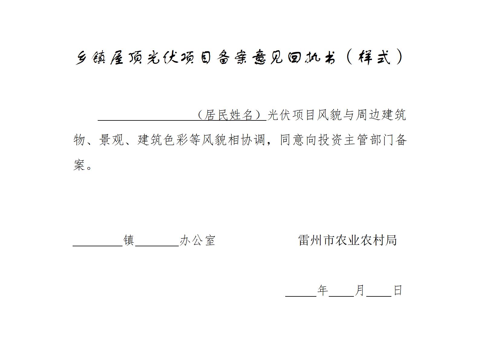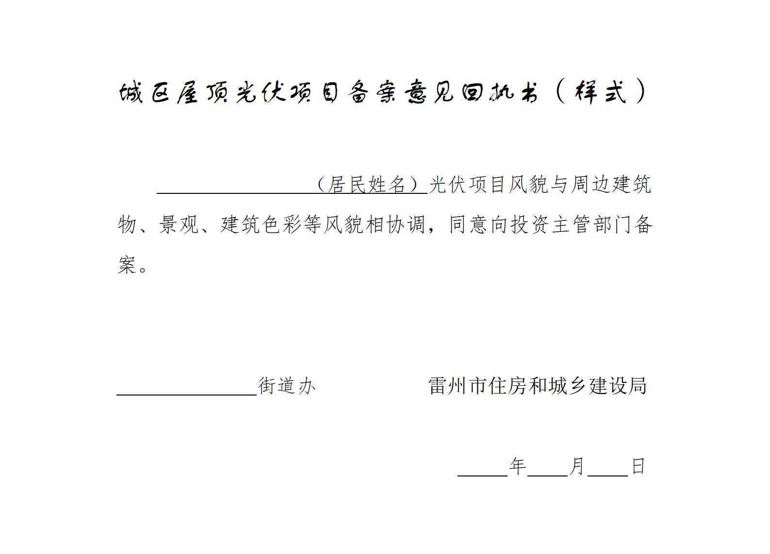 日前,廣東雷州市住房和城鄉(xiāng)建設(shè)局、雷州市發(fā)展和改革局、雷州市科工貿(mào)和信息化局、雷州市農(nóng)業(yè)農(nóng)村局關(guān)于進一步加強“光伏+建筑”風(fēng)貌管控的通知,通知指出,屋頂光伏項目應(yīng)按照“誰投資、誰備案”的原則進行報裝備案。備案前應(yīng)將所建設(shè)的屋頂光伏項目整理形成項目清單,向屋頂光伏項目所在村(居)委會初審,初審?fù)ㄟ^后將擬建屋頂光伏風(fēng)貌的設(shè)計圖紙及效果圖報送屬地鎮(zhèn)政府(街道辦)進行帶圖審查,其中各鎮(zhèn)轄區(qū)范圍內(nèi)的屋頂光伏項目再向市農(nóng)業(yè)農(nóng)村局審查,各街道辦轄區(qū)范圍內(nèi)的向市住建局審查,經(jīng)審查通過蓋章后向投資主管部門報裝備案。 屋頂光伏項目驗收由建設(shè)單位組織,設(shè)計、施工、監(jiān)理(若有)等單位派代表參加,同時應(yīng)邀請房屋業(yè)主參加。項目驗收通過后,建設(shè)單位應(yīng)向供電主管部門提出并網(wǎng)驗收,驗收合格后轉(zhuǎn)入并網(wǎng)運行。 原文如下: 雷州市住房和城鄉(xiāng)建設(shè)局、雷州市發(fā)展和改革局、雷州市科工貿(mào)和信息化局、雷州市農(nóng)業(yè)農(nóng)村局關(guān)于進一步加強“光伏+建筑”風(fēng)貌管控的通知 各有關(guān)單位: 為貫徹落實《雷州市“光伏+建筑”應(yīng)用試點工作實施方案》,切實規(guī)范我市屋頂分布式光伏建設(shè),促進城鄉(xiāng)建筑風(fēng)貌提升,根據(jù)《廣東省縣域“光伏+建筑”應(yīng)用試點工作指引(第一版)》(粵建科〔2024〕256號)、《廣東省人民政府關(guān)于全面推進農(nóng)房管控和鄉(xiāng)村風(fēng)貌提升的指導(dǎo)意見》(粵府2020〕43號)、《雷州市人民政府關(guān)于印發(fā)雷州市農(nóng)村宅基地和住宅建設(shè)管理暫行辦法的通知》(雷府規(guī)〔2022〕2號)文件精神,為進一步加強我市“光伏+建筑”城鄉(xiāng)建筑風(fēng)貌管控工作,現(xiàn)通知如下。 一、加強屋頂光伏風(fēng)貌管控 (一)屋頂光伏應(yīng)按照“適用、經(jīng)濟、綠色、美觀”的原則進行設(shè)計和建設(shè)。 (二)屋頂光伏建設(shè)應(yīng)與周邊建筑、人文景觀風(fēng)貌相協(xié)調(diào),根據(jù)安裝高度采取不同的風(fēng)貌協(xié)調(diào)措施。光伏組件突出屋面時,采用雙坡、四面坡式設(shè)計,要根據(jù)建筑風(fēng)格和外墻顏色選取與建筑本體色彩協(xié)調(diào)的光伏系統(tǒng)邊框等材料,綜合利用纖維板或格柵構(gòu)、檐口設(shè)計等方式對建筑外立面進行改造提升,形成較為完整的建筑形象。 (三)屋頂光伏風(fēng)貌管控應(yīng)分類管控重點區(qū)域和一般區(qū)域,我市“光伏+建筑”應(yīng)用試點鎮(zhèn)和試點村原則上按照重點區(qū)域的風(fēng)貌要求進行管控。①一般區(qū)域宜采用雙坡式、四面坡式設(shè)計,按照整潔、協(xié)調(diào)、美觀的基本要求開展光伏建設(shè),保持建筑立面的統(tǒng)一性、連續(xù)性和視覺景觀的完整性。 ②重點區(qū)域除落實對一般區(qū)域的要求外,應(yīng)進一步在山墻、檐口、屋脊、女兒墻、門窗等建筑構(gòu)件中融入鮮明文化特征的元素,充分體現(xiàn)雷州文化特色。(重點區(qū)域包括城鎮(zhèn)入口通道、城鎮(zhèn)主干街道、圩鎮(zhèn)客廳、商業(yè)中心、綠道碧道、公園、國省道沿線、歷史文化名鎮(zhèn)名村和特色村莊。) (四)屋頂光伏宜采用坡屋頂形式。既有建筑為坡屋面時應(yīng)順坡安裝,組件不應(yīng)超過該安裝屋面的最高點,組件方針表面與安裝屋面盡量貼合。既有建筑為平屋頂時,屋頂光伏組件坡度一般不小于10度。考慮晾曬、水箱放置等需求,設(shè)置部分開敞空間。 (五)屋頂光伏發(fā)電系統(tǒng)加裝高度從屋面起算最高點不宜超過2.8米。屋頂有樓梯間且需在樓梯間屋頂安裝光伏組件時,最高點不高于樓梯間屋面1.0米。樓梯間與屋面的光伏組件宜分級分層設(shè)計,避免出現(xiàn)屋頂體量過大,與建筑風(fēng)貌不協(xié)調(diào)的現(xiàn)象。 二、加強屋頂光伏報裝備案、并網(wǎng)驗收管理 (一)屋頂光伏項目應(yīng)按照“誰投資、誰備案”的原則進行報裝備案。備案前應(yīng)將所建設(shè)的屋頂光伏項目整理形成項目清單,向屋頂光伏項目所在村(居)委會初審,初審?fù)ㄟ^后將擬建屋頂光伏風(fēng)貌的設(shè)計圖紙及效果圖報送屬地鎮(zhèn) 政府(街道辦)進行帶圖審查,其中各鎮(zhèn)轄區(qū)范圍內(nèi)的屋頂光伏項目再向市農(nóng)業(yè)農(nóng)村局審查,各街道辦轄區(qū)范圍內(nèi)的向市住建局審查,經(jīng)審查通過蓋章后向投資主管部門報裝備案。 (二)屋頂光伏項目驗收由建設(shè)單位組織,設(shè)計、施工、監(jiān)理(若有)等單位派代表參加,同時應(yīng)邀請房屋業(yè)主參加。項目驗收通過后,建設(shè)單位應(yīng)向供電主管部門提出并網(wǎng)驗收,驗收合格后轉(zhuǎn)入并網(wǎng)運行。 附件:1.雷州市屋頂光伏審批與管控流程圖 2.雷州市“光伏建筑”項目清單 3.屋頂光伏項目備案承諾書(樣式) 4.鄉(xiāng)鎮(zhèn)屋頂光伏項目備案意見回執(zhí)書(樣式) 5.城區(qū)屋頂光伏項目備案意見回執(zhí)書(樣式) 雷州市住房和城鄉(xiāng)建設(shè)局 雷州市農(nóng)業(yè)農(nóng)村局 雷州市發(fā)展和改革局 雷州市科工貿(mào)和信