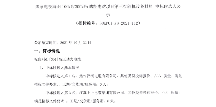 國(guó)家電投海陽(yáng)100MW/200MWh儲(chǔ)能電站項(xiàng)目第三批輔機(jī)設(shè)備材料發(fā)布了中標(biāo)候選人公示,中標(biāo)候選人分別為焦作漢河電纜有限公司,江蘇上上電纜集團(tuán)有限公司。