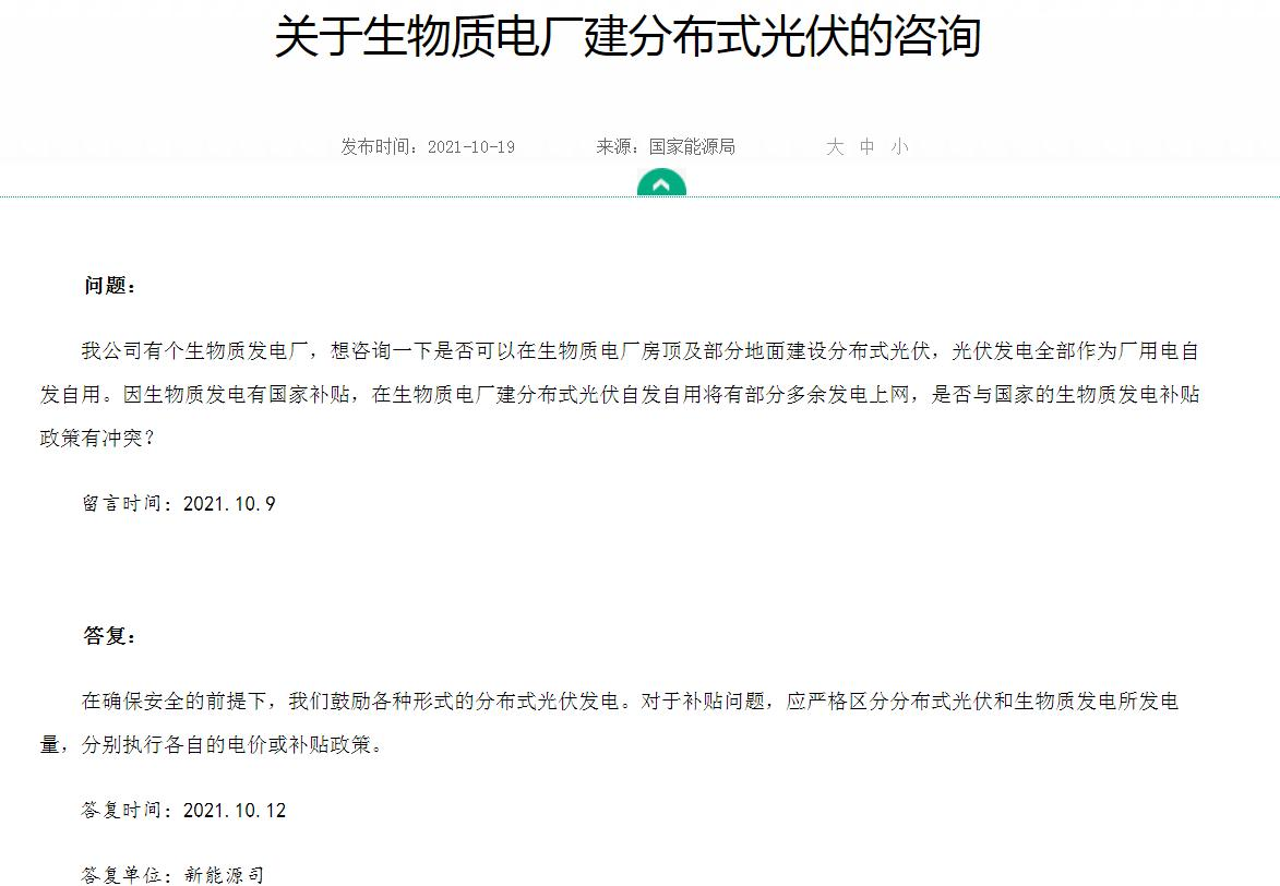 近日,有網(wǎng)友在國(guó)家能源局網(wǎng)站咨詢“生物質(zhì)電廠建分布式光伏”的補(bǔ)貼政策等問題,國(guó)家能源局新能源司表示應(yīng)嚴(yán)格區(qū)分分布式光伏和生物質(zhì)發(fā)電所發(fā)電量,分別執(zhí)行各自的電價(jià)或補(bǔ)貼政策。詳情如下: 網(wǎng)友問題: 我公司有個(gè)生物質(zhì)發(fā)電廠,想咨詢一下是否可以在生物質(zhì)電廠房頂及部分地面建設(shè)分布式光伏,光伏發(fā)電全部作為廠用電自發(fā)自用。因生物質(zhì)發(fā)電有國(guó)家補(bǔ)貼,在生物質(zhì)電廠建分布式光伏自發(fā)自用將有部分多余發(fā)電上網(wǎng),是否與國(guó)家的生物質(zhì)發(fā)電補(bǔ)貼政策有沖突? 留言時(shí)間:2021.10.9 國(guó)家能源局新能源司答復(fù): 在確保安全的前提下,我們鼓勵(lì)各種形式的分布式光伏發(fā)電。對(duì)于補(bǔ)貼問題,應(yīng)嚴(yán)格區(qū)分分布式光伏和生物質(zhì)發(fā)電所發(fā)電量,分別執(zhí)行各自的電價(jià)或補(bǔ)貼政策。 答復(fù)時(shí)間:2021.10.12 答復(fù)單位:新能源