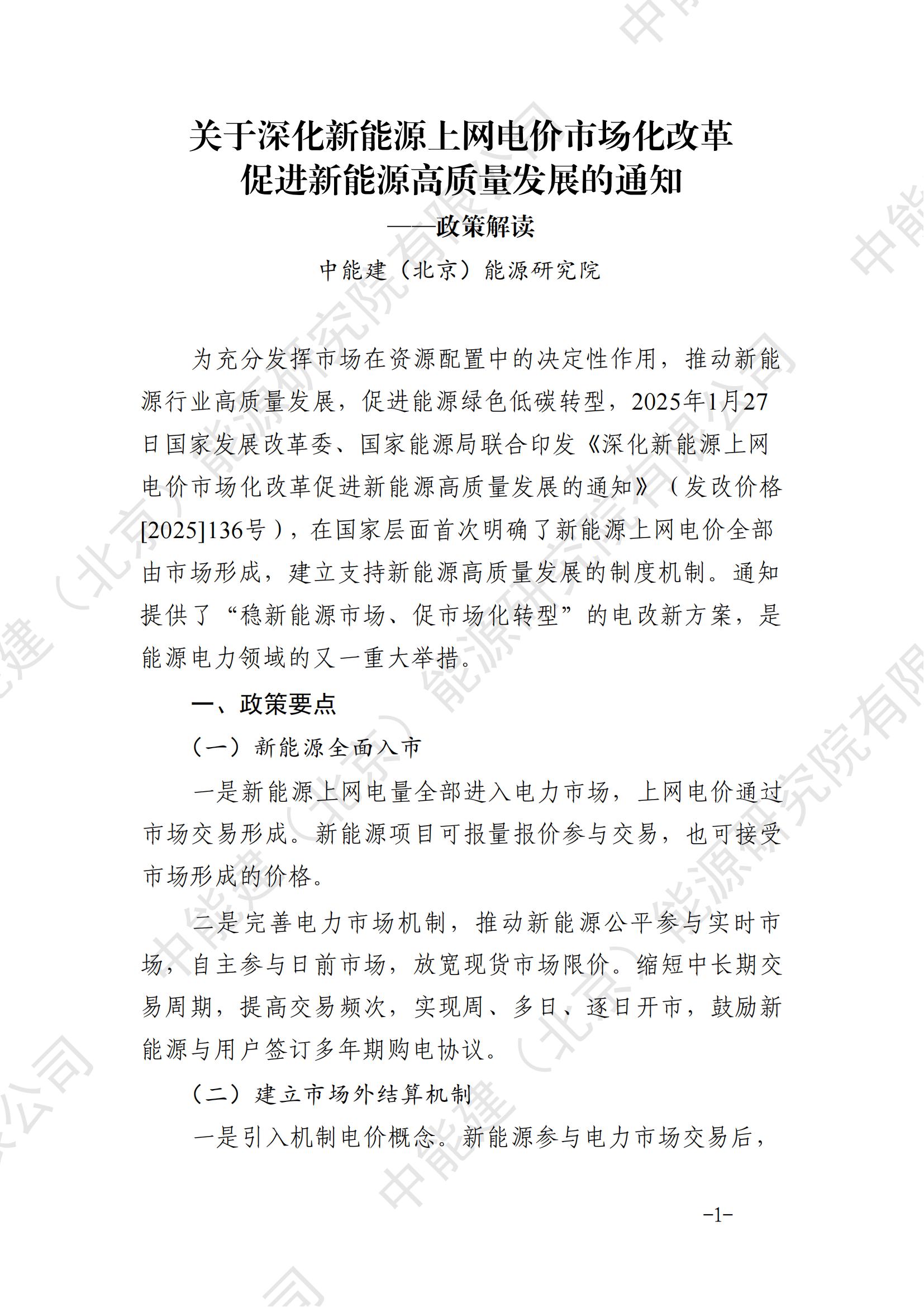 為充分發(fā)揮市場在資源配置中的決定性作用,推動(dòng)新能源行業(yè)高質(zhì)量發(fā)展,促進(jìn)能源綠色低碳轉(zhuǎn)型,2025年1月27日國家發(fā)展改革委、國家能源局聯(lián)合印發(fā)《深化新能源上網(wǎng)電價(jià)市場化改革促進(jìn)新能源高質(zhì)量發(fā)展的通知》(發(fā)改價(jià)格[2025]136號(hào)),在國家層面首次明確了新能源上網(wǎng)電價(jià)全部由市場形成,建立支持新能源高質(zhì)量發(fā)展的制度機(jī)制。通知提供了“穩(wěn)新能源市場、促市場化轉(zhuǎn)型”的電改新方案,是能源電力領(lǐng)域的又一重大舉措。