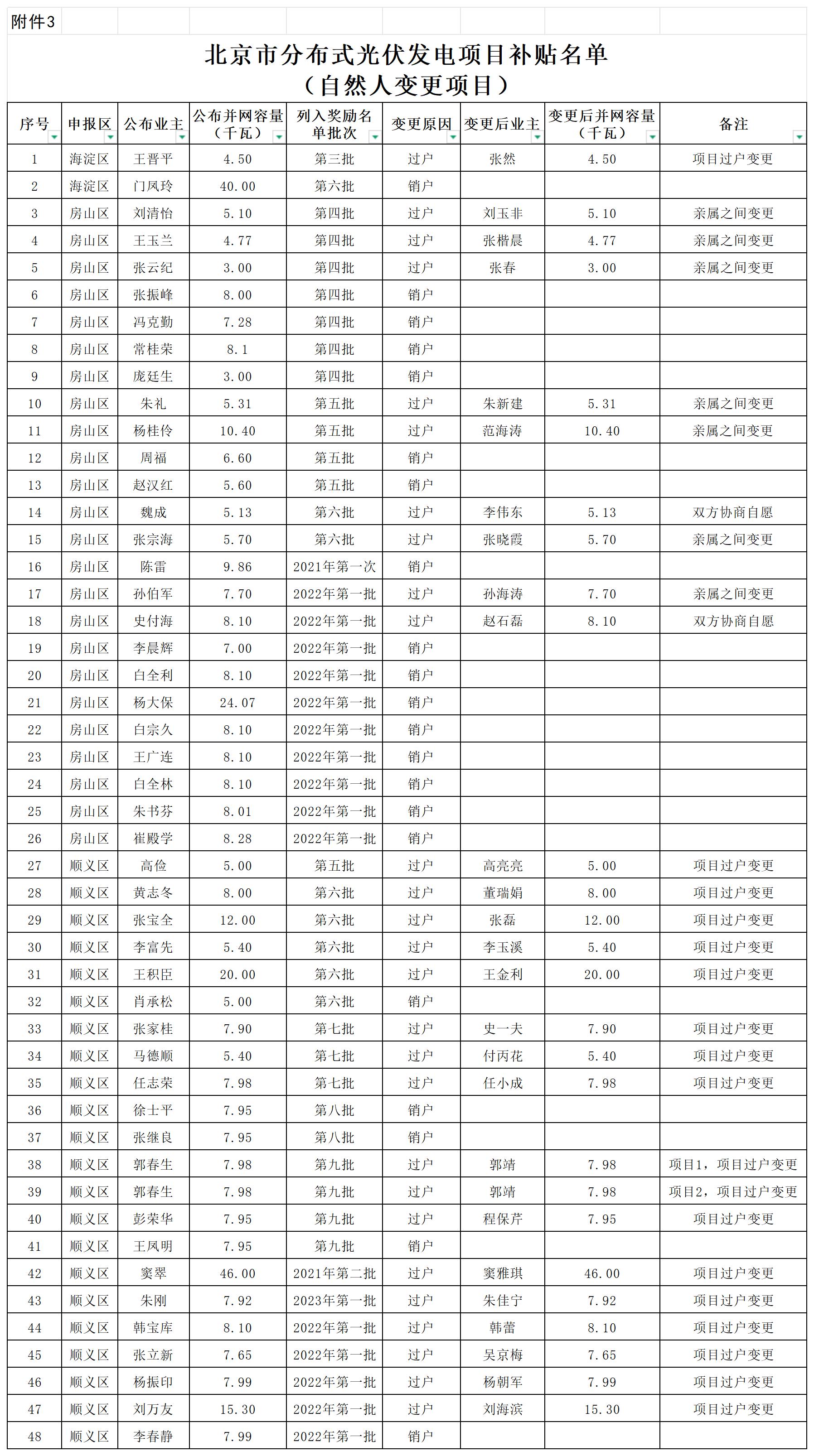 3月24日,北京市發(fā)展和改革委員會(huì)關(guān)于公布北京市分布式光伏發(fā)電項(xiàng)目補(bǔ)貼名單(2025年第一批)的通知。 其中,北京2025年第一批法人單位項(xiàng)目共4個(gè),并網(wǎng)規(guī)模4555.41千瓦,申報(bào)補(bǔ)貼標(biāo)準(zhǔn)為0.03元/千瓦時(shí);北京2025年第一批自然人項(xiàng)目共1634個(gè),申報(bào)補(bǔ)貼標(biāo)準(zhǔn)為0.1元/千瓦時(shí),其中不符合列入補(bǔ)貼名單項(xiàng)目并網(wǎng)規(guī)模合計(jì)1428.19千瓦,原因均為重復(fù)申報(bào);自然人變更項(xiàng)目共48個(gè)。 詳情見(jiàn)下: 各有關(guān)單位: 按照《關(guān)于印發(fā)推進(jìn)光伏發(fā)電高質(zhì)量發(fā)展支持政策的通知》(京發(fā)改規(guī)〔2023〕4號(hào))要求,經(jīng)組織申報(bào)、審核、公示,現(xiàn)公布《北京市分布式光伏發(fā)電項(xiàng)目補(bǔ)貼名單(2025年第一批)》(見(jiàn)附件1、2)。市級(jí)財(cái)政對(duì)以上項(xiàng)目按照用電類(lèi)型給予發(fā)電量補(bǔ)貼,補(bǔ)貼期限為5年。對(duì)于《北京市分布式光伏發(fā)電項(xiàng)目補(bǔ)貼名單(自然人變更項(xiàng)目)》(見(jiàn)附件3)中的項(xiàng)目,國(guó)網(wǎng)北京市電力公司要及時(shí)做好發(fā)電量統(tǒng)計(jì)變更工作。 各區(qū)發(fā)展改革部門(mén)、國(guó)網(wǎng)北京市電力公司要加強(qiáng)對(duì)分布式光伏發(fā)電項(xiàng)目的監(jiān)督管理。對(duì)違反相關(guān)規(guī)定的,將按照《財(cái)政違法行為處罰處分條例》(國(guó)務(wù)院令第427號(hào))等有關(guān)規(guī)定,依法追究有關(guān)單位和人員責(zé)任。 特此通知。 附件:1.北京市分布式光伏發(fā)電項(xiàng)目補(bǔ)貼名單(法人單位項(xiàng)目,2025年第一批) 2.北京市分布式光伏發(fā)電項(xiàng)目補(bǔ)貼名單(自然人項(xiàng)目,2025年第一批)(點(diǎn)擊文件名稱(chēng)跳轉(zhuǎn)) 3.北京市分布式光伏發(fā)電項(xiàng)目補(bǔ)貼名單(自然人變更項(xiàng)目) 北京市發(fā)展和改革委員會(huì) 2025年3月19日