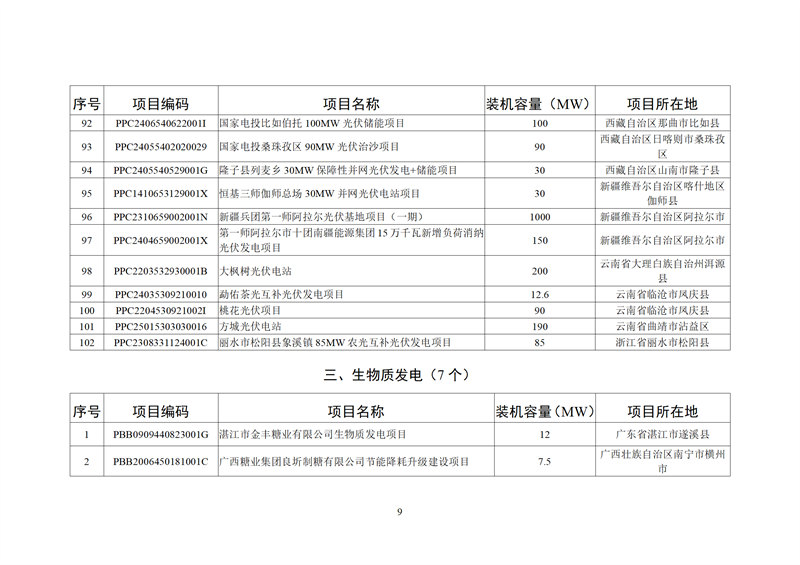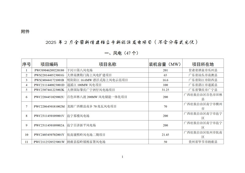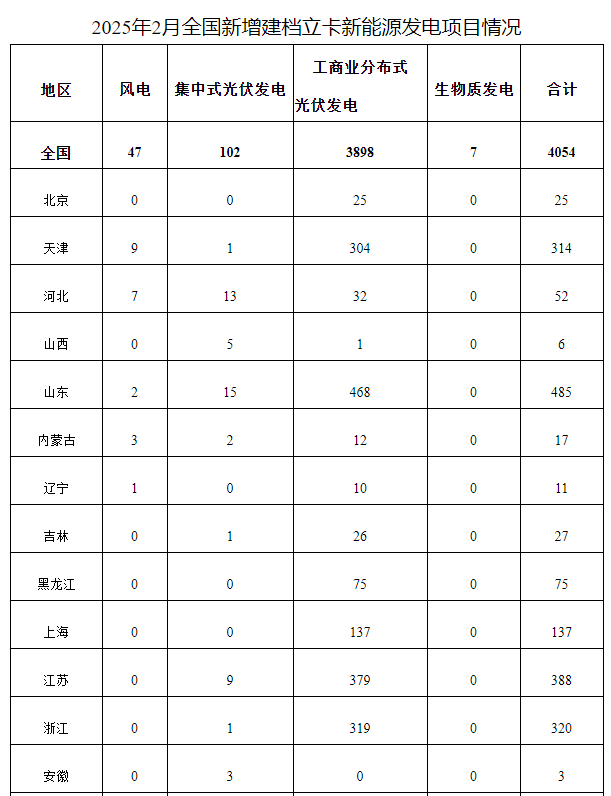 3月31日,國(guó)家能源局發(fā)布關(guān)于2025年2月全國(guó)新增建檔立卡新能源發(fā)電(不含戶用光伏)項(xiàng)目情況的公告。2025年2月,全國(guó)新增建檔立卡新能源發(fā)電(不含戶用光伏)項(xiàng)目共4054個(gè),其中風(fēng)電項(xiàng)目47個(gè),光伏發(fā)電項(xiàng)目4000個(gè)(集中式光伏發(fā)電項(xiàng)目102個(gè),工商業(yè)分布式光伏發(fā)電項(xiàng)目3898個(gè)),生物質(zhì)發(fā)電項(xiàng)目7個(gè)。風(fēng)電、集中式光伏發(fā)電、生物質(zhì)發(fā)電項(xiàng)目清單見附件,工商業(yè)分布式光伏發(fā)電項(xiàng)目清單詳見國(guó)家可再生能源發(fā)電項(xiàng)目信息管理平臺(tái)網(wǎng)站。 詳情如下: