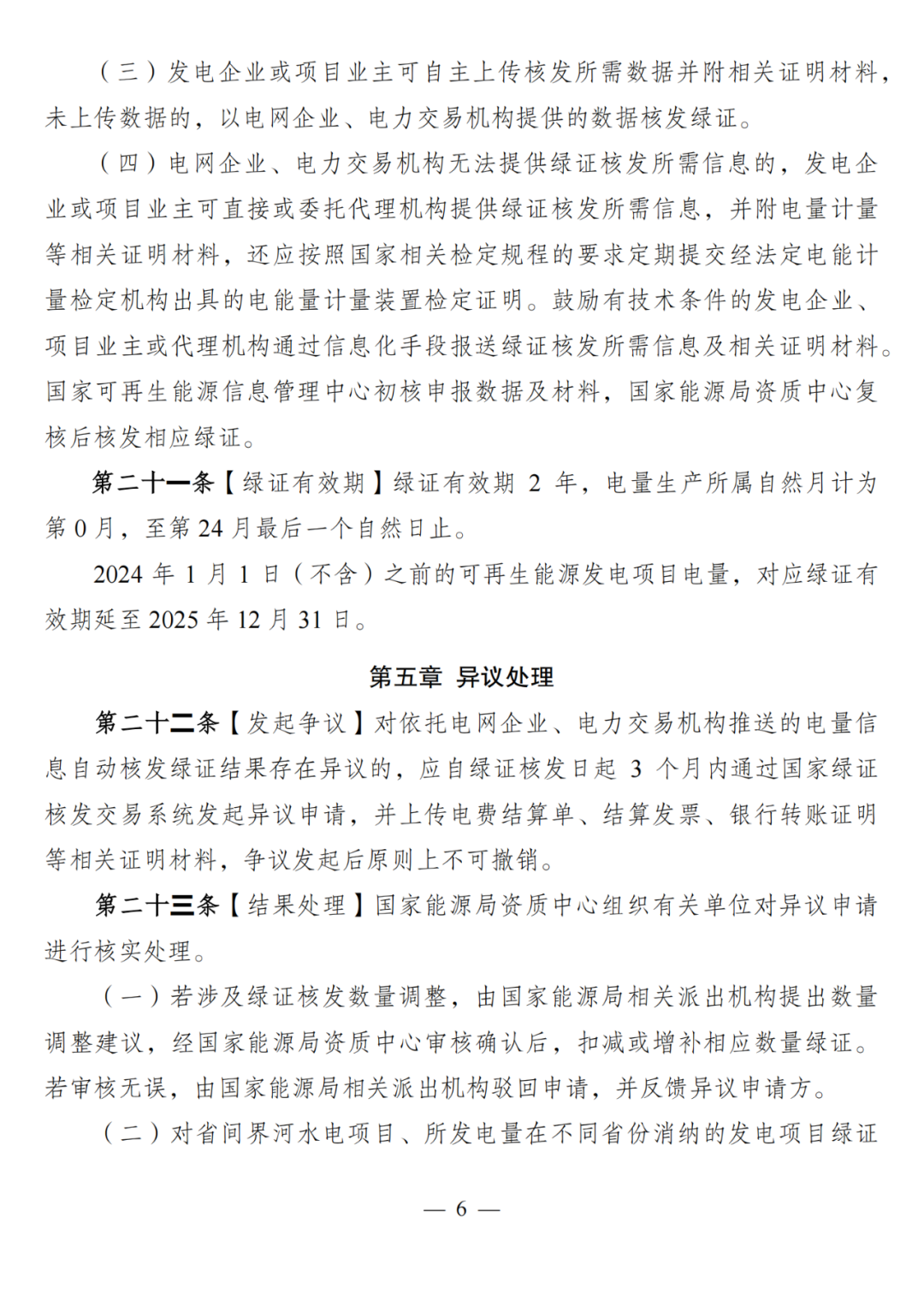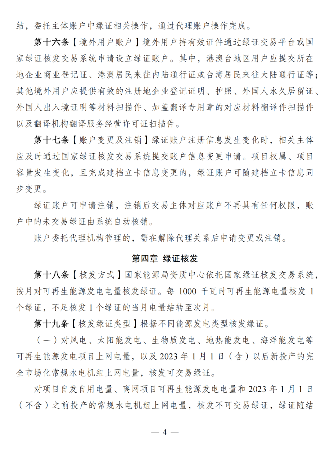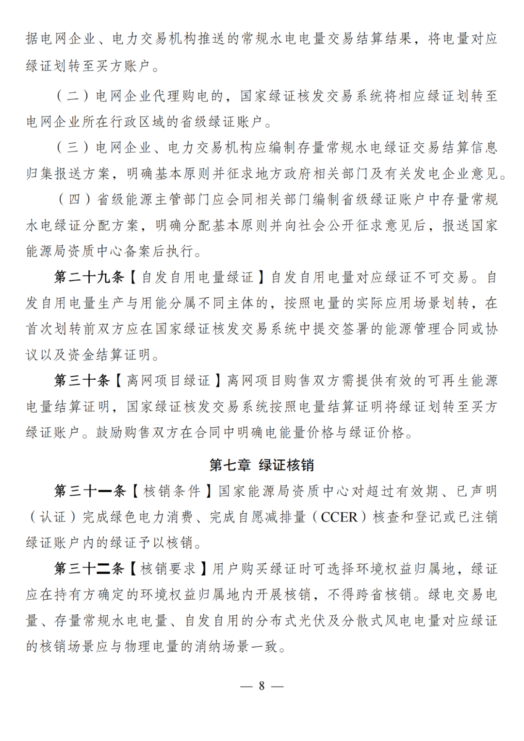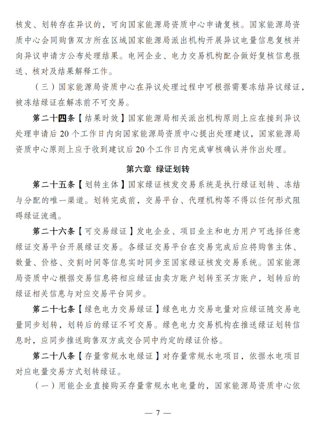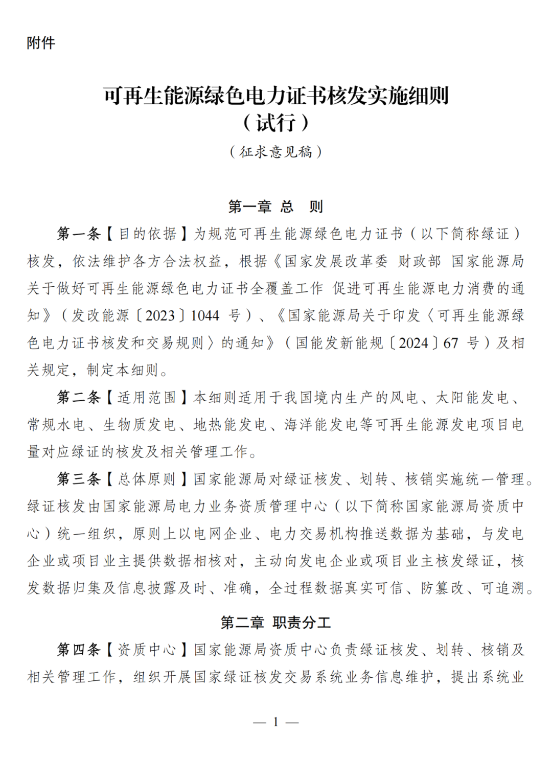 3月31日,國(guó)家能源局發(fā)布關(guān)于征求《可再生能源綠色電力證書(shū)核發(fā)實(shí)施細(xì)則(試行)》(征求意見(jiàn)稿)意見(jiàn)的通知,本細(xì)則適用于我國(guó)境內(nèi)生產(chǎn)的風(fēng)電、太陽(yáng)能發(fā)電、常規(guī)水電、生物質(zhì)發(fā)電、地?zé)崮馨l(fā)電、海洋能發(fā)電等可再生能源發(fā)電項(xiàng)目電量對(duì)應(yīng)綠證的核發(fā)及相關(guān)管理工作。 國(guó)家能源局對(duì)綠證核發(fā)、劃轉(zhuǎn)、核銷(xiāo)實(shí)施統(tǒng)一管理。綠證核發(fā)由國(guó)家能源局電力業(yè)務(wù)資質(zhì)管理中心(以下簡(jiǎn)稱(chēng)國(guó)家能源局資質(zhì)中心)統(tǒng)一組織,原則上以電網(wǎng)企業(yè)、電力交易機(jī)構(gòu)推送數(shù)據(jù)為基礎(chǔ),與發(fā)電企業(yè)或項(xiàng)目業(yè)主提供數(shù)據(jù)相核對(duì),主動(dòng)向發(fā)電企業(yè)或項(xiàng)目業(yè)主核發(fā)綠證,核發(fā)數(shù)據(jù)歸集及信息披露及時(shí)、準(zhǔn)確,全過(guò)程數(shù)據(jù)真實(shí)可信、防篡改、可追溯。 根據(jù)不同能源發(fā)電類(lèi)型核發(fā)綠證: (一)對(duì)風(fēng)電、太陽(yáng)能發(fā)電、生物質(zhì)發(fā)電、地?zé)崮馨l(fā)電、海洋能發(fā)電等可再生能源發(fā)電項(xiàng)目上網(wǎng)電量,以及2023年1月1日(含)以后新投產(chǎn)的完全市場(chǎng)化常規(guī)水電機(jī)組上網(wǎng)電量,核發(fā)可交易綠證。 對(duì)項(xiàng)目自發(fā)自用電量、離網(wǎng)項(xiàng)目可再生能源發(fā)電電量和2023年1月1日(不含)之前投產(chǎn)的常規(guī)水電機(jī)組上網(wǎng)電量,核發(fā)不可交易綠證,綠證隨結(jié)算電量劃轉(zhuǎn)。 常規(guī)水電機(jī)組投產(chǎn)時(shí)間以機(jī)組通過(guò)啟動(dòng)試運(yùn)行為準(zhǔn),同時(shí)擁有2023年1月1日(不含)之前和以后投產(chǎn)機(jī)組的水電項(xiàng)目,應(yīng)在建檔立卡環(huán)節(jié)加以區(qū)分。 (二)對(duì)于源網(wǎng)荷儲(chǔ)、風(fēng)光制氫(氨/醇)、燃煤自備電廠可再生能源替代等包含多種發(fā)電類(lèi)型、儲(chǔ)能裝置的一體化項(xiàng)目,項(xiàng)目業(yè)主應(yīng)委托電網(wǎng)企業(yè)或其他法定計(jì)量檢定機(jī)構(gòu)為其不同的可再生能源發(fā)電設(shè)施單獨(dú)裝表計(jì)量。其中,風(fēng)光制氫(氨/醇)、燃煤自備電廠可再生能源替代項(xiàng)目,可再生能源發(fā)電電量核發(fā)不可交易綠證。 (三)配備儲(chǔ)能設(shè)施的可再生能源發(fā)電項(xiàng)目,儲(chǔ)能設(shè)施放電電量不核發(fā)綠證。項(xiàng)目應(yīng)對(duì)儲(chǔ)能設(shè)施充放電量單獨(dú)計(jì)量,現(xiàn)階段未配置獨(dú)立計(jì)量裝置的,按項(xiàng)目上網(wǎng)電量扣減下網(wǎng)電量的原則核發(fā)綠證。 可參與市場(chǎng)交易的綠證核發(fā)范圍動(dòng)態(tài)調(diào)整。 綠證有效期2年,電量生產(chǎn)所屬自然月計(jì)為第0月,至第24月最后一個(gè)自然日止。2024年1月1日(不含)之前的可再生能源發(fā)電項(xiàng)目電量,對(duì)應(yīng)綠證有效期延至2025年12月31日。 原文見(jiàn)下: 國(guó)家能源局綜合司關(guān)于征求《可再生能源綠色電力證書(shū)核發(fā)實(shí)施細(xì)則(試行)》(征求意見(jiàn)稿)意見(jiàn)的通知 為規(guī)范綠證核發(fā)與管理相關(guān)工作,依據(jù)《可再生能源綠色電力證書(shū)核發(fā)和交易規(guī)則》(國(guó)能發(fā)新能規(guī)〔2024〕67號(hào)),我局研究起草了《可再生能源綠色電力證書(shū)核發(fā)實(shí)施細(xì)則(試行)》(征求意見(jiàn)稿),現(xiàn)向社會(huì)公開(kāi)征求意見(jiàn)。 歡迎有關(guān)單位和社會(huì)各界人士在2025年4月30日前,將意見(jiàn)建議以電子郵件形式發(fā)送至zhangty@nea.gov.cn。 感謝您的參與和支持! 附件:《可再生能源綠色電力證書(shū)核發(fā)實(shí)施細(xì)則(試行)》(征求意見(jiàn)稿) 國(guó)家能源局綜合司 2025年3月26日