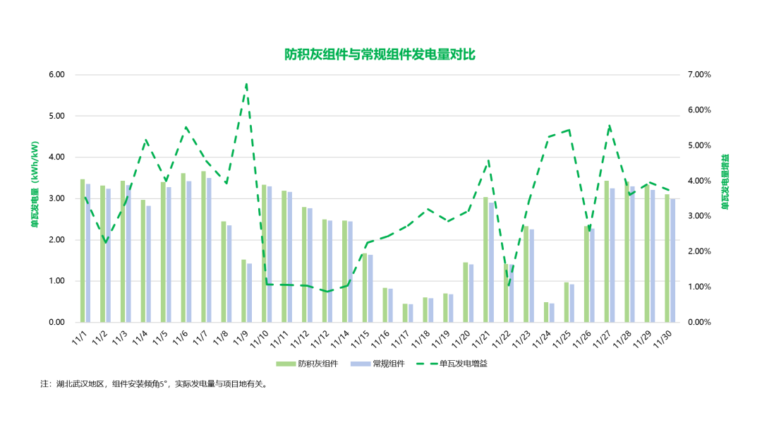 光伏玻璃表面的灰塵如同“灰色面紗”,不僅會嚴(yán)重影響太陽輻射透射率,還會在組件表面產(chǎn)生漫反射,影響透光率,導(dǎo)致發(fā)電效率衰減。當(dāng)組件表面積灰量達(dá)2-8g/㎡時,光伏電池相對效率降幅可達(dá)5%-25%。更嚴(yán)重的是,積灰引發(fā)的局部熱斑效應(yīng)和組件老化問題,將直接影響電站安全運行與設(shè)備使用壽命。 防積灰設(shè)計的“秘訣”在于其邊框設(shè)計。正泰新能高效防積灰組件采用全新短邊防積灰設(shè)計,通過短邊A面優(yōu)化,讓灰塵更易隨雨水沖刷掉落,有效減少組件底部積灰實現(xiàn)自然降水條件下的“動態(tài)自清潔”。憑借著高效自潔、低頻清洗、發(fā)電增益三大優(yōu)勢,正泰新能高效防積灰組件大大降低運維清潔成本,兼?zhèn)涓呖煽啃耘c安裝便利性。 武漢項目數(shù)據(jù)顯示,相較于常規(guī)組件正泰新能高效防積灰組件日均發(fā)電增益達(dá)3.33%,最高單日增益突破6.74%,充分證實防積灰組件較常規(guī)邊框組件具有更優(yōu)的發(fā)電增益。