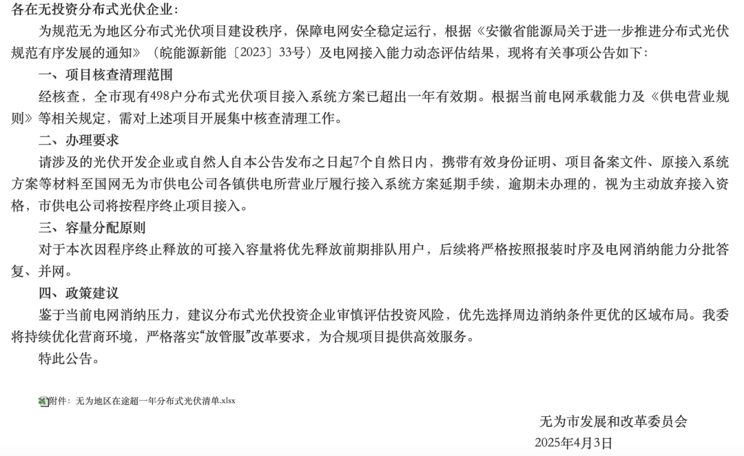 4月1日,安徽省無(wú)為市發(fā)改委發(fā)布關(guān)于集中核查清理無(wú)為地區(qū)在途超一年光伏項(xiàng)目的公告,涉及498個(gè)戶(hù)用光伏項(xiàng)目。 公告表示,根據(jù)《安徽省能源局關(guān)于進(jìn)一步推進(jìn)分布式光伏規(guī)范有序發(fā)展的通知》(皖能源新能〔2023〕33號(hào))及電網(wǎng)接入能力動(dòng)態(tài)評(píng)估結(jié)果,全市現(xiàn)有498戶(hù)分布式光伏項(xiàng)目接入系統(tǒng)方案已超出一年有效期。根據(jù)當(dāng)前電網(wǎng)承載能力及《供電營(yíng)業(yè)規(guī)則》等相關(guān)規(guī)定,需對(duì)上述項(xiàng)目開(kāi)展集中核查清理工作。 公告要求,涉及的光伏開(kāi)發(fā)企業(yè)或自然人自本公告發(fā)布之日起7個(gè)自然日內(nèi),攜帶有效身份證明、項(xiàng)目備案文件、原接入系統(tǒng)方案等材料至國(guó)網(wǎng)無(wú)為市供電公司各鎮(zhèn)供電所營(yíng)業(yè)廳履行接入系統(tǒng)方案延期手續(xù),逾期未辦理的,視為主動(dòng)放棄接入資格,市供電公司將按程序終止項(xiàng)目接入。 原文見(jiàn)下(具體項(xiàng)目可點(diǎn)擊下方原文鏈接):