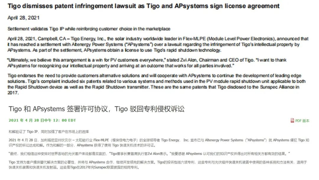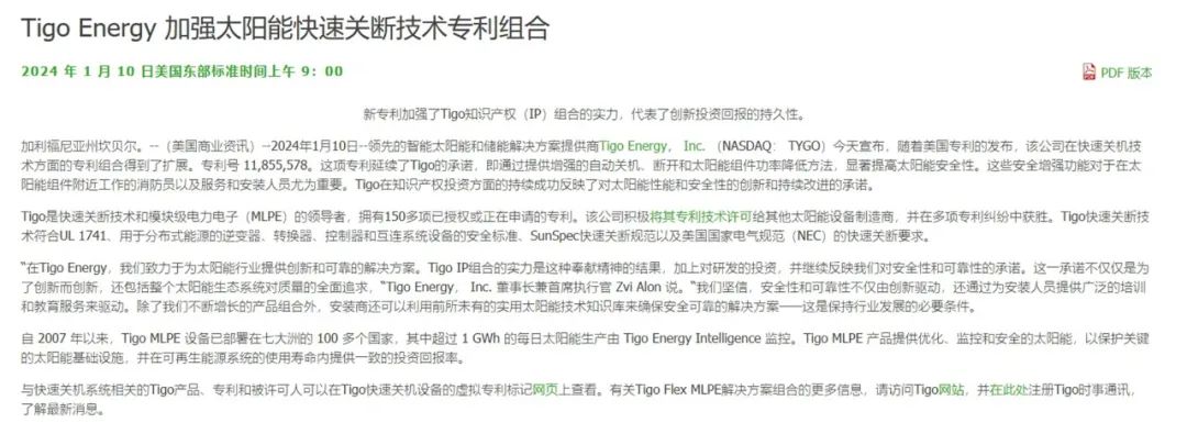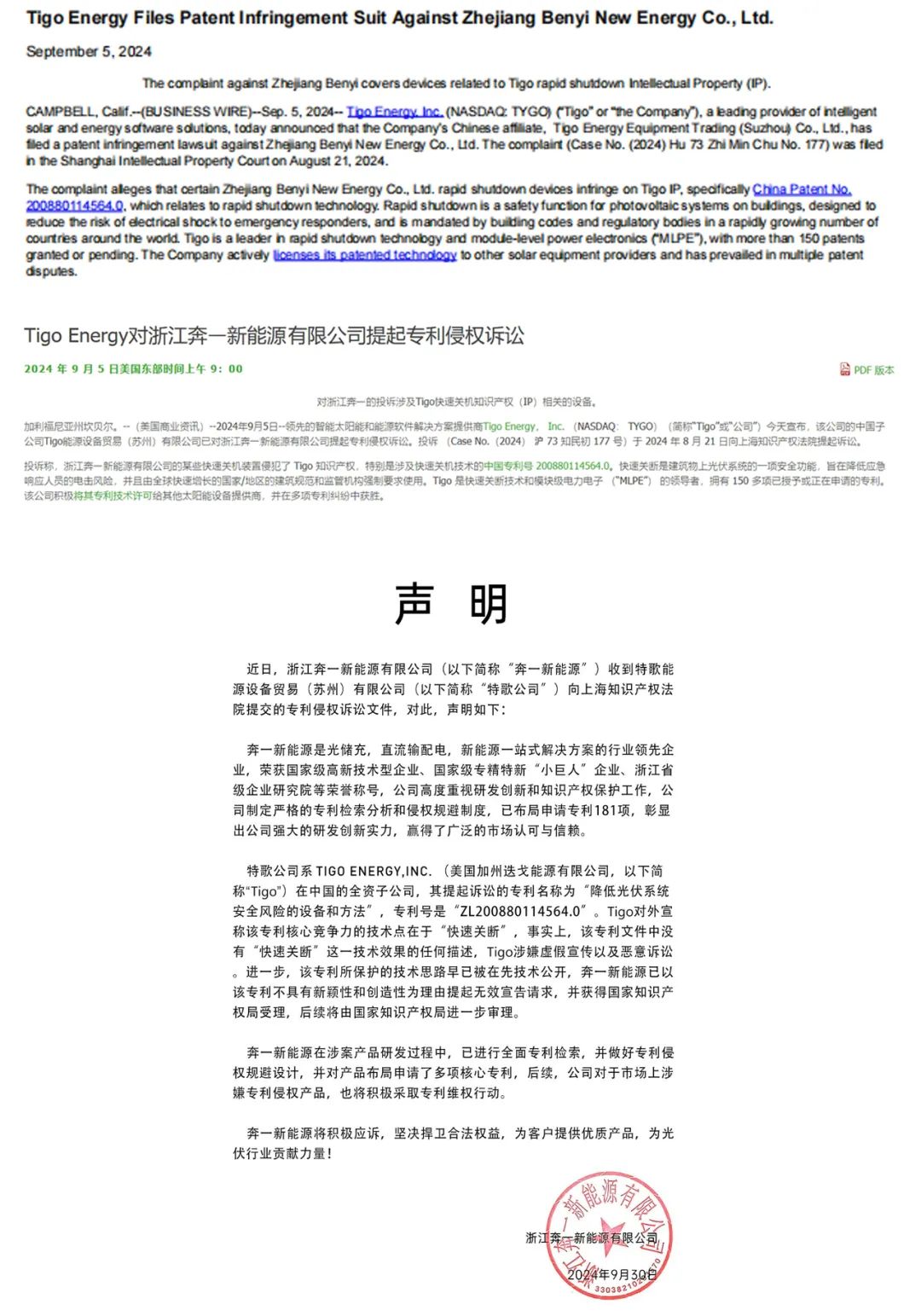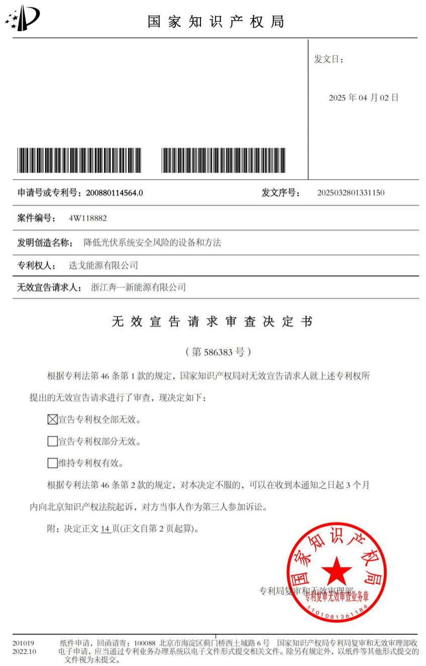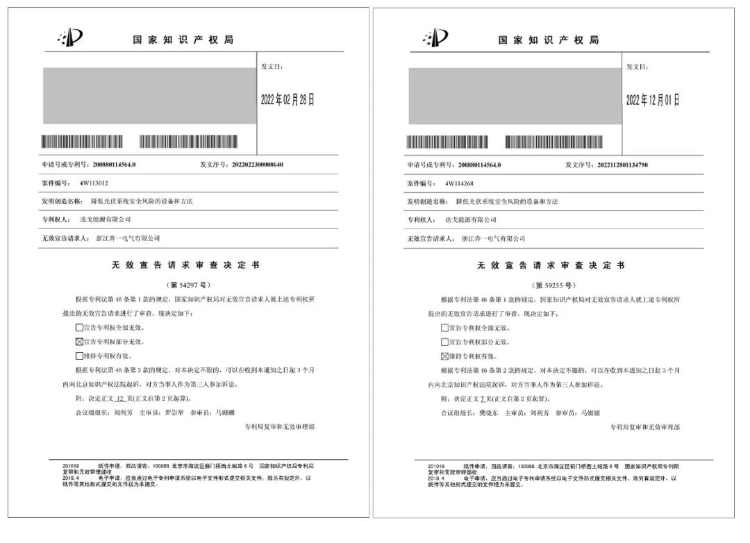 長期以來,美國利用專利訴訟作為外交策略的一部分,頻繁對中國高新科技企業(yè)施加壓力,這一行為已成為其對華策略中的常態(tài)。在中國知識產(chǎn)權(quán)研究會與國家海外知識產(chǎn)權(quán)糾紛應(yīng)對指導(dǎo)中心聯(lián)合發(fā)布的《2024中國企業(yè)海外知識產(chǎn)權(quán)糾紛調(diào)查》報告中顯示,中國企業(yè)海外專利訴訟近九成集中在美國,而中國企業(yè)在美國專利訴訟中作為被告的數(shù)量占比高達90%,中國企業(yè)勝訴比例極低,和解撤案占主導(dǎo)。在這龐大的數(shù)量上,中國企業(yè)在美國專利訴訟中平均判賠為2371.72萬美元。 自中國新能源產(chǎn)業(yè)在國際舞臺上嶄露頭角開始,中美新能源企業(yè)在專利領(lǐng)域的競爭愈發(fā)激烈,多起重大訴訟案件引發(fā)了行業(yè)的廣泛關(guān)注。2025年2月26日,F(xiàn)irst Solar, Inc.,在美國特拉華州地方法院起訴晶科能源及其關(guān)聯(lián)公司,指控其侵犯了美國第9,130,074號專利,該專利涵蓋隧道氧化層鈍化接觸(TOPCon)晶體硅光伏電池的制造方法。此外,2024年10月,F(xiàn)irst Solar, Inc.,還向晶科、隆基、天合、阿特斯等光伏巨頭發(fā)起TOPCon專利訴訟,指控其侵犯了其TOPCon晶體硅光伏技術(shù)專利。這些案件不僅反映了行業(yè)內(nèi)的激烈競爭,也凸顯了知識產(chǎn)權(quán)保護在技術(shù)創(chuàng)新中的重要性。 2024年8月21日,全球太陽能行業(yè)迎來了一場備受矚目的專利較量??偛课挥诿绹韫鹊募{斯達克上市公司Tigo Energy, Inc.,(迭戈能源有限公司,股票代碼:TYGO.US,以下簡稱“Tigo”),Tigo發(fā)布上市公司通告:其中國子公司特歌能源設(shè)備貿(mào)易(蘇州)有限公司,向上海知識產(chǎn)權(quán)法院對浙江奔一新能源有限公司(以下簡稱“奔一公司”)提起專利侵權(quán)訴訟(案號:(2024)滬73知民初177號),指控奔一公司侵犯了其快速關(guān)斷技術(shù)專利(中國專利號ZL200880114564.0)。該專利涉及一種用于光伏面板系統(tǒng)的快速關(guān)斷模組,其通過接收遠程單元發(fā)射的周期性信號來控制開關(guān),從而在對光伏面板進行指定操作時(例如安裝光伏面板時)能夠方便控制光伏面板與系統(tǒng)之間的鏈接,以防止光伏面板產(chǎn)生高電壓危害到施工人員和光伏面板系統(tǒng)中的其他電路元器件的安全。 Tigo與SMA之間的激烈較量,最終以Tigo的勝訴徹底畫上句號。這場勝利不僅捍衛(wèi)了Tigo在知識產(chǎn)權(quán)領(lǐng)域的核心權(quán)益,更顯著鞏固了其在行業(yè)中的領(lǐng)導(dǎo)地位,彰顯了其在技術(shù)創(chuàng)新與法律保護方面的強大實力。 Tigo與Sunspec聯(lián)盟的專利訴訟案件在美國專利局經(jīng)歷了重要裁決。美國專利局完全駁回了Sunspec聯(lián)盟對Tigo美國專利有效性提出的質(zhì)疑。目前,特歌與Sunspec聯(lián)盟的專利訴訟案件仍在進行中。 Tigo與中國科創(chuàng)板上市企業(yè)APsystems(昱能科技,股票代碼:688348.SH)之間的知識產(chǎn)權(quán)訴訟最終達成了和解。作為和解協(xié)議的一部分,APsystems通過支付專利授權(quán)費的方式獲得了使用Tigo快速關(guān)斷技術(shù)的許可。 Tigo在專利保護方面的強硬態(tài)度引發(fā)了行業(yè)的廣泛關(guān)注。然而,Tigo的專利封鎖并非堅不可摧。近日一則消息震驚了整個行業(yè)——中國新能源企業(yè)浙江奔一新能源有限公司在與Tigo的專利無效請求中取得重大勝利,這一事件標志著中國企業(yè)在對決全球巨頭專利戰(zhàn)場上的一次重要突破。同時也暴露了Tigo專利體系的弱點,尤其是在面對技術(shù)實力雄厚的中國企業(yè)時。 事實上,早在2021年,奔一公司的工程師在研發(fā)新產(chǎn)品時檢索全球?qū)@?,發(fā)現(xiàn)新產(chǎn)品BFS系列快速關(guān)斷的核心功能被美國一家上市公司惡意注冊專利,此項專利的封鎖導(dǎo)致新產(chǎn)品重要創(chuàng)新點無法實現(xiàn),工程師立即向公司領(lǐng)導(dǎo)請示,在組織會議后,奔一工程師團及管理層做出決定:對專利進行無效宣告申請,并繼續(xù)推進研發(fā)創(chuàng)新。 近幾年奔一工程師團隊不斷對專利發(fā)起挑戰(zhàn),先后兩次進入無效審理程序并取得部分無效的成績。期間,奔一快速關(guān)斷產(chǎn)品因為其創(chuàng)新的功能和穩(wěn)定的質(zhì)量,迅速打開了歐美市場,突破了Tigo公司在全球太陽能MLPE安全領(lǐng)域一家獨大的局面。Tigo公司是新能源業(yè)界著名的專利訴訟常勝將軍。這一次,Tigo又用起了他們最擅長的專利訴訟戰(zhàn)。而面對Tigo的強勢起訴,奔一新能源并未退縮,于2024年末再次向Tigo發(fā)起強有力的挑戰(zhàn)。經(jīng)過4年的多輪法律程序,奔一公司憑借扎實的技術(shù)積累和嚴謹?shù)姆刹呗裕罱K取得這一專利無效請求的勝利。這一結(jié)果不僅打破了Tigo在中國市場的專利壁壘,并為中國新能源企業(yè)節(jié)約了大量的專利授權(quán)費用,也為全球太陽能行業(yè)的公平競爭注入了新的活力。 浙江奔一新能源有限公司是國家級重點專精特新小巨人企業(yè),奔一公司以實際行動彰顯了中國企業(yè)在技術(shù)創(chuàng)新和法律應(yīng)對上的強大實力,展現(xiàn)了中國新能源企業(yè)的亮劍精神,印證了中國新能源行業(yè)在全球舞臺上的崛起。 浙江奔一新能源與國家電投全球最大光伏電站集群項目案例 在全球能源轉(zhuǎn)型