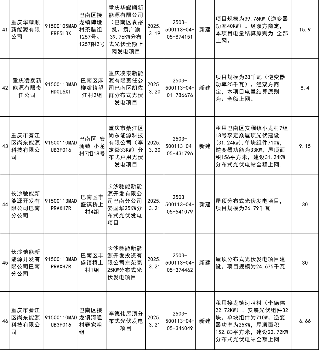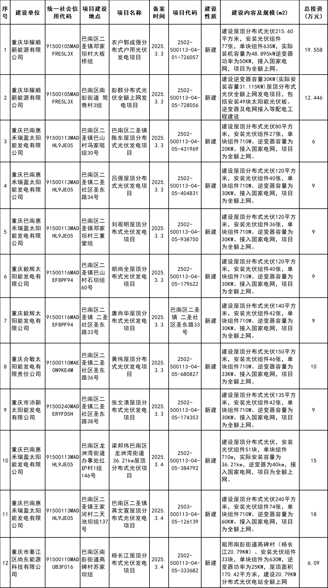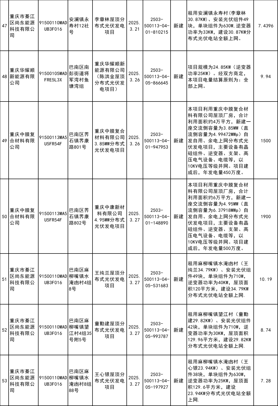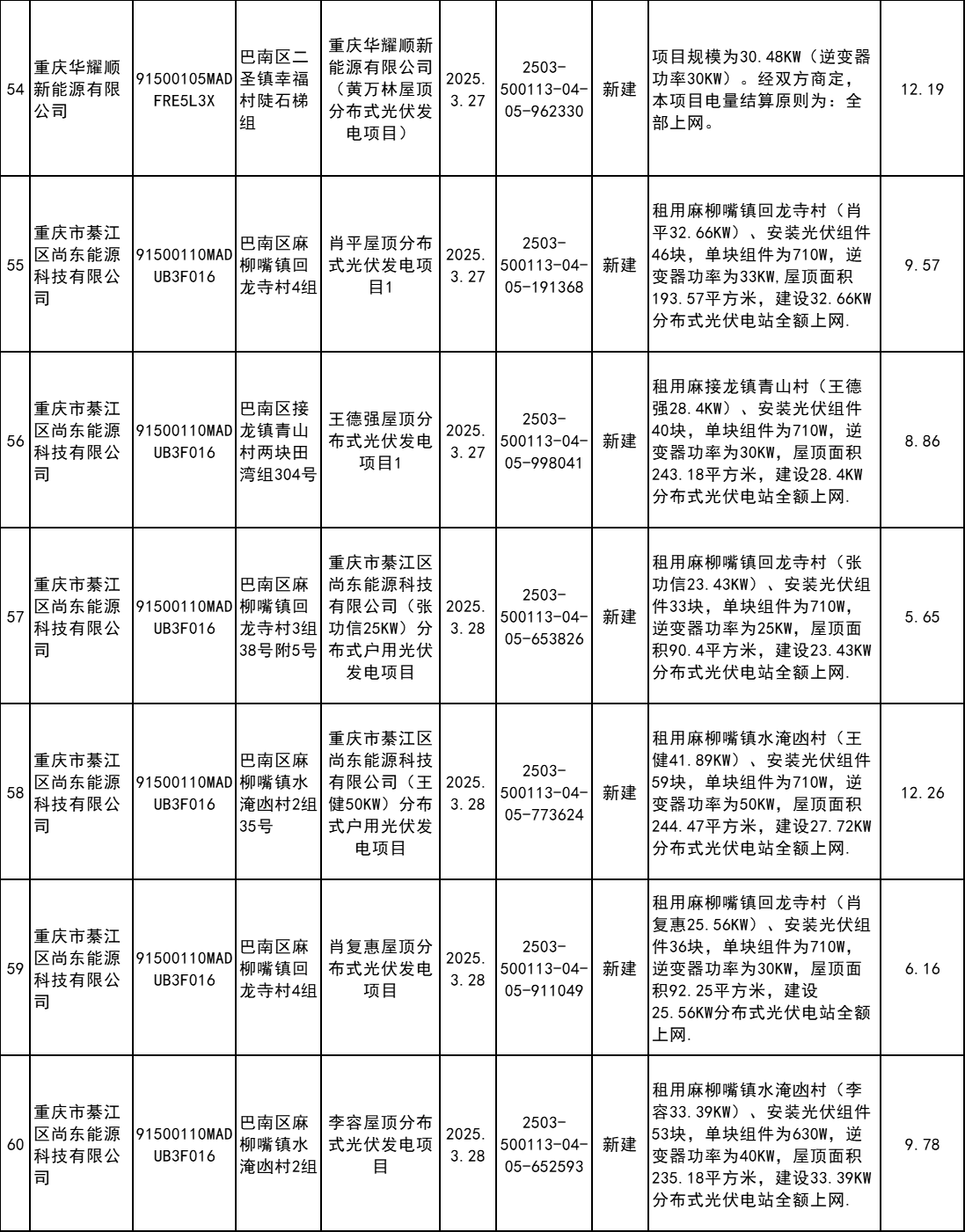 4月7日,重慶市巴南區(qū)發(fā)改委發(fā)布2025年企業(yè)投資項(xiàng)目備案統(tǒng)計(jì)表(3月)。根據(jù)公示信息,3月巴南區(qū)共計(jì)備案60個(gè)分布式光伏項(xiàng)目。